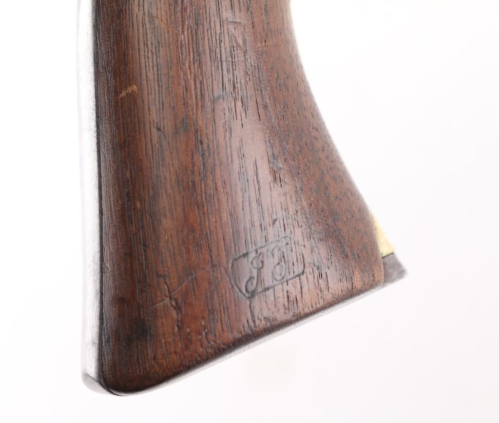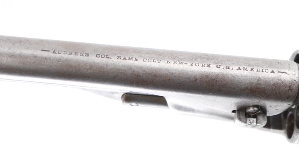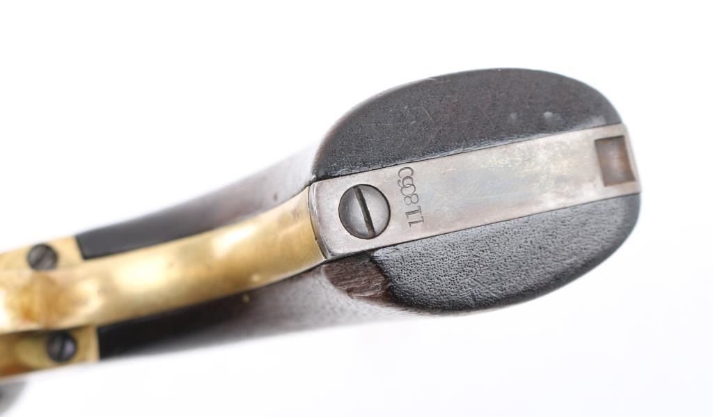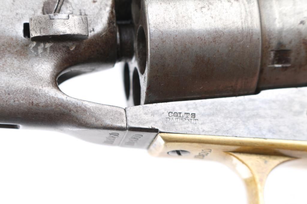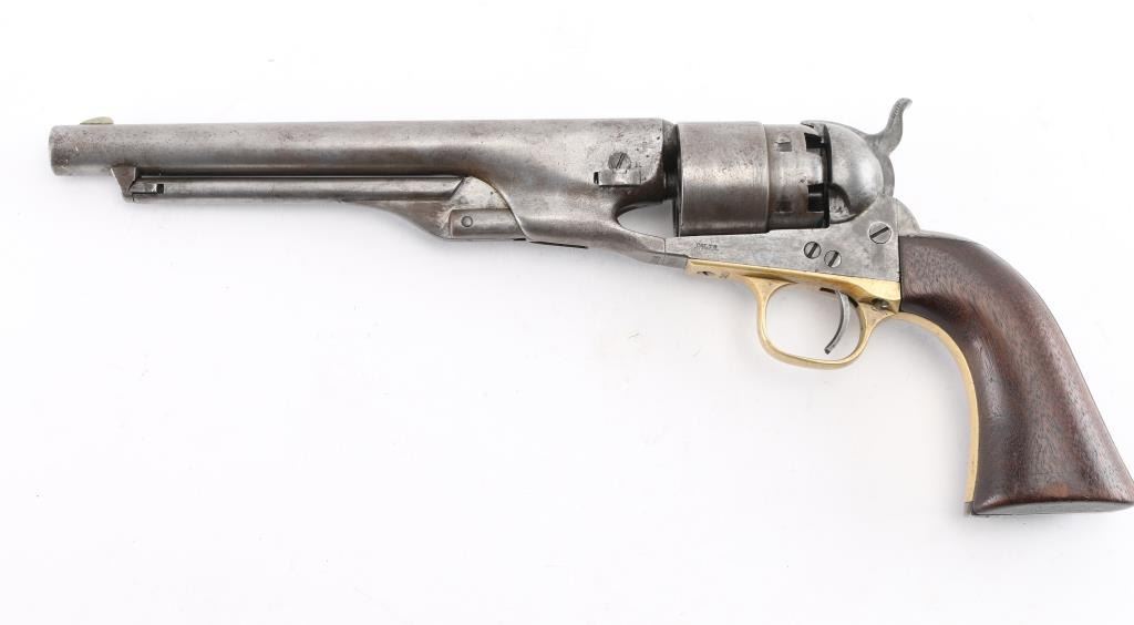 Martially marked & inspected single action percussion revolver issued to the Union Army during the American Civil War, manufactured circa 1863. Features an 8" round barrel, German silver blade front sight, 'v' notch rear sight cut into the hammer lip, smooth thin trigger, knurled hammer spur, non-fluted six shot cylinder with roll stamped Naval Engagement scene, loading lever, round brass trigger guard, steel backstrap, shoulder stock cuts in the recoil shield & butt and one-piece oil finished smooth walnut grip with boxed "JT" cartouches for Jerome Towne (1862-63). All observed serial numbers match including the cylinder, frame, trigger guard and backstrap. Inspector marks include: Barrel - "H" & "E". Cylinder - "H" & "E". Trigger guard - "T". & Backstrap - "T". One line New York barrel address Revolver displays a mottled aged grey/brown patina with the cylinder scene mostly gone. Revolver is mechanically excellent. The bore shows strong rifling & scattered light pitting, the remaining markings are crisp/clear, and the walnut grip is very good with no cracks or chips. An early revolver made in the third year of the war. Condition is NRA Very Good. Antique Firearm.