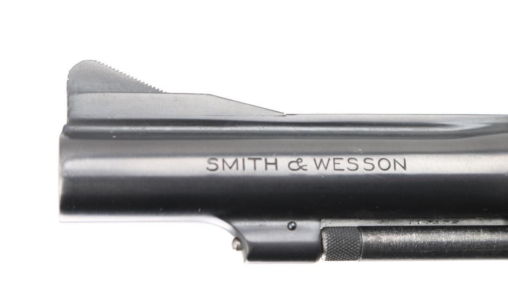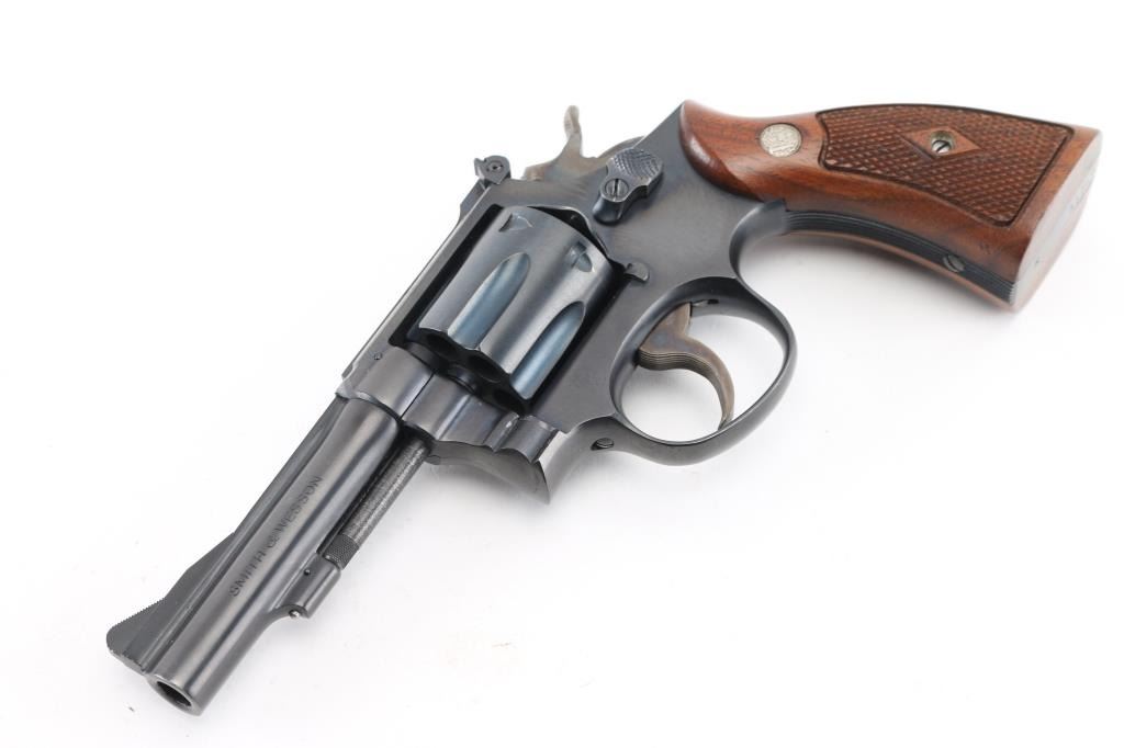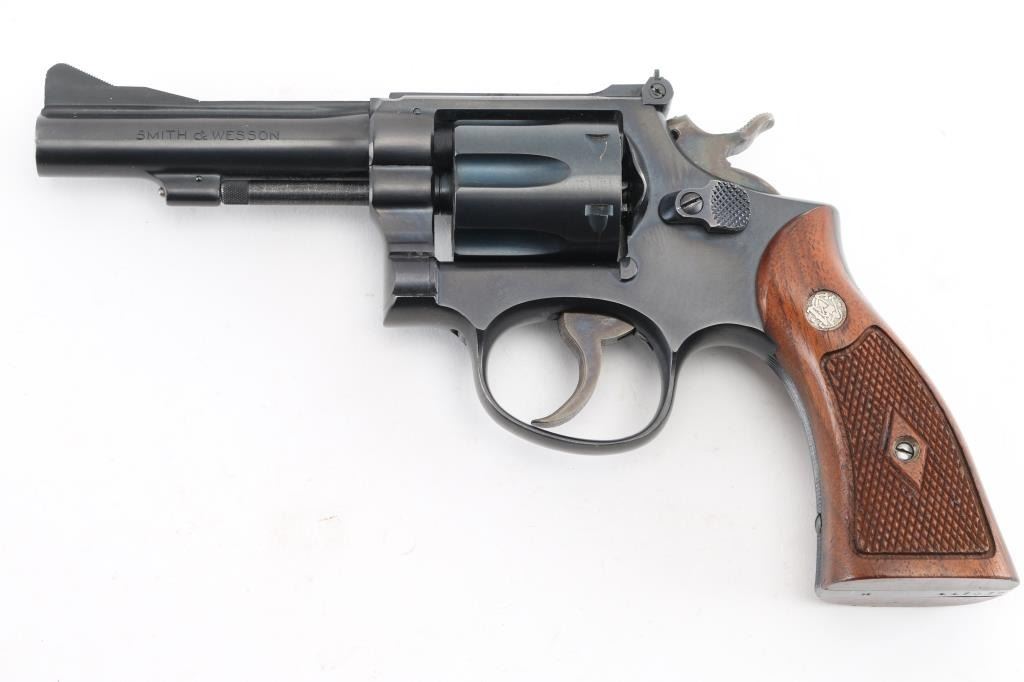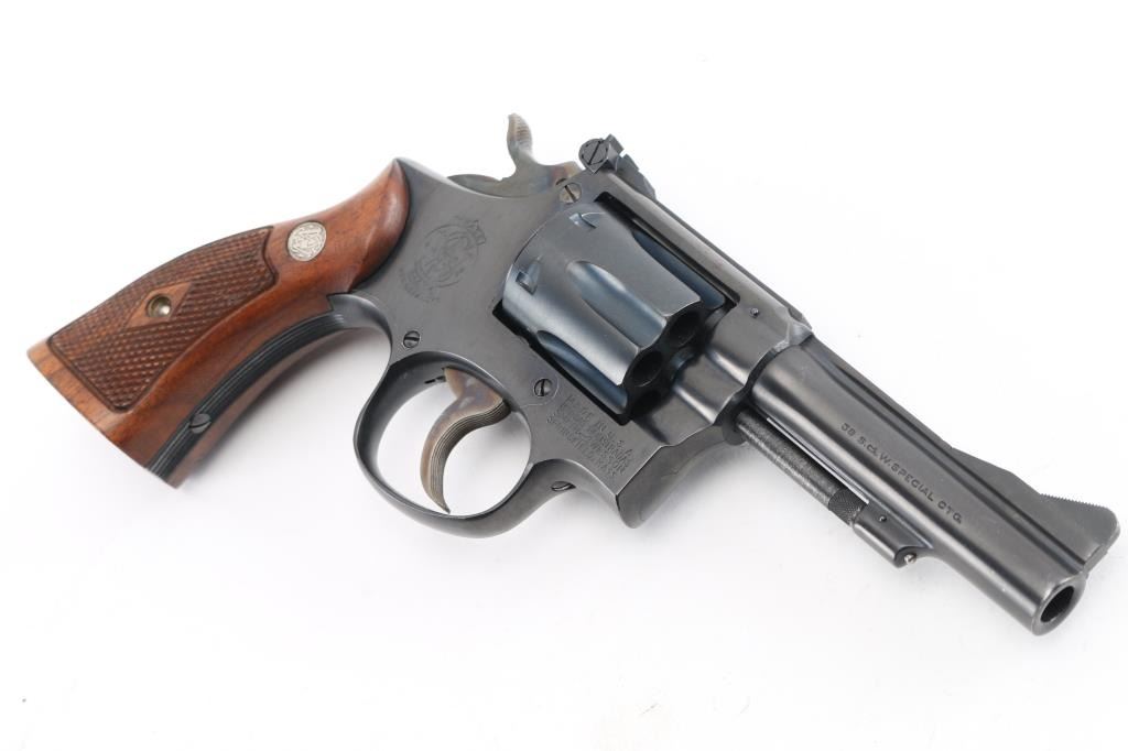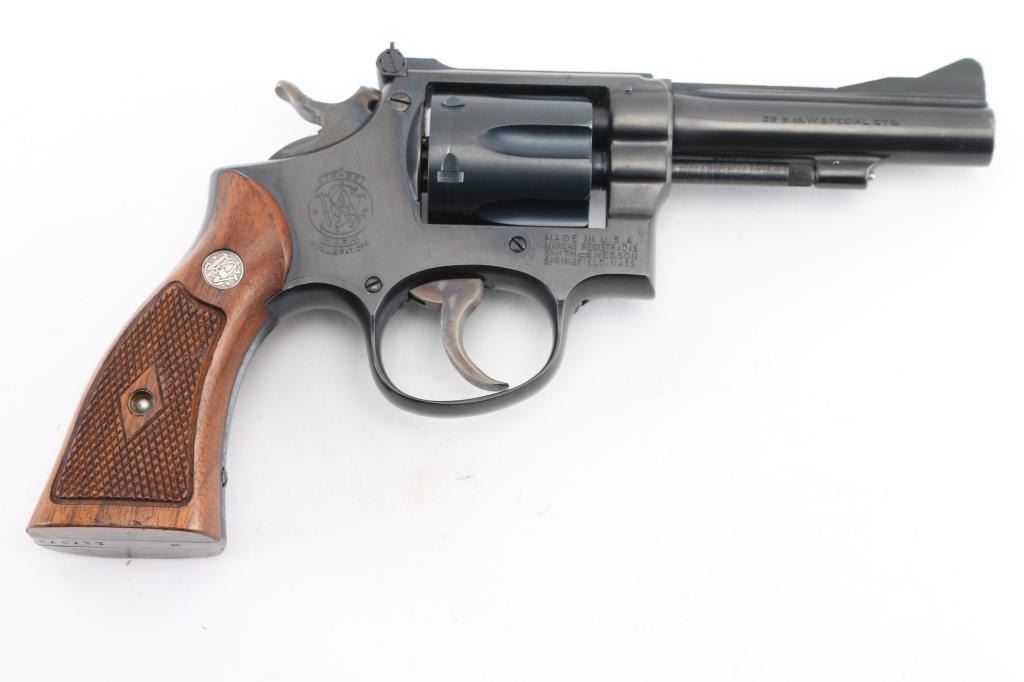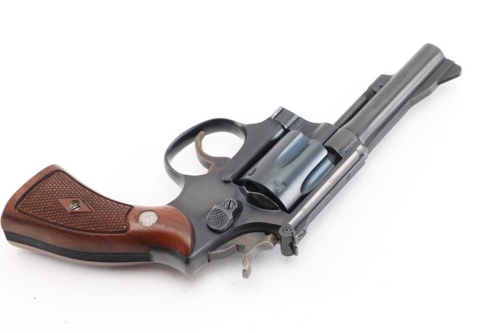 'The K-38 Combat Masterpiece' Medium frame double/single action revolver circa 1951, chambered for 38 Special cartridges. Features blued finish, checkered wood Magna style grips with S&W medallions, pinned 4" barrel, adjustable sights with serrated ramp front sight, grooved trigger, knurled spur hammer, Five Screw square butt K frame. Bore and cylinder charge holes are very good. Retains 95% finish with handling marks, edge wear, some pinpricks on top strap. Grips are very good condition. Action is smooth, lock-up is tight. Numbers match where observed. Condition is NRA Very Good++ *** C&R Firearm ***