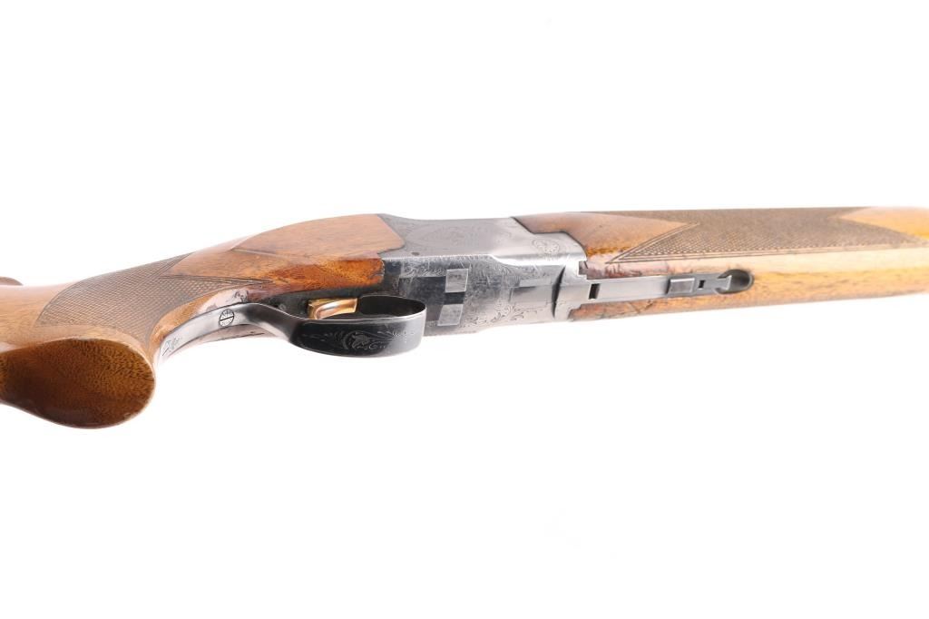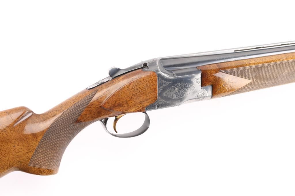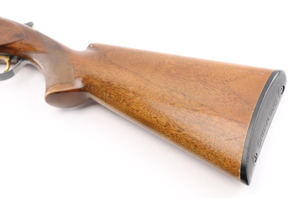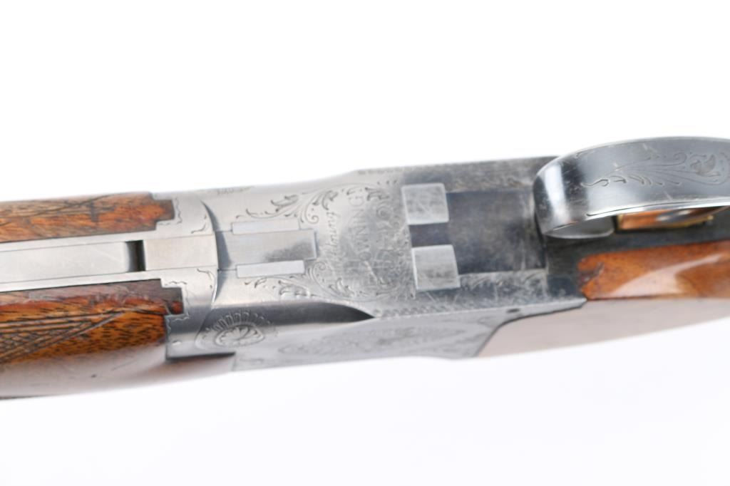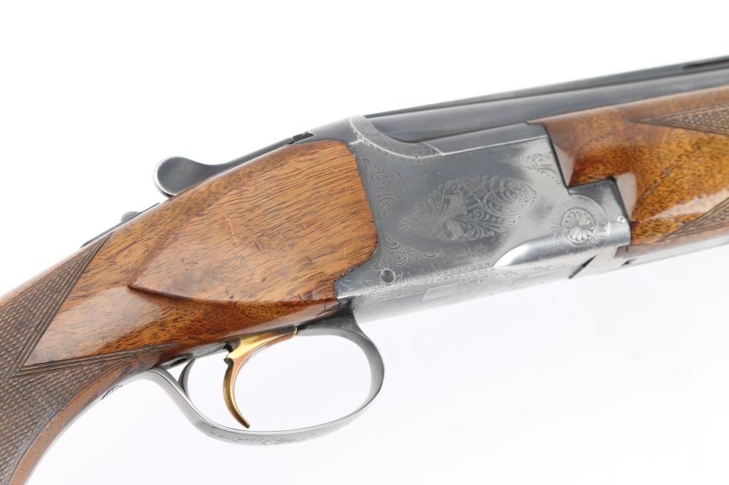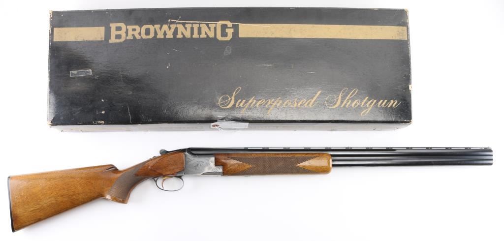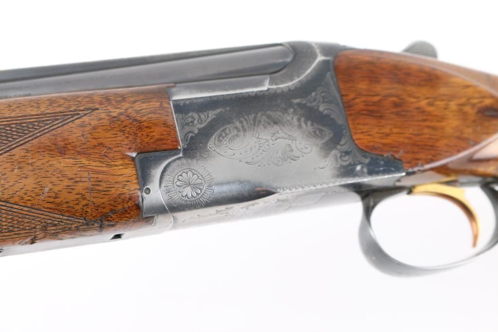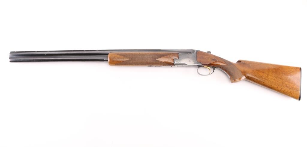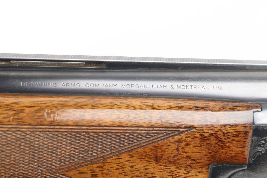 SN: 17013S73, Belgian Over / Under shotgun imported by Browning Arms Co, Morgan Utah & Montreal, circa 1973. 2 3/4" chamber. Features blued finish, gloss finished walnut stocks, factory buttplate, checkered panels at wrist & forend, 28" fixed choke barrels (Cyl over Im), single selective inertia trigger, barrel selection at tang safety, steel bead front & mid sights. Action displays limited scroll motif engraving. 14" LOP. Bores are excellent condition. Retains70% blue with handling wear, mostly on the bottom of receiver, edge losses. Slight loss of gold accent color from trigger face. Wood is good/sound overall with few dings and dents from handling, some finish loss on the grip. Comes with original factory box with matching label. (label in box) Condition is NRA Good. C&R Firearm.