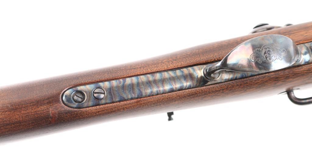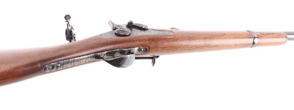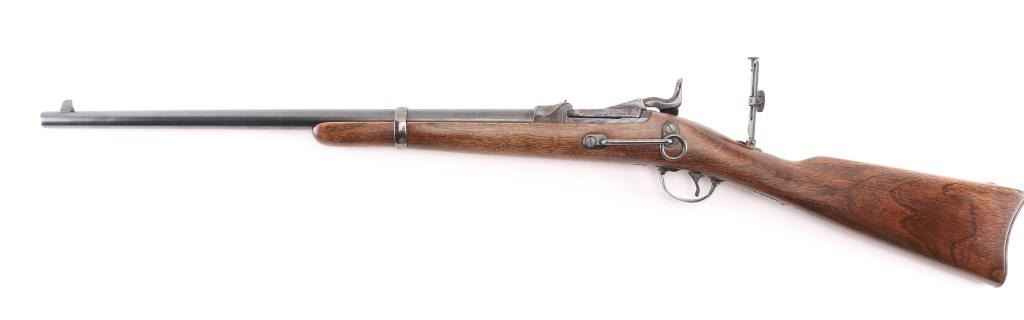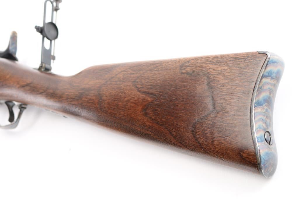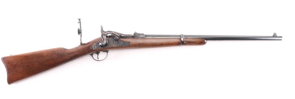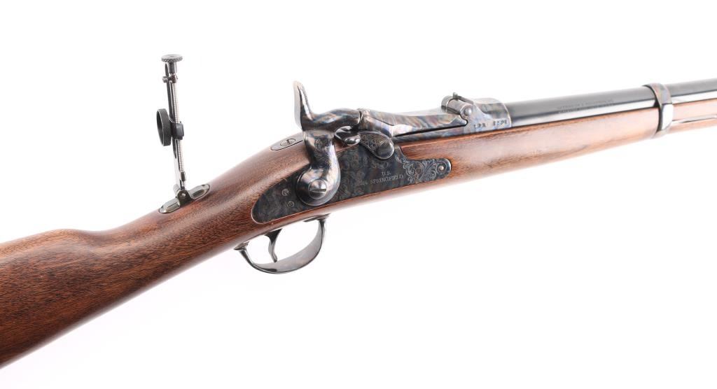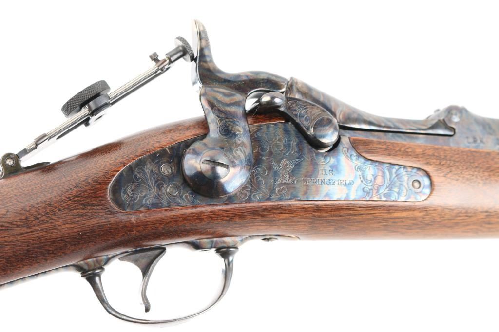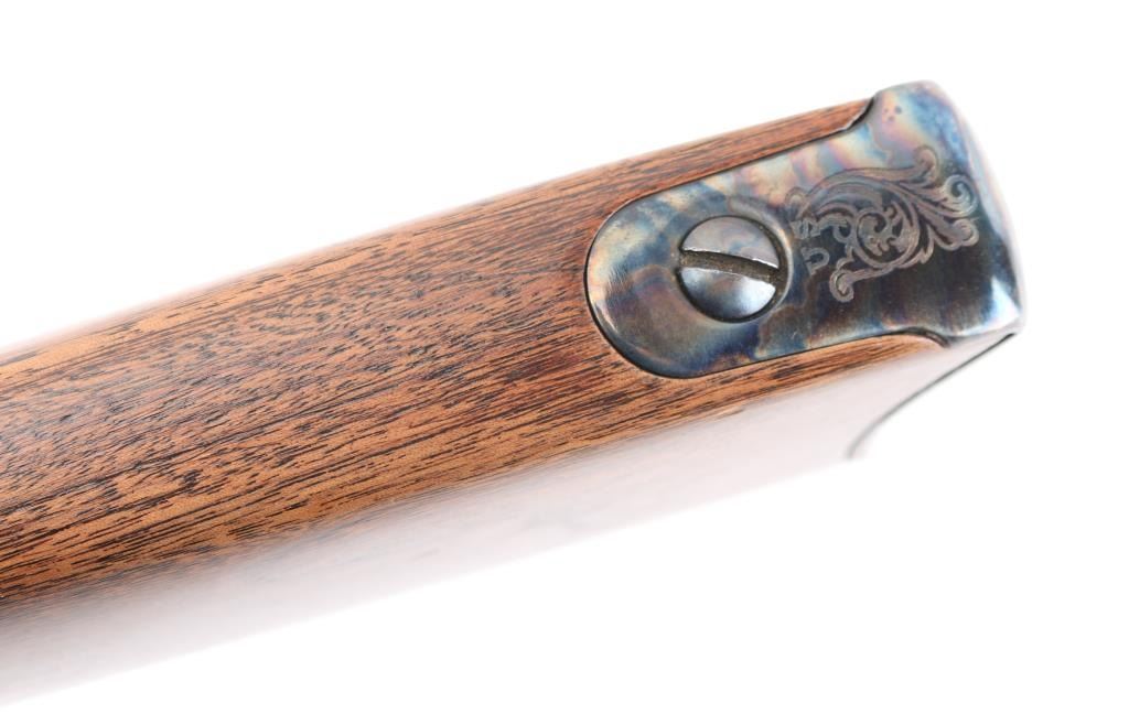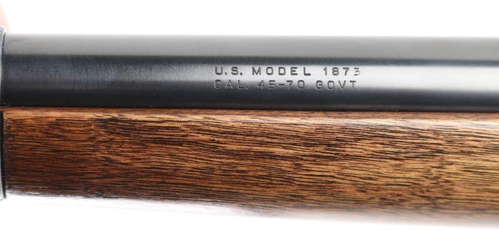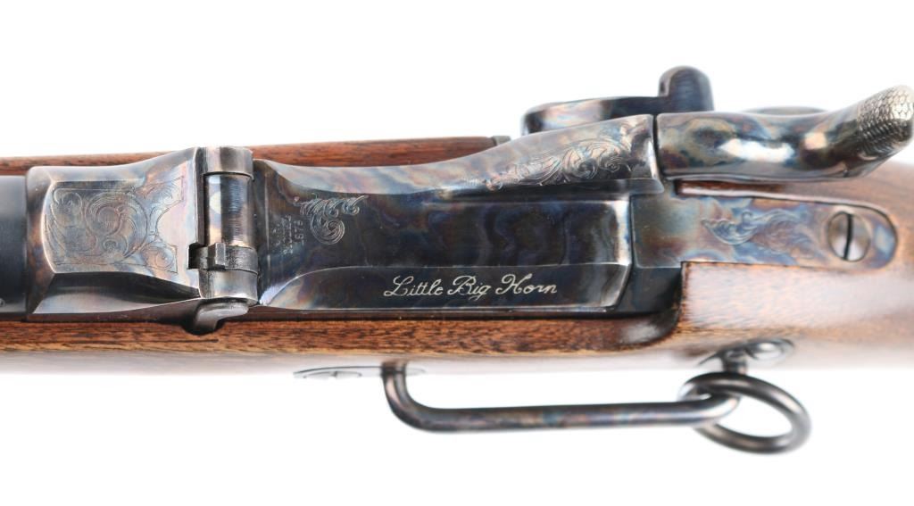 SN: LBH1591. Harrington & Richardson 1873 model 45-70 gov't caliber carbine, made to commemorate the battle of the "Little Big Horn". It's the Springfield 1873 Carbine reproduced in the 1972-86, 5000 produced, with scroll engraving on the action, trigger guard barrel band etc.22": blue barrel. It has all of the Engraved parts Color Case hardened with vivid colors and a high gloss finish, including the saddle ring & the butt plate. left flat of the door engraved "Little Big Horn". The wood is select walnut, a nice grain and color. The barrel is high polished blued and the gun has the Officer model long range rear aperture sight. Two click action is crisp/tight. Bore is pristine, metal finish and wood are excellent. NRA Condition-Excellent. Modern Firearm.