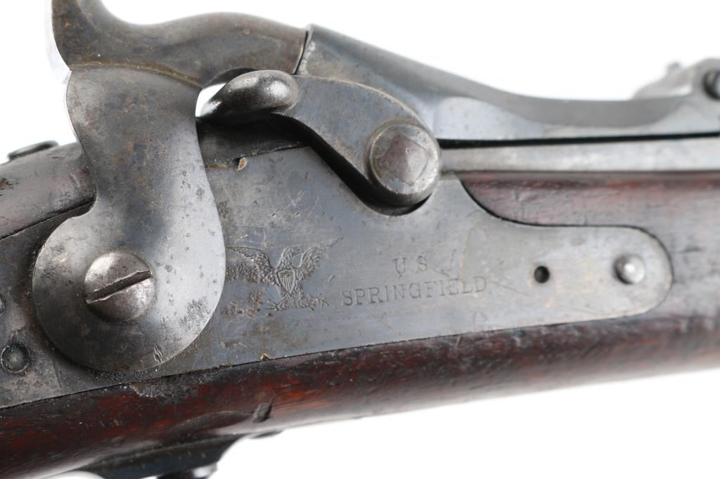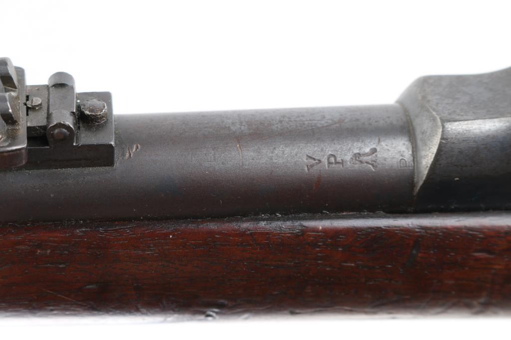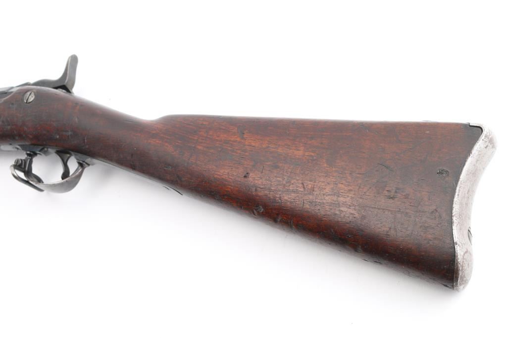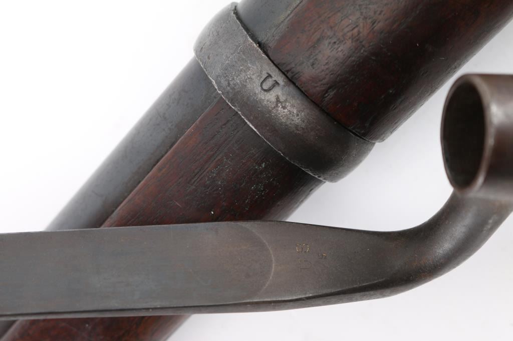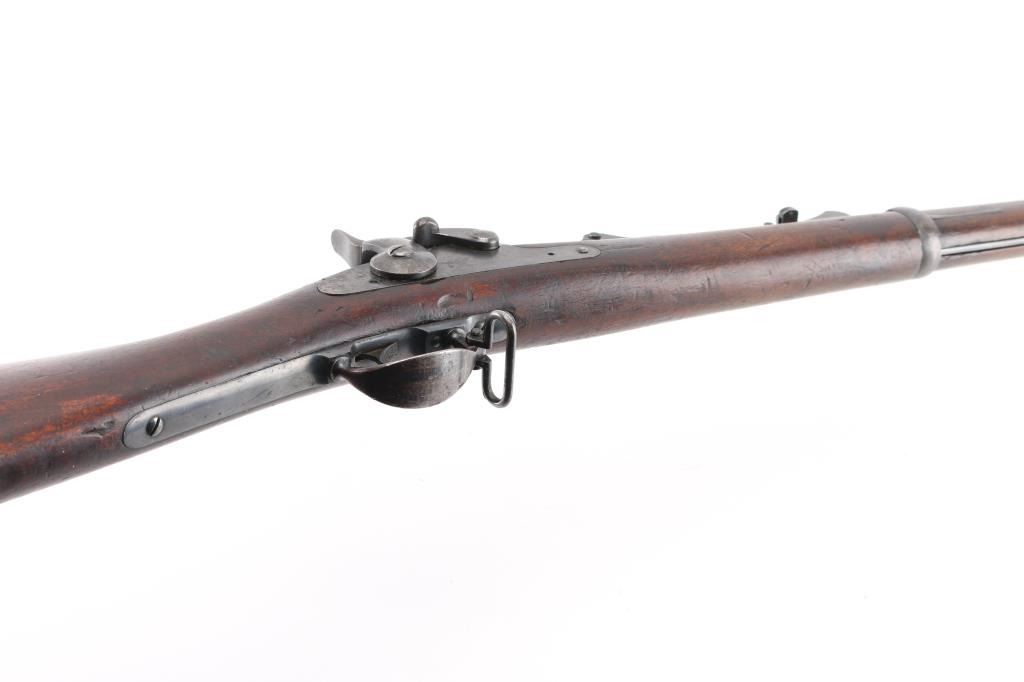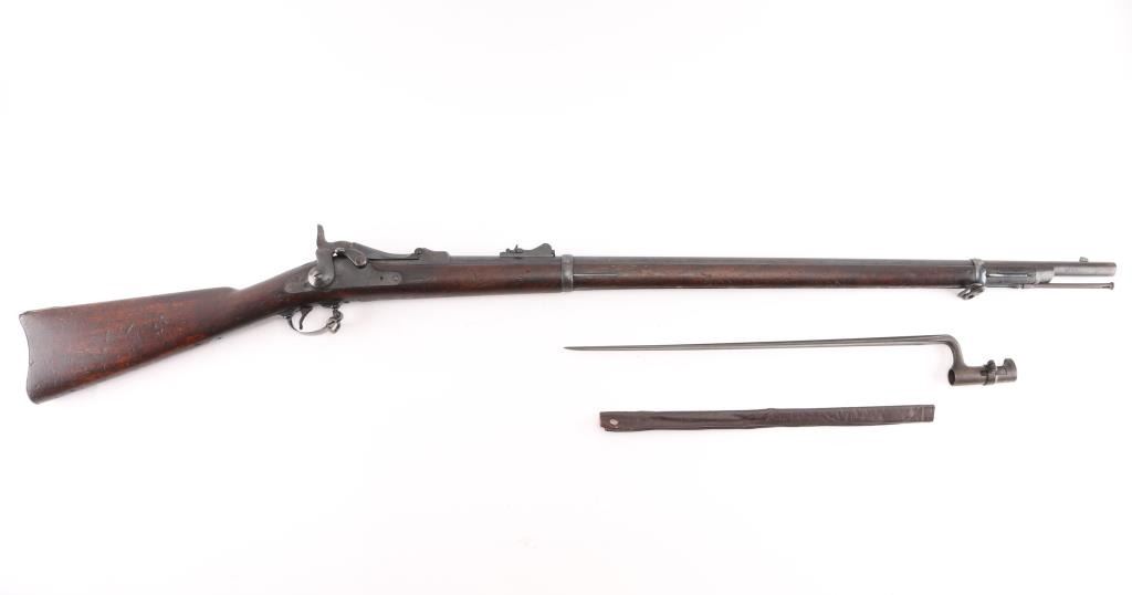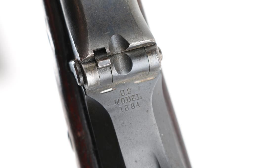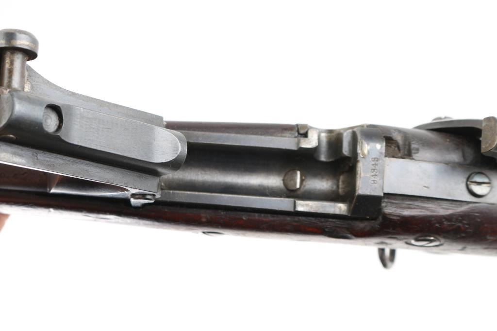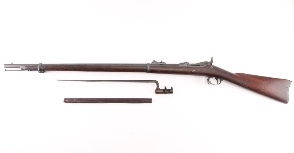 US military single shot rifle manufactured circa 1878. Features 32.5" barrel, 1873 sight, rear sight stamped "R".sling swivels, stacking swivel, external hammer, straight gripped walnut stock, curved steel buttplate. Bore is very good/bright, showing good rifling. Most metal surfaces are a dull blue,turning a brown patina. Stock is sound with a chip by the left tang, with numerous scratches/dings, no, or proof P, cartouche visible. Breech block is stamped "Model 1884", this is an old replacement, as wear is consistent with the rest of the rifle. Barrel marked over chamber "V / P / (eagle head)", "P". Buttplate marked "US" on the tang. The U.S. markings on the lock plate are clear, and the cleaning rod is present. Serial number is crisp/clear. Comes with correct issue "U.S." marked bayonet, no scabbard, Condition is NRA Very Good. Antique Firearm