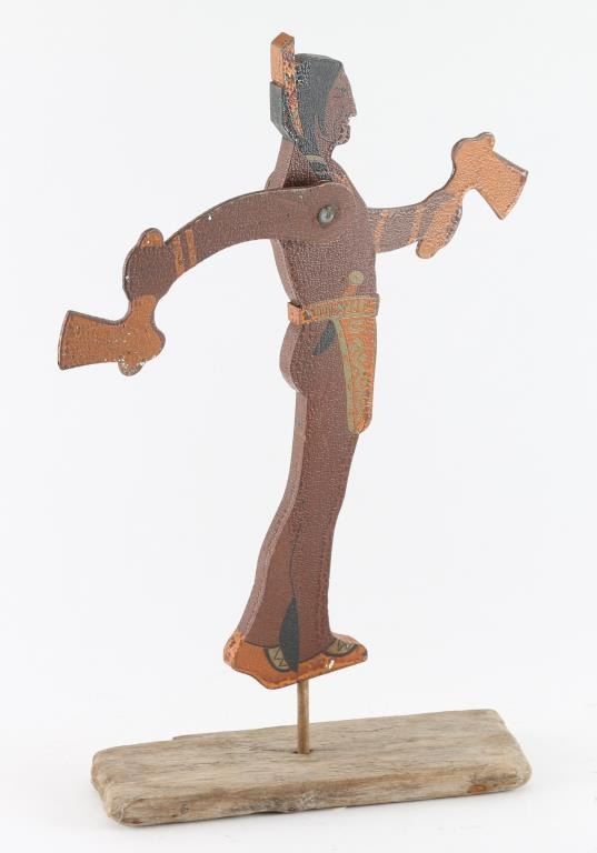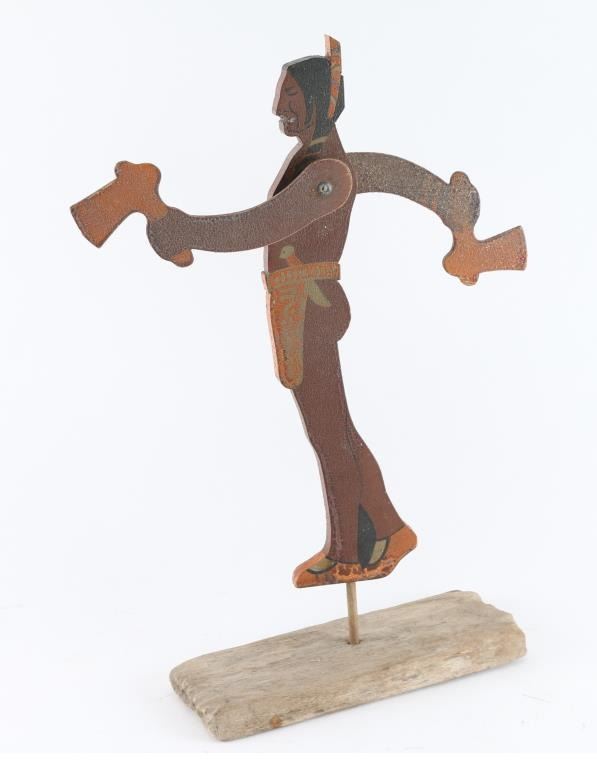Hand-painted, mounted on barn wood base, depicts indian with tomahawks in hand. In good condition with signs of age on paint. Measures 15x11".