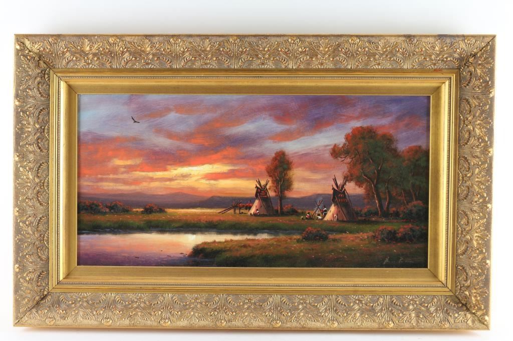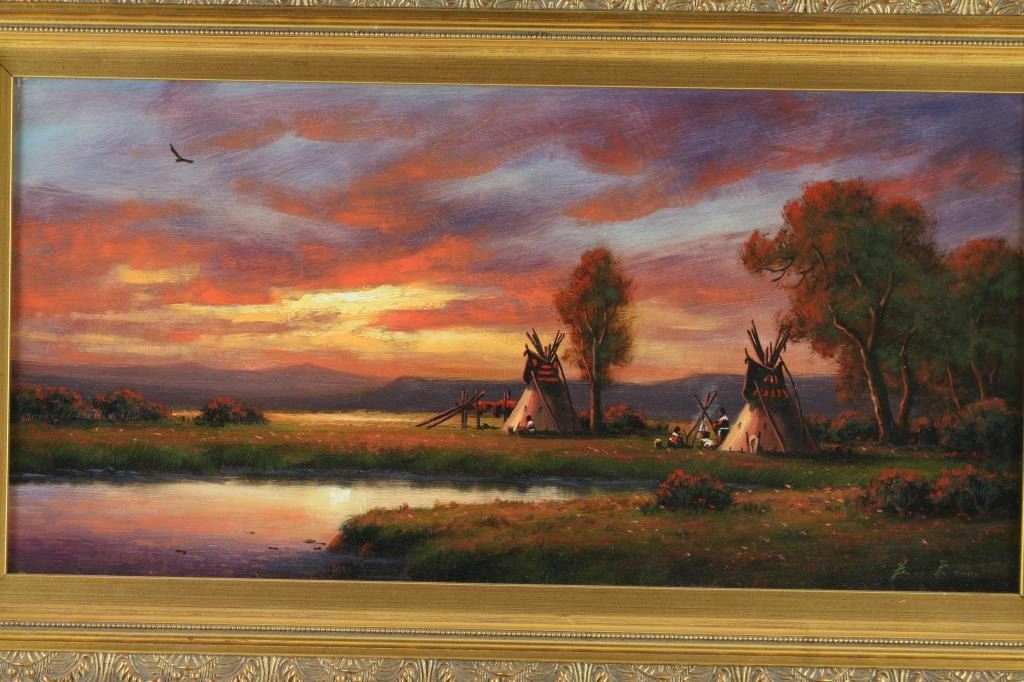 entitled 'Comanche Country', 24"x12", hand signed, in gold gilt frame. Heinie Hartwig became a painter of primarily western subjects although he also does landscapes and still lifes. The tone of his work is primarily romantic. He started painting in 1970, working on his art in the evenings, and a year later quit his job and began painting for a living. He had grown up in the Santa Clara Valley of California, and left for three years to spend time traveling through Europe with the Army. He was in Germany as the Berlin Wall went up. By 1991, he was in "Who's Who in American Art". Hartwig taught himself to paint by studying the "Old Masters." He was attracted to the charm and romance of classic art. He has managed to capture the light, color and style of those great artists. Though most of his work has a western theme, Hartwig is a versatile painter. Many of his paintings are landscapes and still lifes. Heinie Harwig's work has been compared to Albert Bierstadt and John Constable for its romanticism, European feel and composition.