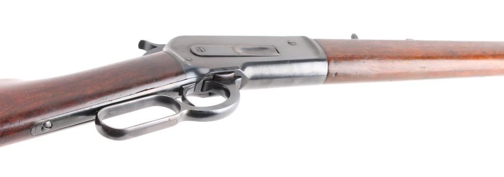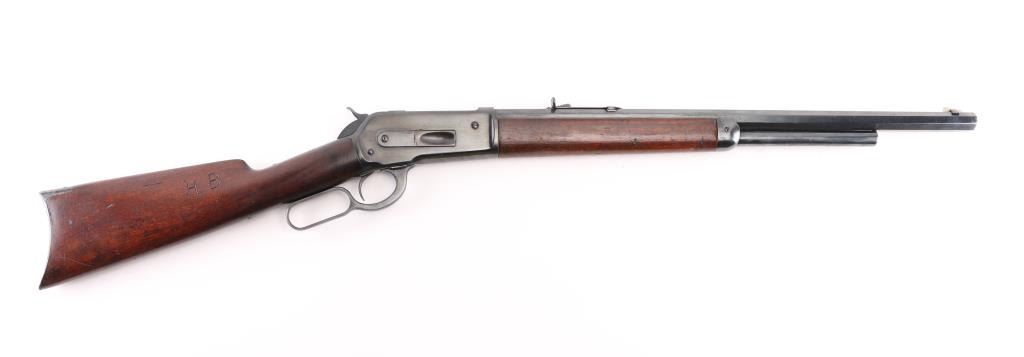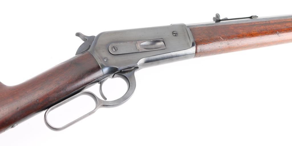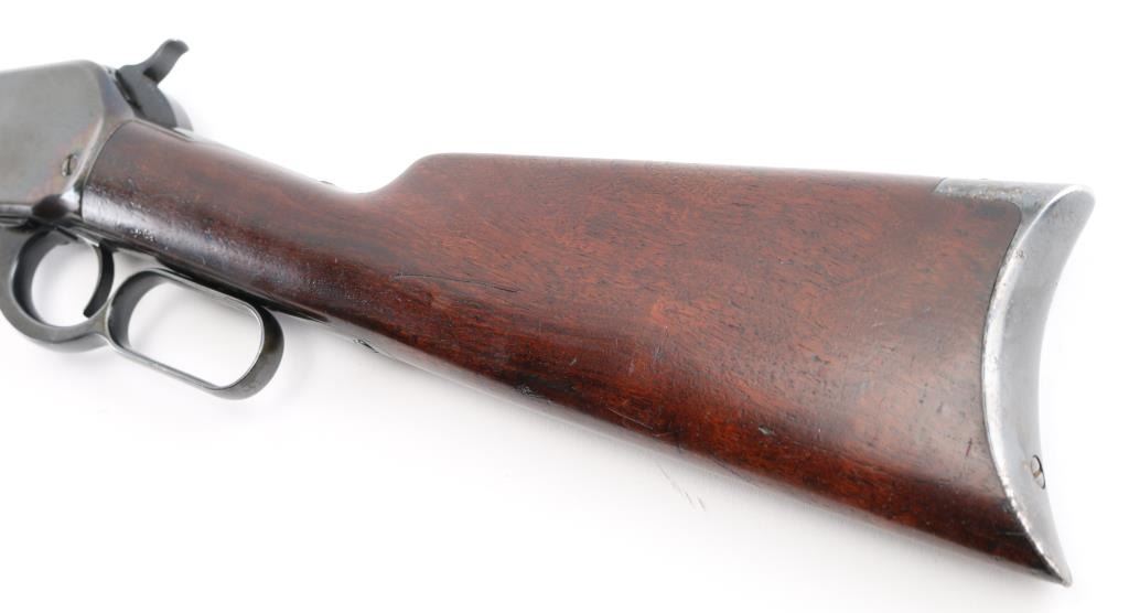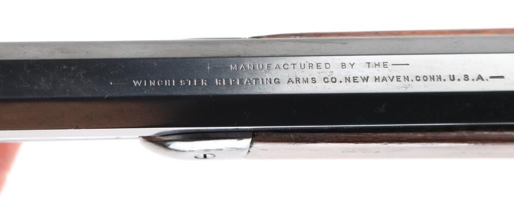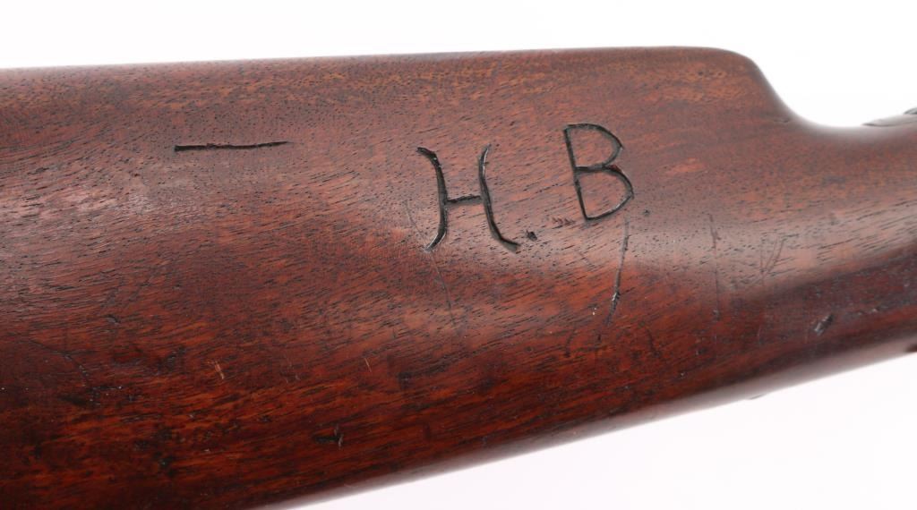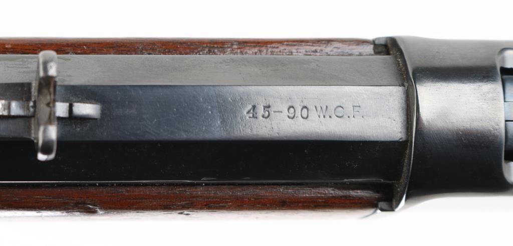 Antique large frame lever action repeating rifle chambered in .45-90 Winchester, manufactured in New Haven, CT circa 1889. Features a 22 1/2" octagon barrel, 3/4 length magazine tube, blade front sight, adjustable rear sporting sight, smooth trigger, checkered hammer spur, smooth walnut forend with metal cap and straight grip shoulder stock with "H.B." etched on right side & smooth crescent metal buttplate. The rifle retains 95% of it's re-blued finish with some of the metal surfaces displaying a mottled grey/brown patina with some scratches & dings, loss of original contours at edges. The action is smooth, the bore is good with some pitting and the wood stocks are good with a few deep scratches in the forend and stock. Condition is NRA Good. ***Antique Firearm***
