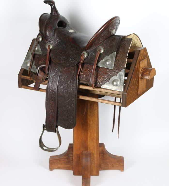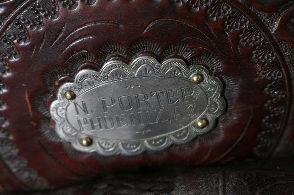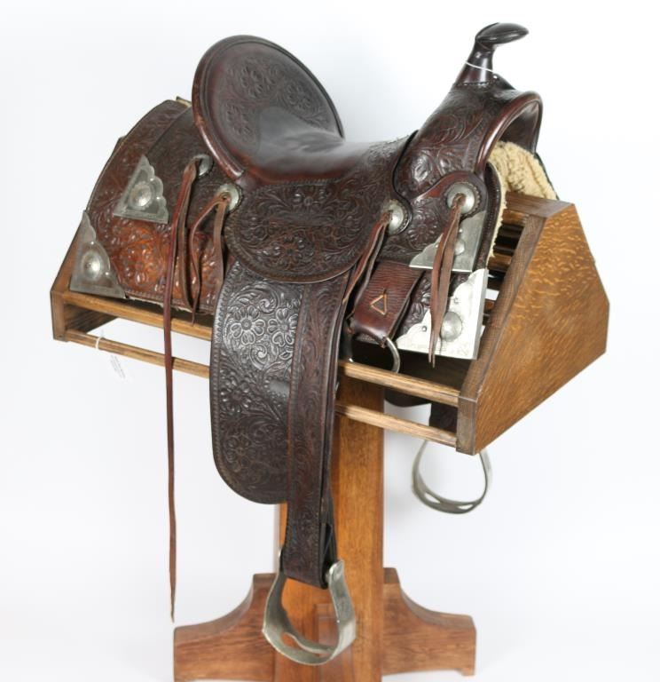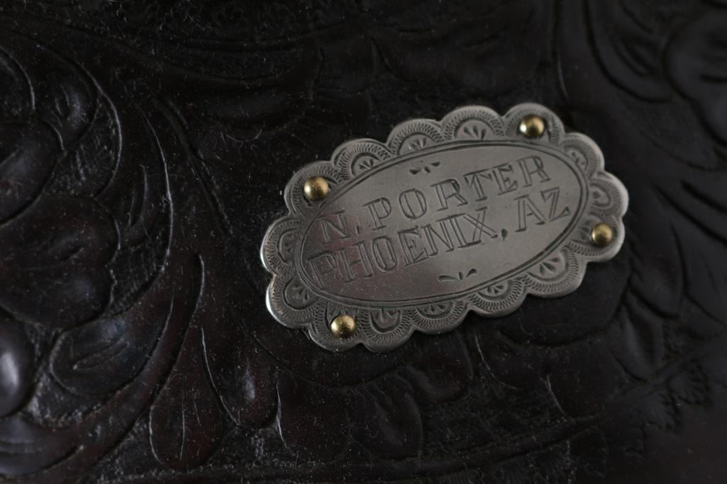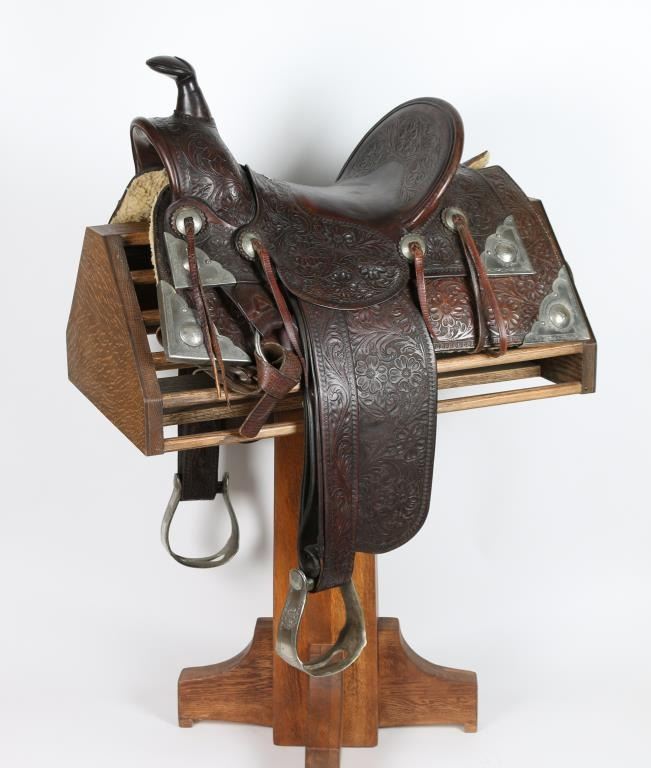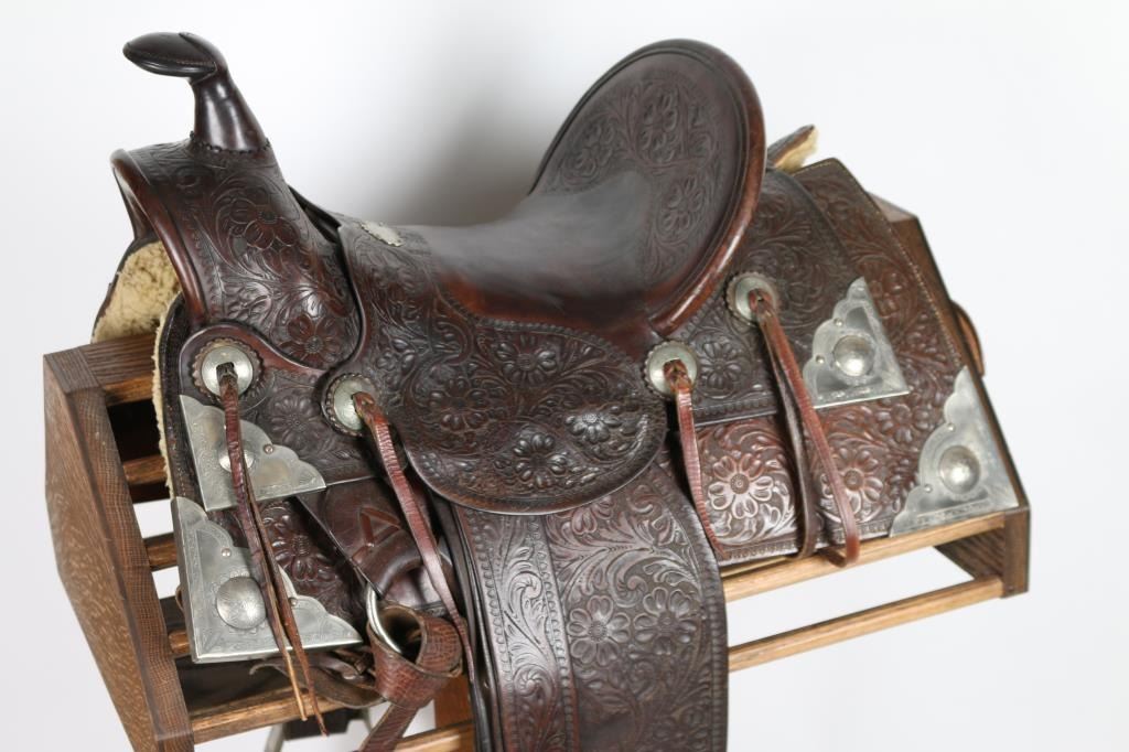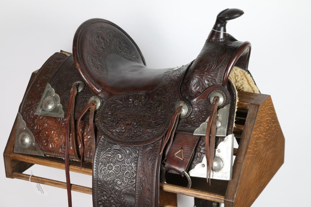 Brown floral tooled saddle with square skirt accented with sterling engraved corners, high back, in excellent condition.