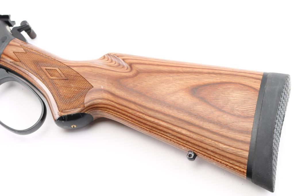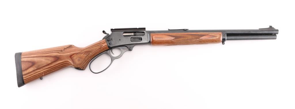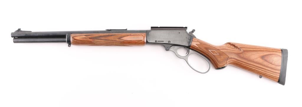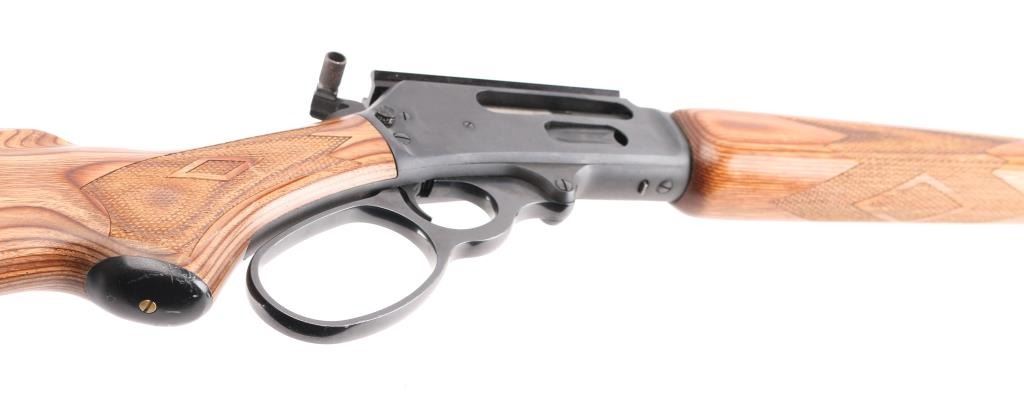 Lever-Action rifle. Carbine configuration. 18" round barrel 1:20 Twist with ramped, post/bead front sight and u-notch, flip-up rear sight (missing). Weaver rail attached to receiver. Big loop/over-sized lever and knurled hammer extension, extended tube magazine, straight wood stock/forearm checkered at wrist and forearm with black rubber recoil pad. Action is crisp/tight. Bore is excellent, but a little dirty. Blued finish and wood stock are excellent. NRA Condition-Excellent. Modern Firearm.