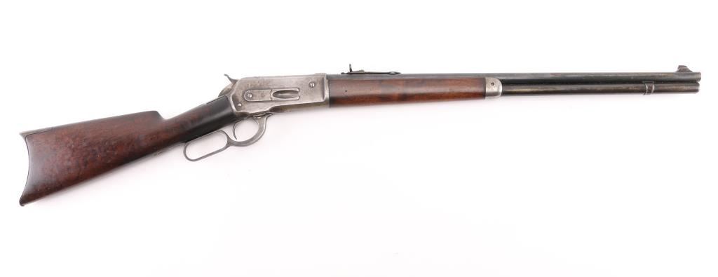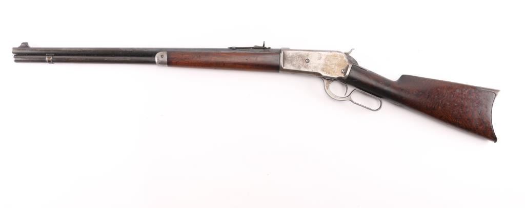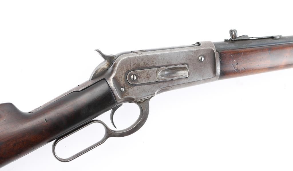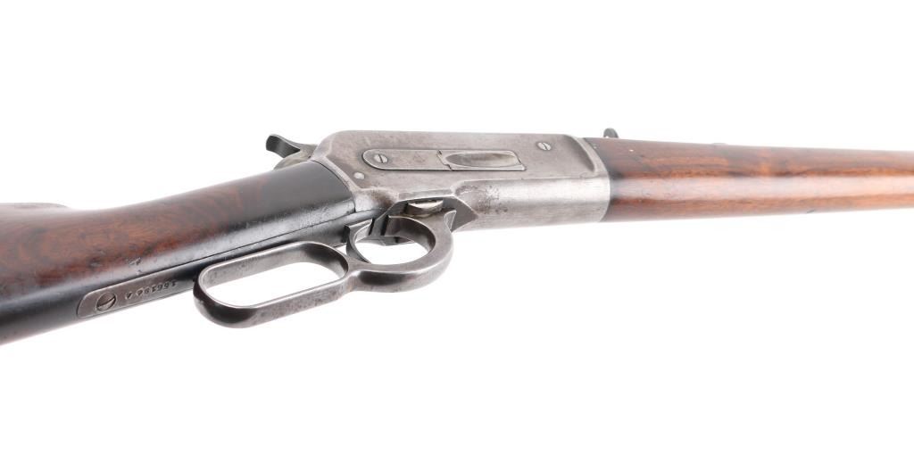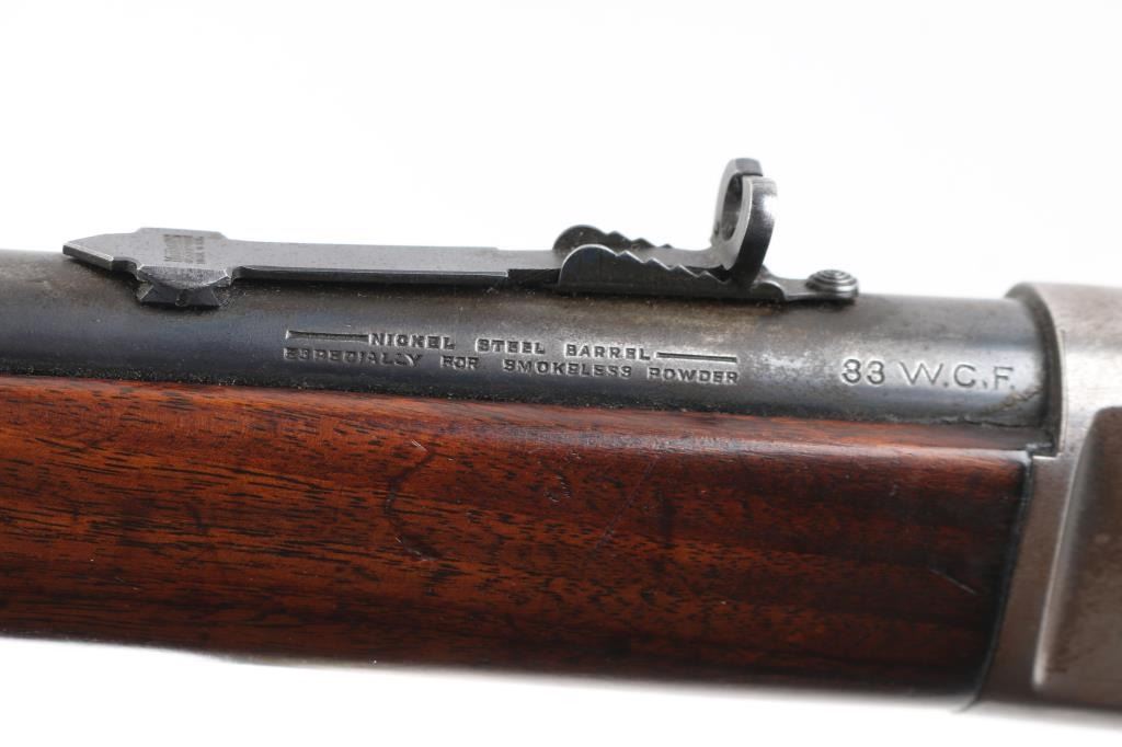 Lever-action repeating rifle chambered in .33 Winchester, circa 1917. Features a blued/case hardened finish, 24" round barrel, blade/bead front sight, adjustable buckhorn rear sight, full length tube magazine, smooth trigger, checkered hammer spur, metal forend cap, smooth walnut forend and straight grip shoulder stock with crescent metal buttplate. Rifle retains approximately 70% of it's blued finish on the barrel magazine tube with the balance comprised of a browning patina. The case hardened receiver is in-the-white with a gray patina, scratches, and scattered light pitting. Action performs well, bore is bright very good rifling & some frosting, markings are good and wood stocks are good/sound with moderate blemishes & what looks to be an old refinish Condition is good+. C&R Firearm.