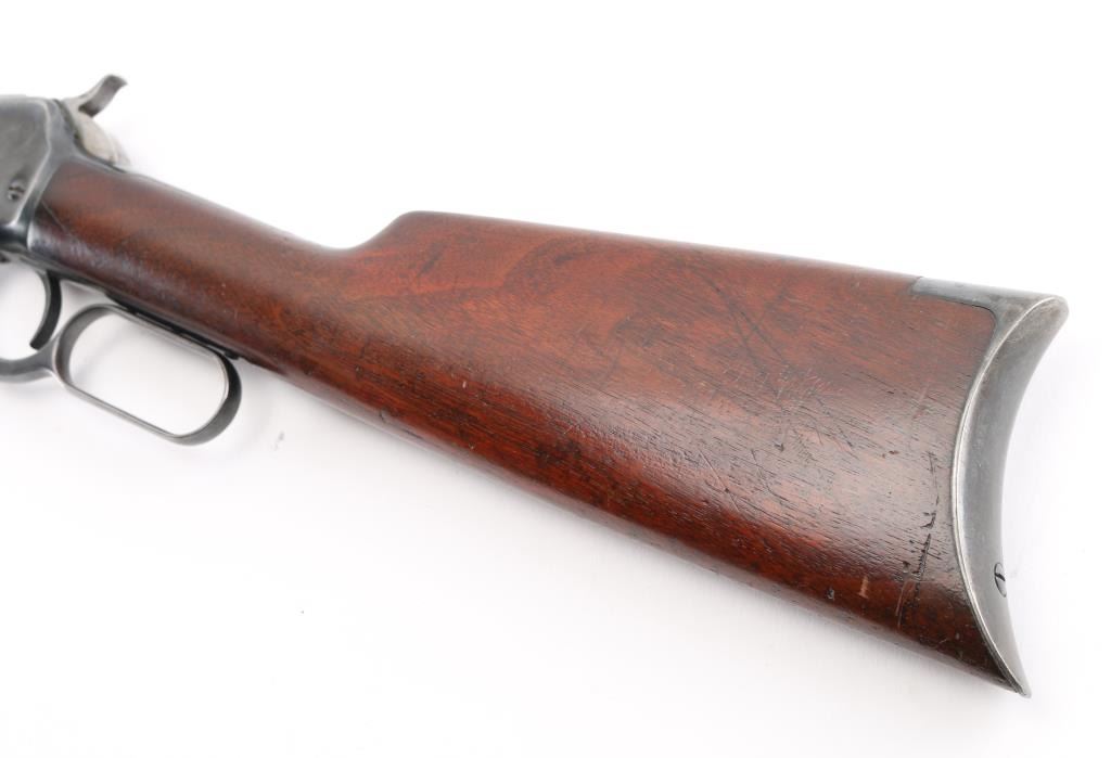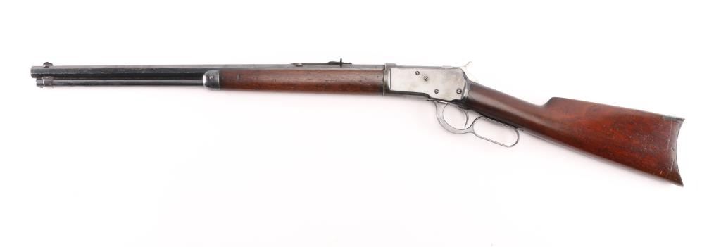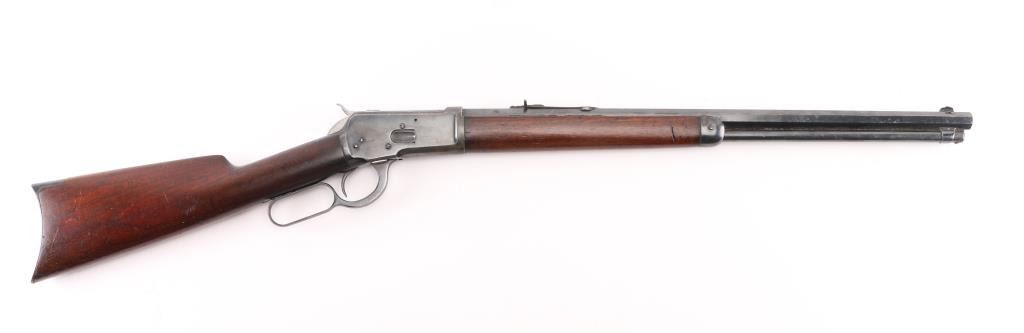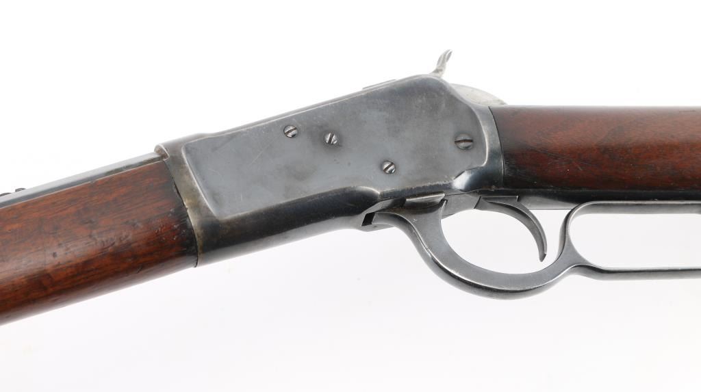 Refinished lever action carbine chambered for .32 Winchester Center Fire. It has a 21 1/2" octagon barrel, full length magazine tube, Marbles blade front sight, adjustable sporting rear sight, smooth trigger and knurled hammer spur. Two piece smooth wood stocks have a metal forend cap and a metal butt plate. Old reblued finish is about 80% with scratches, edge wear, handling loss, barrel markings are very faint, except the caliber, and there's no visible serial number due the the refinish, Tang markings are crisp. Wood stocks are good/sound with numerous minor scratches/dings. Bore is fair to good with some very light scattered pitting, good rifling.