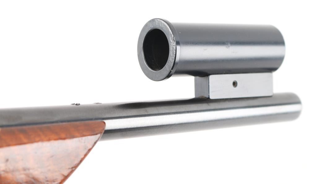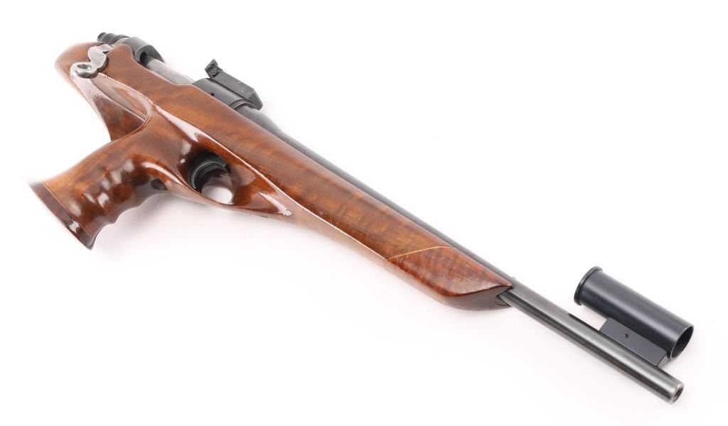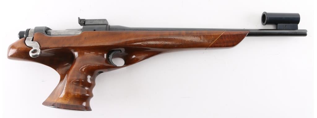 Customized single-shot bolt action target pistol chambered in 7mm BR Rem., manufactured circa 1963-1985. Features a blued finish, 15" tapered barrel with globe front sight with adjustable post, micro adjustable square-notch rear sight. , serrated trigger, bolt release on the right side of the receiver, polished ring bolt with bent handle, and custom select walnut thumb hole pistol grip stock .with darker contrasting forearm and grip caps. No safety. Pistol retains approximately 97% bluing slowing some minor scratches and muzzle wear. Action is smooth, the bore is excellent and wood stock is very good minor scratches. Bottom of grip has a NRA national Silhouette Championships sticker. Condition near is NRA Very Good Modern Firearm