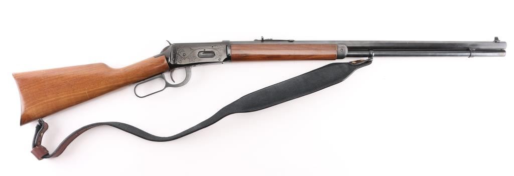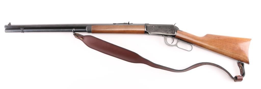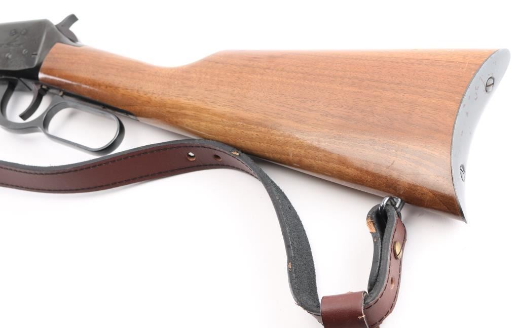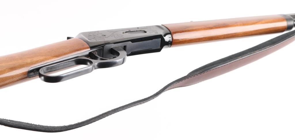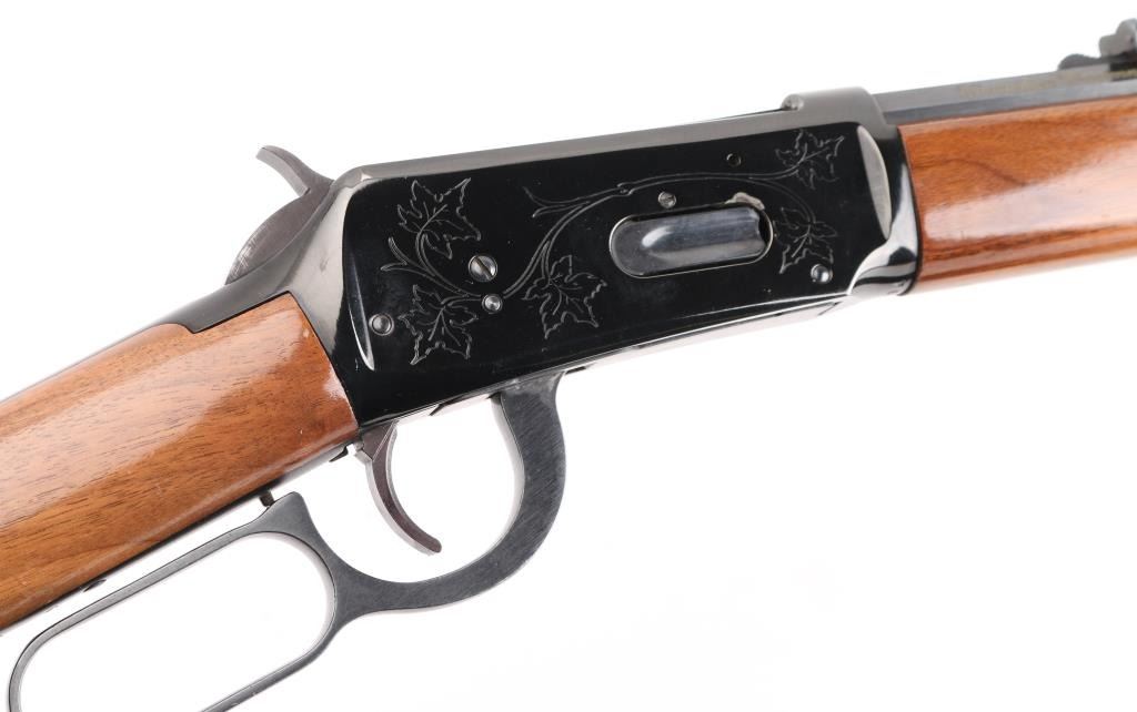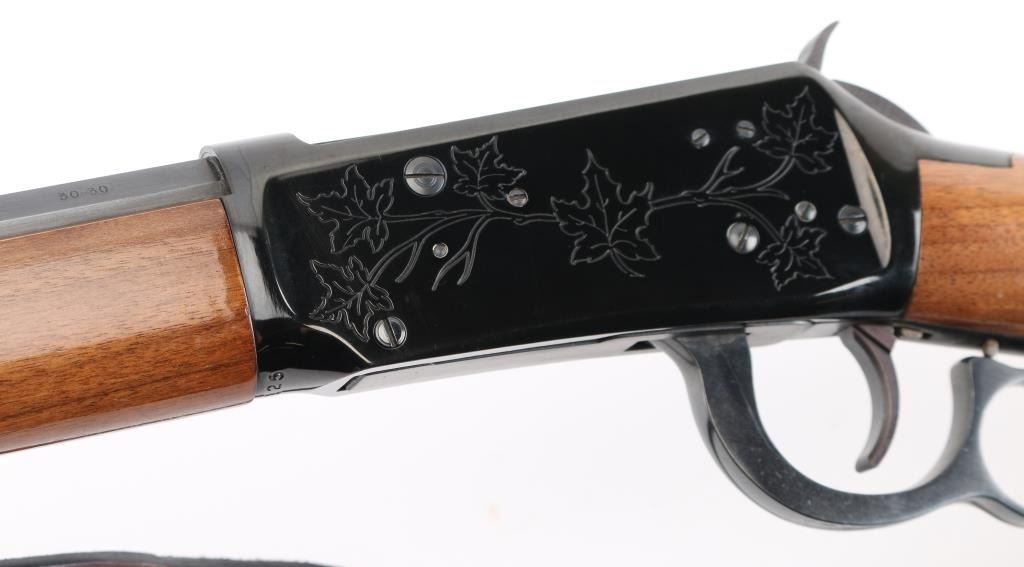SN: 76125. Lever action repeating rifle chambered in .30-30 Winchester circa 1896. Features a polished blue re-finish, 26" octagonal barrel with "Canadian Centennial 1867-1967" etched top right adjacent rear site, full-length tube magazine, beaded blade front sight with sporting rear sight, smooth trigger, serrated hammer spur, steel receiver with etched Maple leafs on both sides, single barrel band, smooth walnut forend with metal cap, straight grip shoulder stock with smooth metal crescent buttplate. Bore is in excellent condition and wood is very good with some nicks and scratches. Comes with padded black and velvet-colored sling with leather tassel at buttstock. Condition is NRA Excellent (refinished) *** C&R Firearm ***