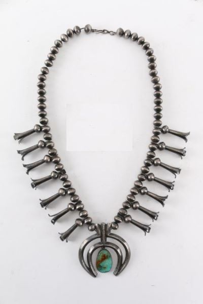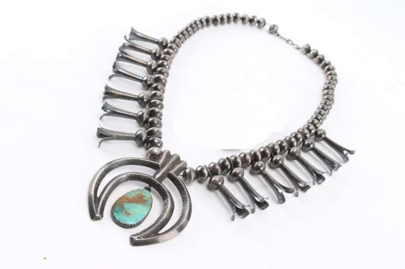 with sandcast naja with a beautiful large turquoise stone. All sterling with great patina.