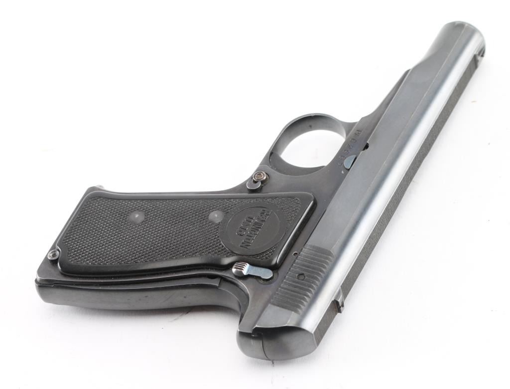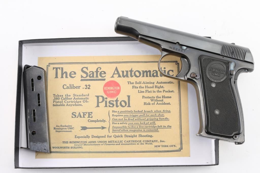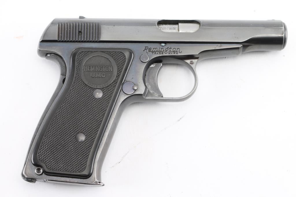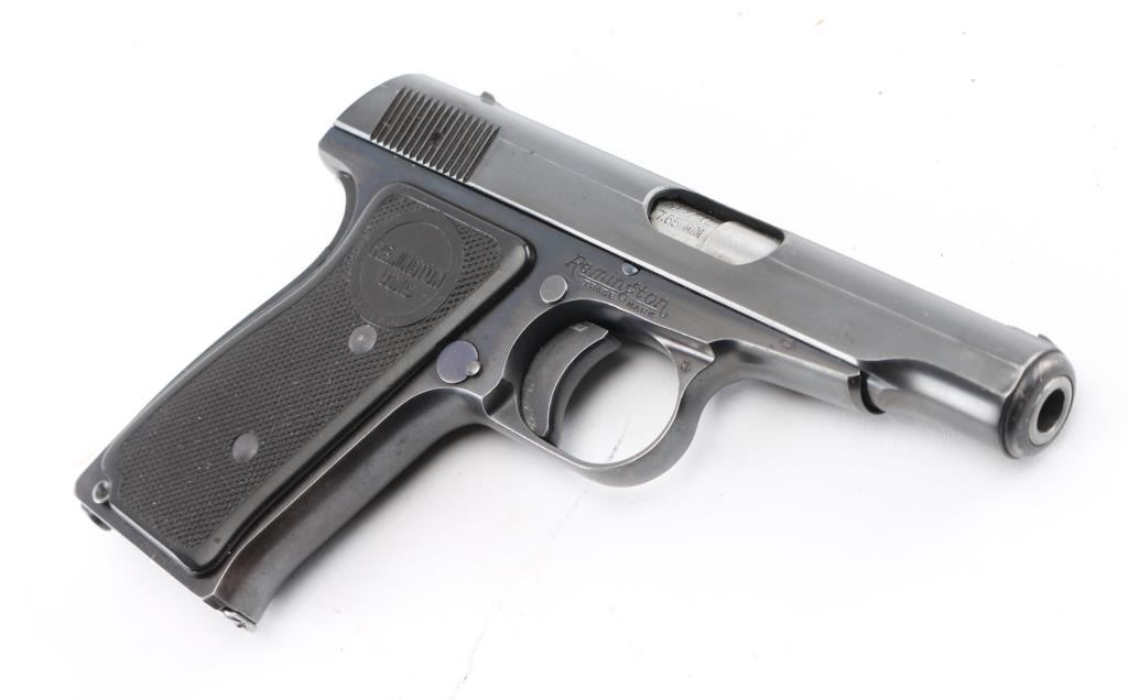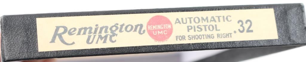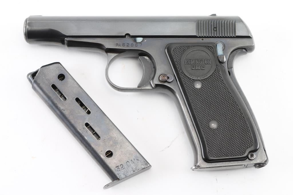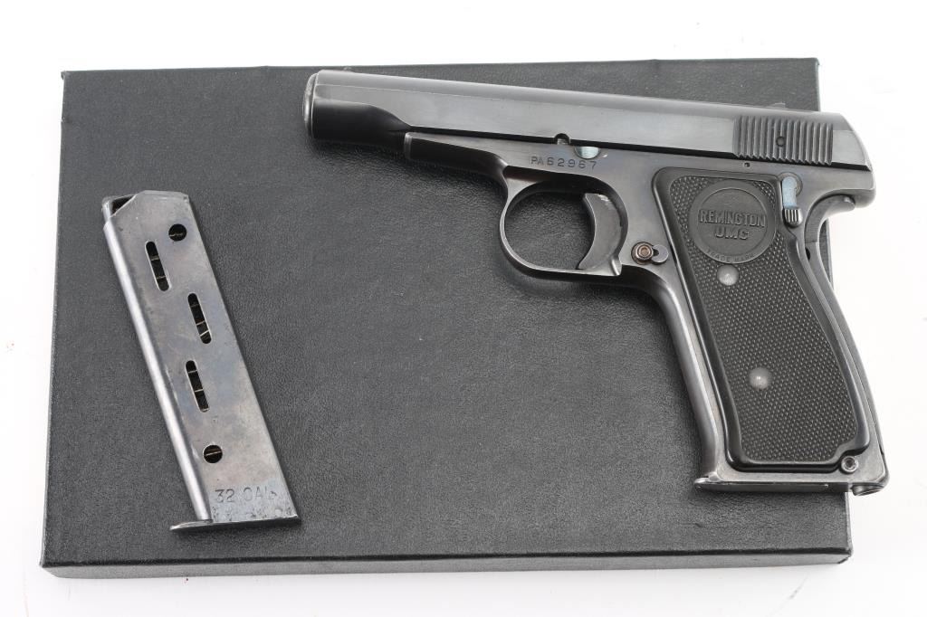 Semiautomatic pistol features blued finish, checkered black plastic grips with "REMINGTON UMC" logo, 3.5" barrel, fixed sights, push button magazine release, grip safety, manual safety. Bore is excellent condition. Retains 98% finish, bright blue on controls, minor edge losses, front strap turning a slight bit gray. Grips are pristine. Includes two magazines marked "32" on side, factory paperwork, reproduction Remington box. Condition is NRA Excellent *** C&R Firearm ***