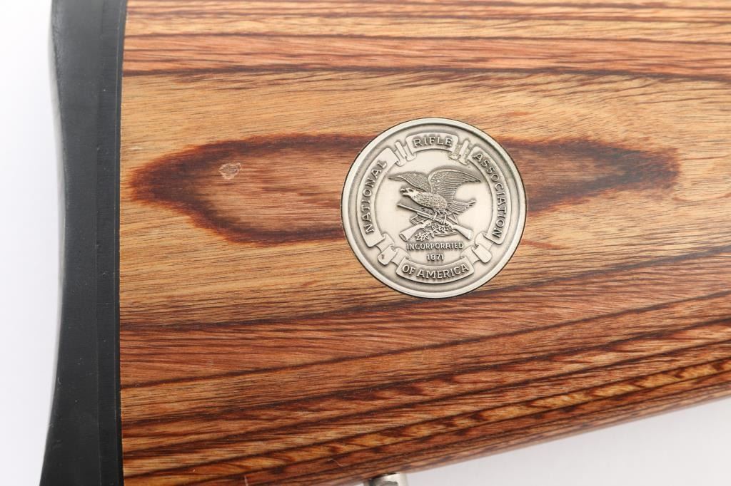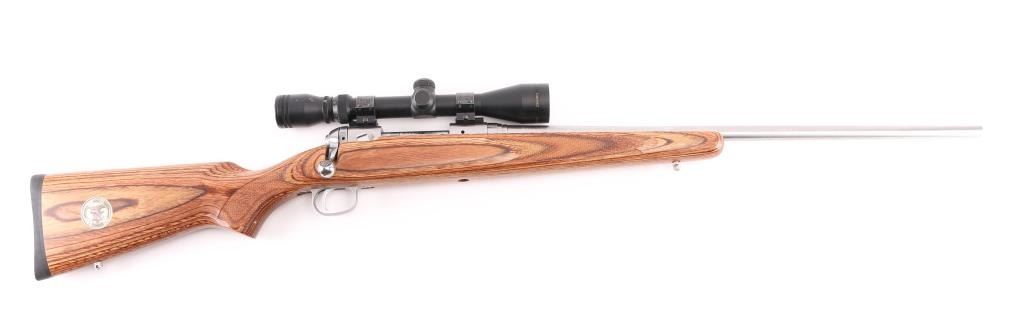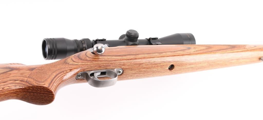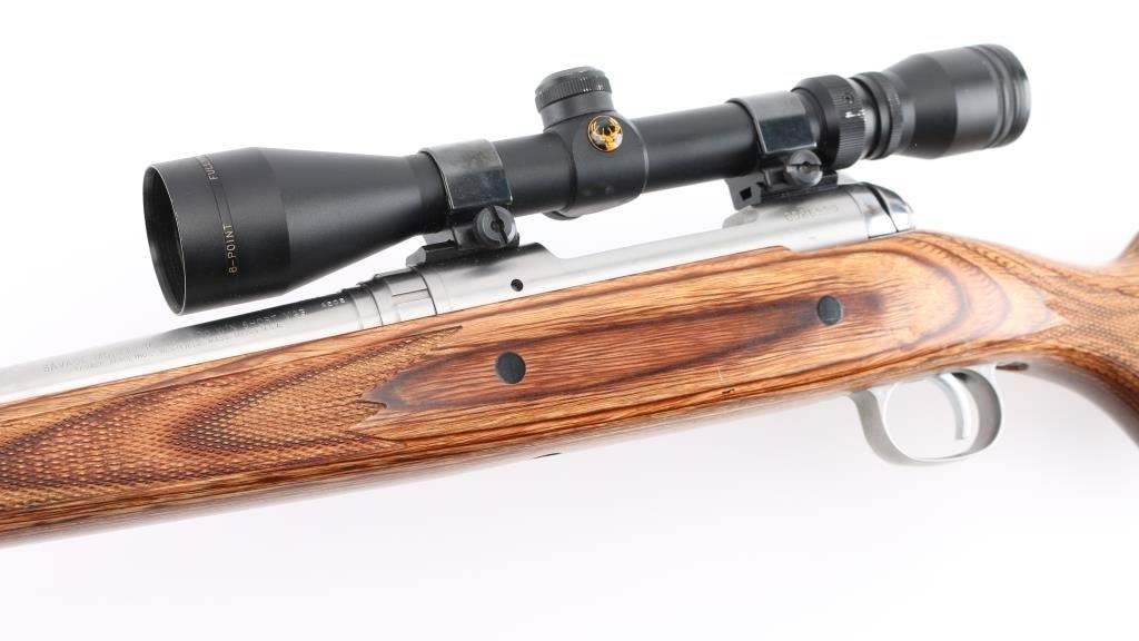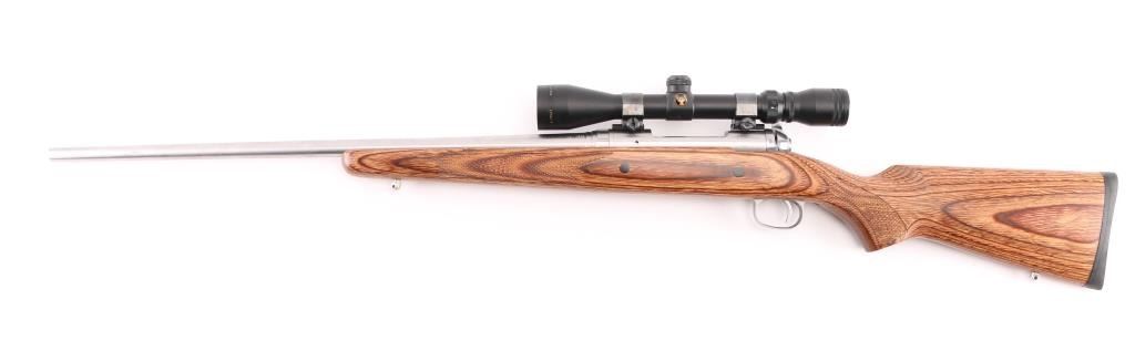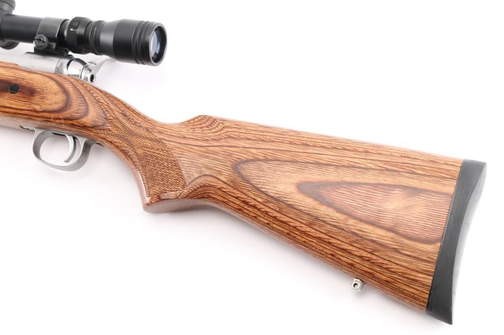 American made stainless steel bolt action sporting rifle chambered in .300 Winchester Short Mag. Features a stainless steel brushed finish, floated 24" tapered barrel, no provisions for sights, sliding tang safety, matte nickel plated smooth trigger and trigger guard, integral box magazine with no hinged floorplate, matte nickel plated swivel studs and laminated wood stock with checkered wrist and fore end, smooth rubber recoil pad. National Rifle Association medallion on right side of buttstock. Action is very smooth. Bore and action are excellent. Comes with mounted Simmons 3 X 9 rifle scope with some scratches. Condition is NRA Excellent. ***Modern Firearm***