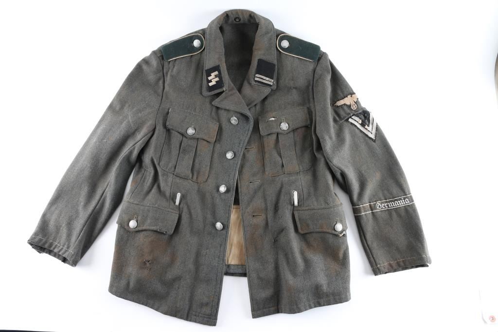 Original Item. Super rare M35 combat tunic of the Panzergrenadier Regiment "Germania", attached to the SS-Panzer Grenadier Division "Wiking" It's final designation was SS-Panzergrenadier Regiment 9 "Germania". Worn by a SS-Rottenfuhrer. (Corporal). Field-grey wool/rayon blend construction M35 ( M35 SS pattern liner) field blouse with a lay down collar, features a vertical, four button front closure with a single hook and eye positioned at the forward neckline and a hidden cloth loop, & bakelite button as well. Nice quality SS EM/NCO machine embroidered arm eagle with original hand stitching to the sleeve. Black wool NCO/EM collar tab machine embroidered weaved SS runes in silver/gray cotton threads, and Black wool SS-Rottenfuhrer rank tab with double tress. Black wool rank chevron with double silver tress hand stitched to sleeve. Bottle green Army collar tabs, slip-on with rayon lined tongue. (Have seen army boards on SS tunics before, easily replaced) RZM type "Germania" cufftitle perfectly hand stitched to sleeve., gothic script The field blouse has two, pleated, top pockets with scalloped button down flaps. correct un-pleated hip pockets are the saddlebag type with expanding side panels. Nice SS pattern M35 brown/gray cotton twill complete liner, two HBT (Herring Bone Tweed) support straps held in place through tunnels with 15 eyelets, Bandage pocket, any ink stamps have worn off. Correct three eyelets for belt support in front & back. The blouse has been slightly modified by removing the small hooks used to retain the outer support straps, and a fourth eyelet was added in the back for better support, thread is a different color the the original eyelets, done, no doubt by the owner. Buttons look to be original stitching with most of the green paint worn off. Rear of blouse shows the standard army field blouse cut, the formal SS (Rock) cut was removed in favor of practical combat considerations, correct. Well worn and used example with many tears, & fraying to pocket & cuff edges, there is a large tear above the chevron that has a hand stitched repair with tears and damage to the chevron, still has mud stains on the elbows, and elsewhere. If you are looking for a pristine "Walking Out" uniform then this is not for you, but are looking for one that has "Been There", then this is it as this unit saw heavy combat on the Eastern front with heavy losses. You won''t find many reference to this tunic because of it's scarcity, but it is discussed in chapter three, pages 114-123 in "Uniforms of the Waffen-SS, volume 1 by Michael D. Beaver, with full color pictures showing the liner which is unique to M35's. The book published in 2002, states at the time there was only two examples known to exist. Consignor states that this blouse was purchased in England some years ago at a "Booth Sale", (swap meet) from a woman who stated her father brought it home from the war, and remained untouched. Very Scarce SS M35. All stitching passed the black light test.