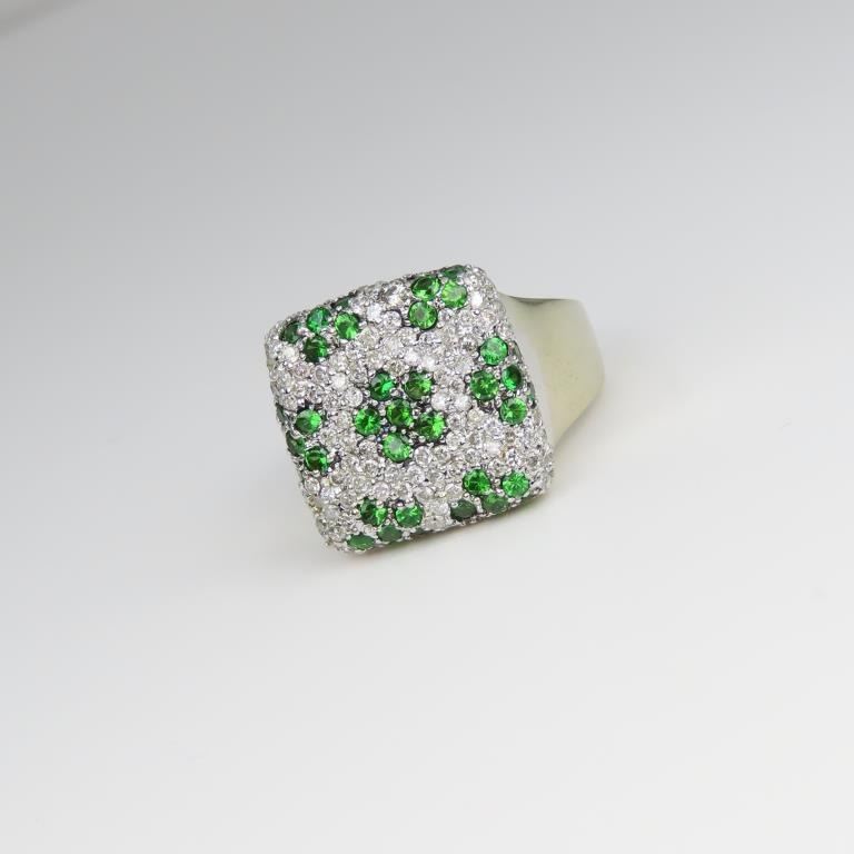 featuring a designer style setting pave set with over 120 round Diamonds and fine green Tsavorite Garnets with a combined weight of approx. 4.00 carats meticulously set in a amazing 14 karat white gold setting. Retail $5,000-$7,000 Size 7.