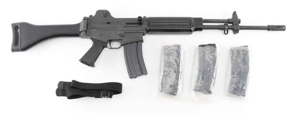 pre-ban Korean made semi-automatic variant of the K2 piston-driven assault rifle chambered in 5.56x45mm. Imported by LA Co of Sacramento, CA. with import marks on the right side of the lower receiver. Features a dark matte grey finish, 18.5" barrel (marked "K MP C"), bayonet lug, A2 flash hider, protected post front sight, marked "NM 072", adjustable rear aperture sight, adjustable gas system, smooth trigger, thumb safety that rotates 90 degrees, push button magazine release, accepts M16/AR15 magazines, cylindrical charging handle, grooved black synthetic handguard, black polymer folding stock. Rifle exhibits approximately 95% of it's original finish showing scattered scratches & scuffs. Action is smooth, the bore is excellent and the synthetic stocks are excellent, with some tape residue on the left buttstock. Includes black canvas web sling. and 4 brand new C Products 20-rd magazines. Condition is near NRA Excellent. Modern firearm.