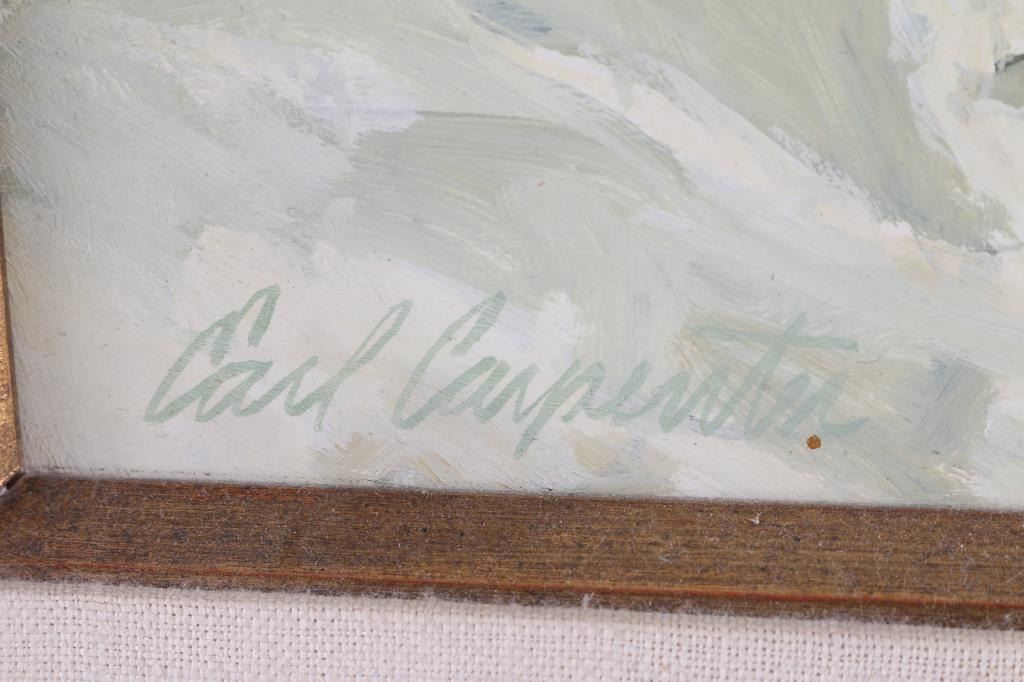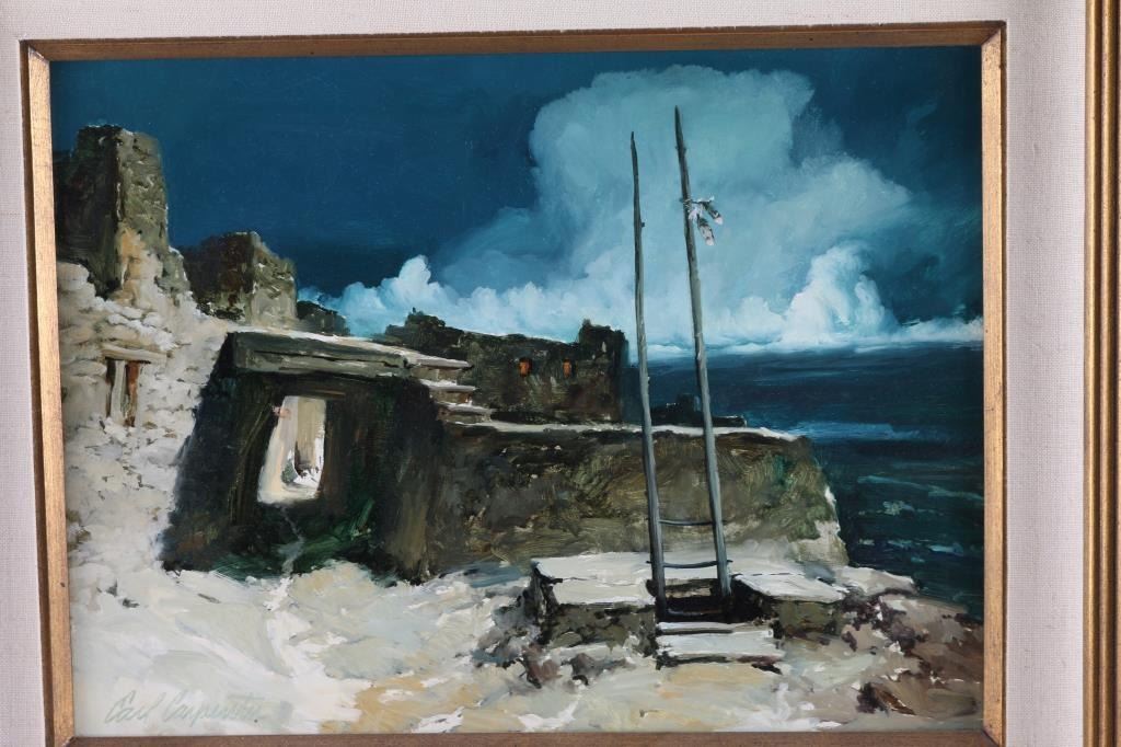 By artist "Earl Carpender" depicting pueblo, signed lower left. Framed and triple matted. Image size measures 16x12. Beautifully framed and triple matted.