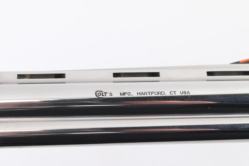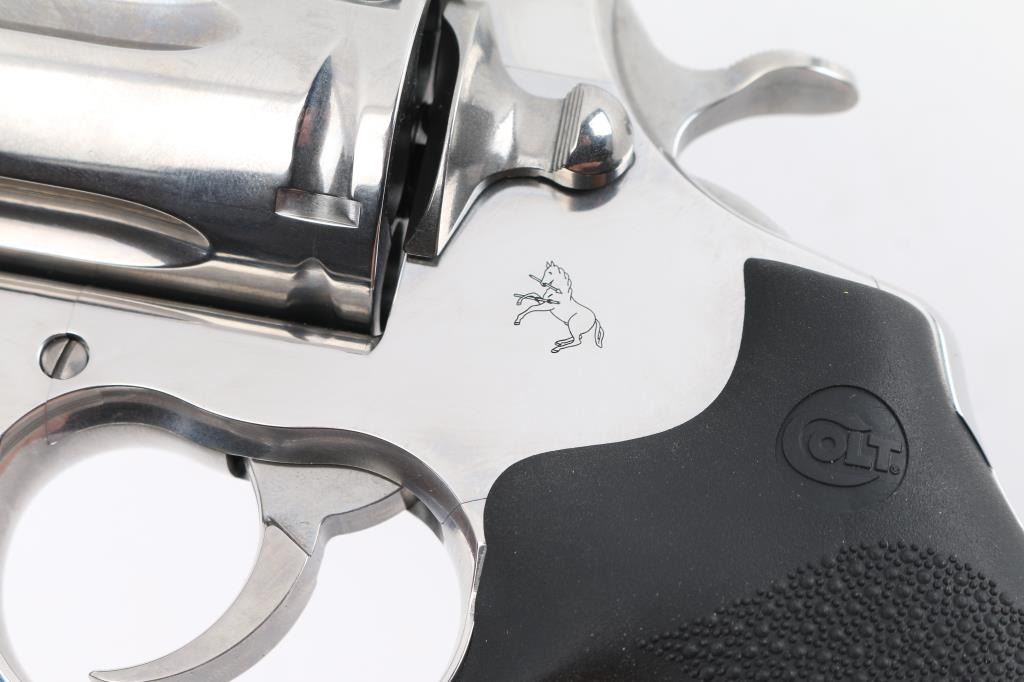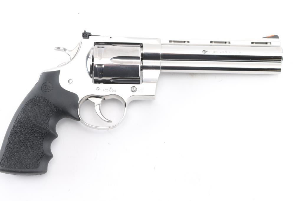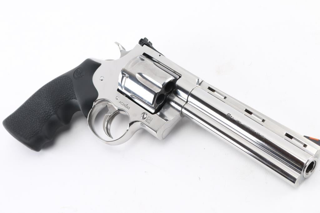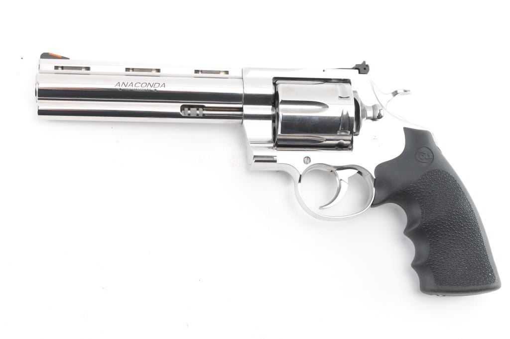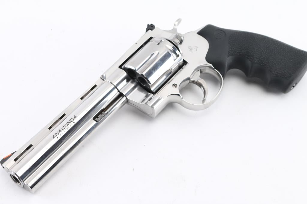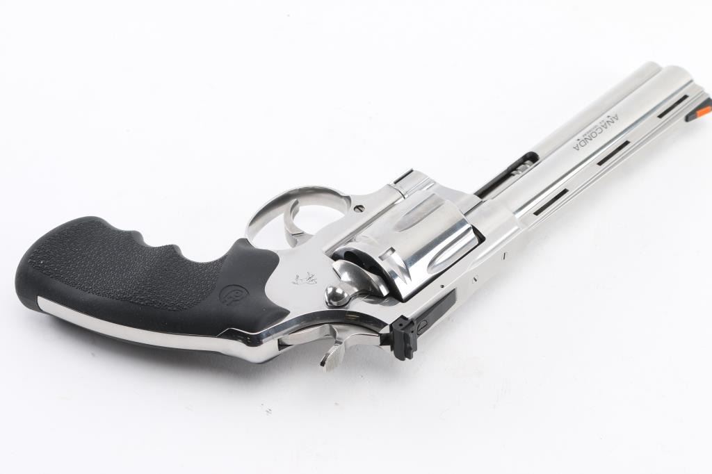 ‘2021’ Premium large frame double action revolver chambered in .44 Magnum, manufactured in Hartford, Connecticut. The updated 2021 Anaconda has been fully redesigned to utilize an oversized Python action with a linear leaf spring for a non-stacking, smooth-as-glass trigger pull. Features stainless steel construction with a polished finish, 6" vent ribbed barrel with recessed crown & full underlug, ramp front sight with orange insert, fully adjustable rear sight, fluted six-shot cylinder, partially serrated wide trigger, serrated wide hammer spur, factory drilled & tapped MM flat-top frame, and Colt branded pebbled black rubber Hogue Monogrip. Revolver exhibits little to no visible wear. Action is super smooth with a tight lock-up, the bore is pristine, and the rubber grips are excellent. Includes a factory hard case with matching end label, documents, hang tag and lock. Condition is like NRA Perfect in Box. Modern Firearm.