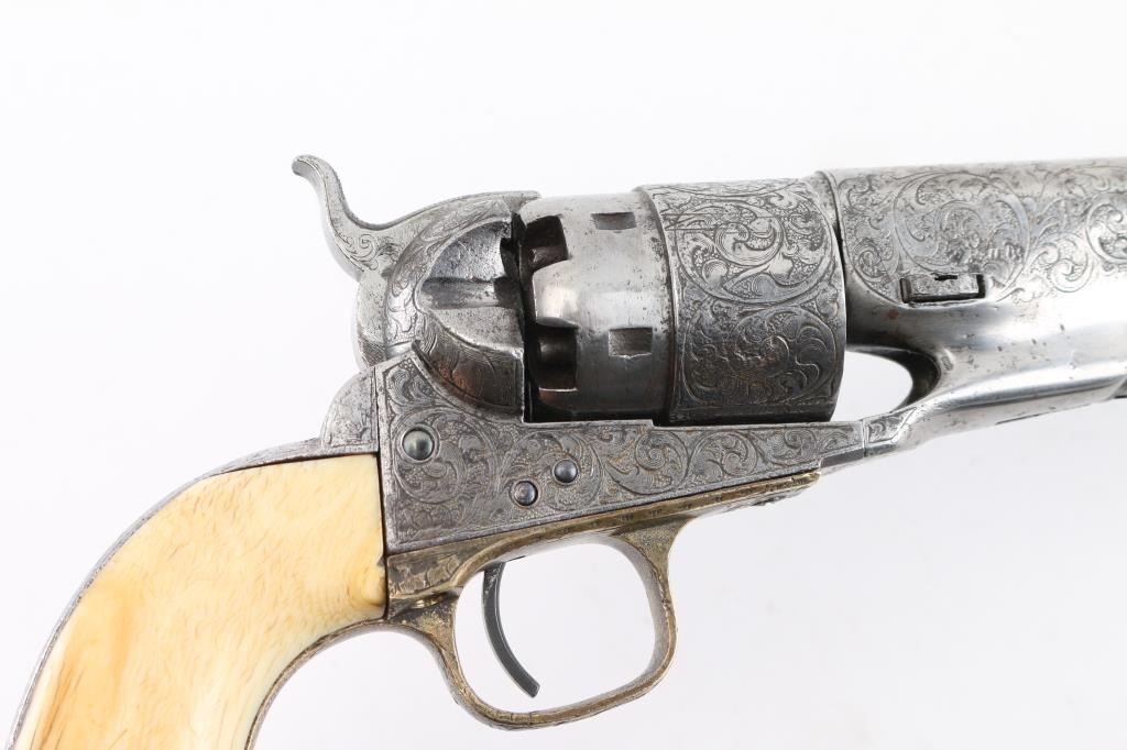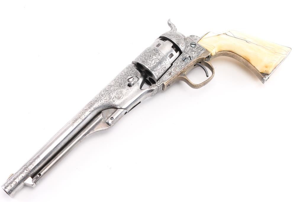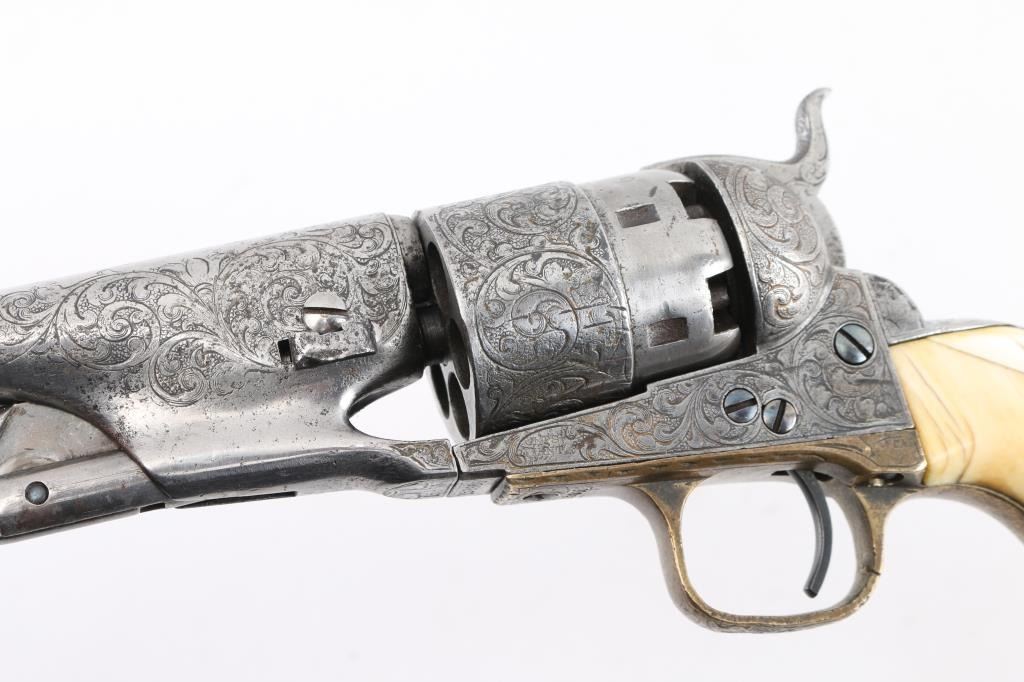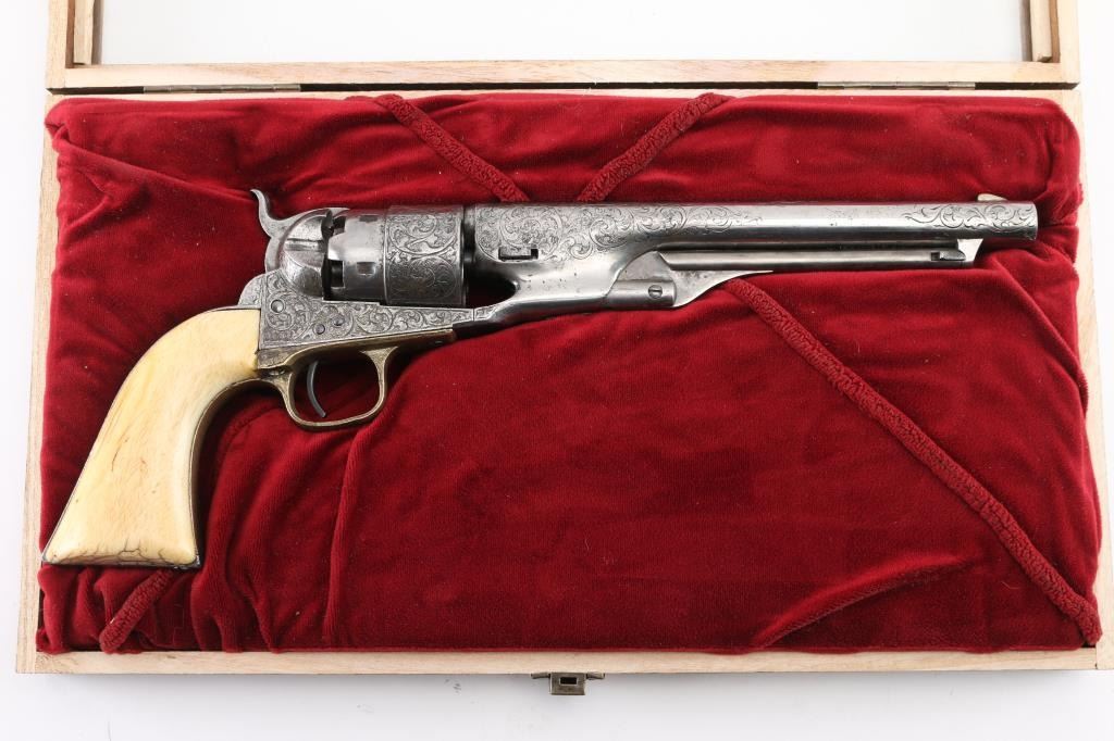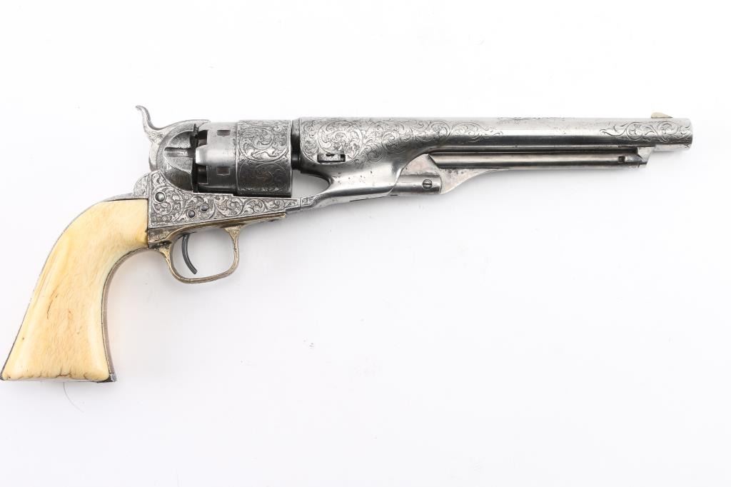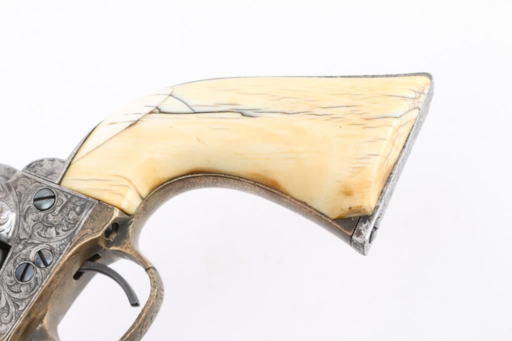 This revolver was period nickel plated and vine scroll engraved. Commercial revolver with no inspectors stamps, or cut outs for shoulder stock, manufactured 1866. It has about 60% beautiful scroll engraving reminiscent of the factory engraving of Gustave Young but probably later applied by an unknown craftsman. The cylinder naval battle scene is covered by the engraving. The ivory grips have that nice mellow yellow color from age. A little shrinkage, a small chip out of the lower left side, and a repair on the upper left side. Action works well, bore has strong rifling with scattered pitting, markings are faint, all matching serial number including the barrel wedge. Action works well, the barrel wedge screw appears to be a newer replacement. Comes in a glass topped wooden display case lined with red velvet. NRA Condition-Good. Antique Firearm.