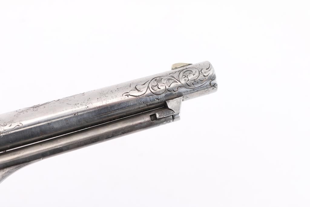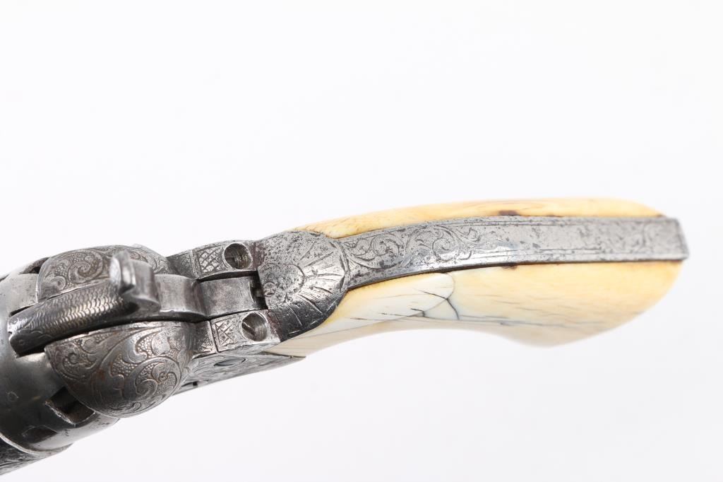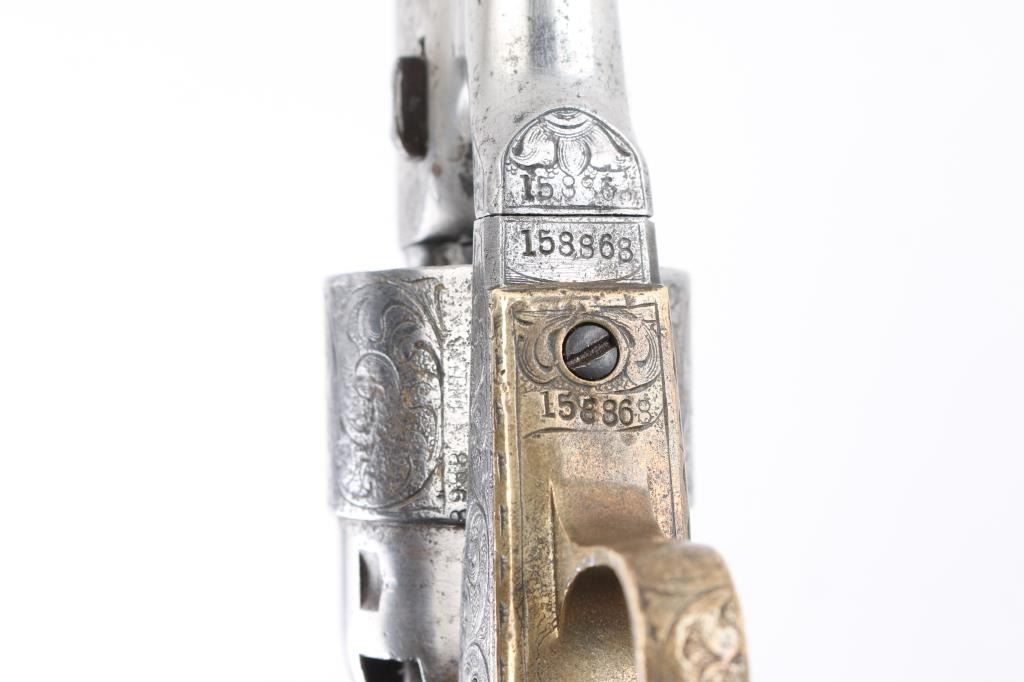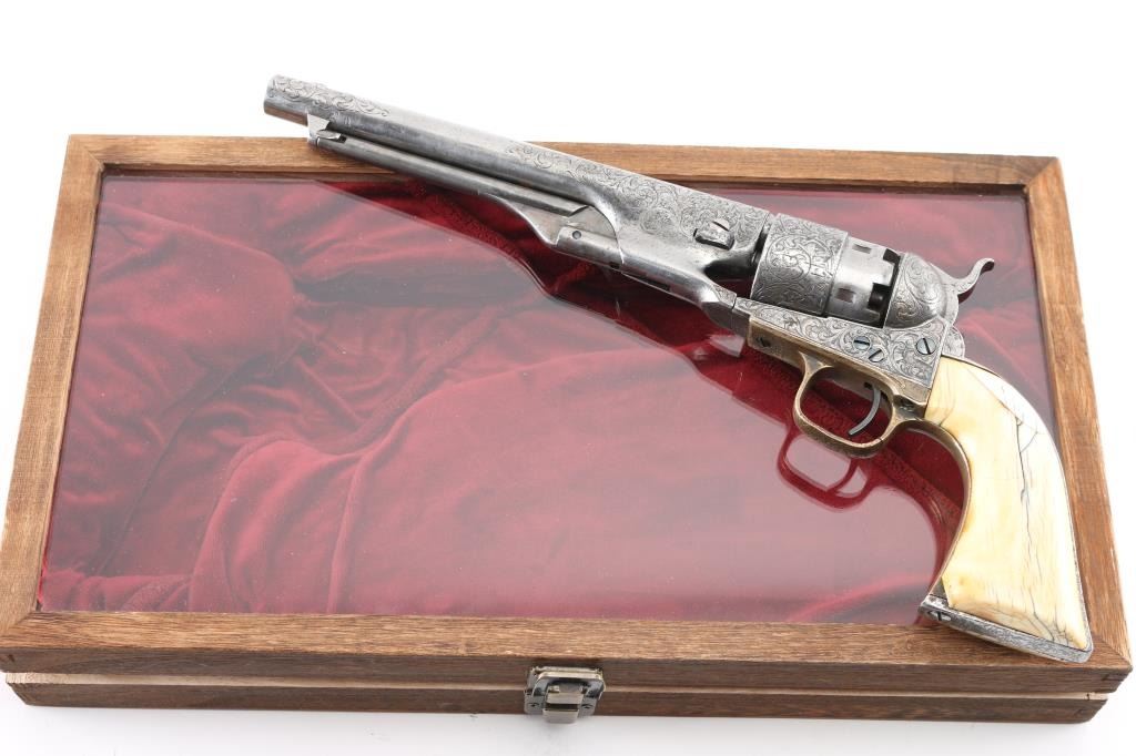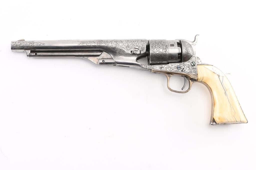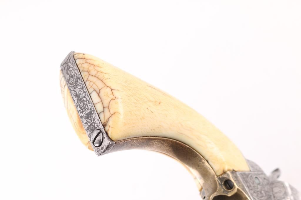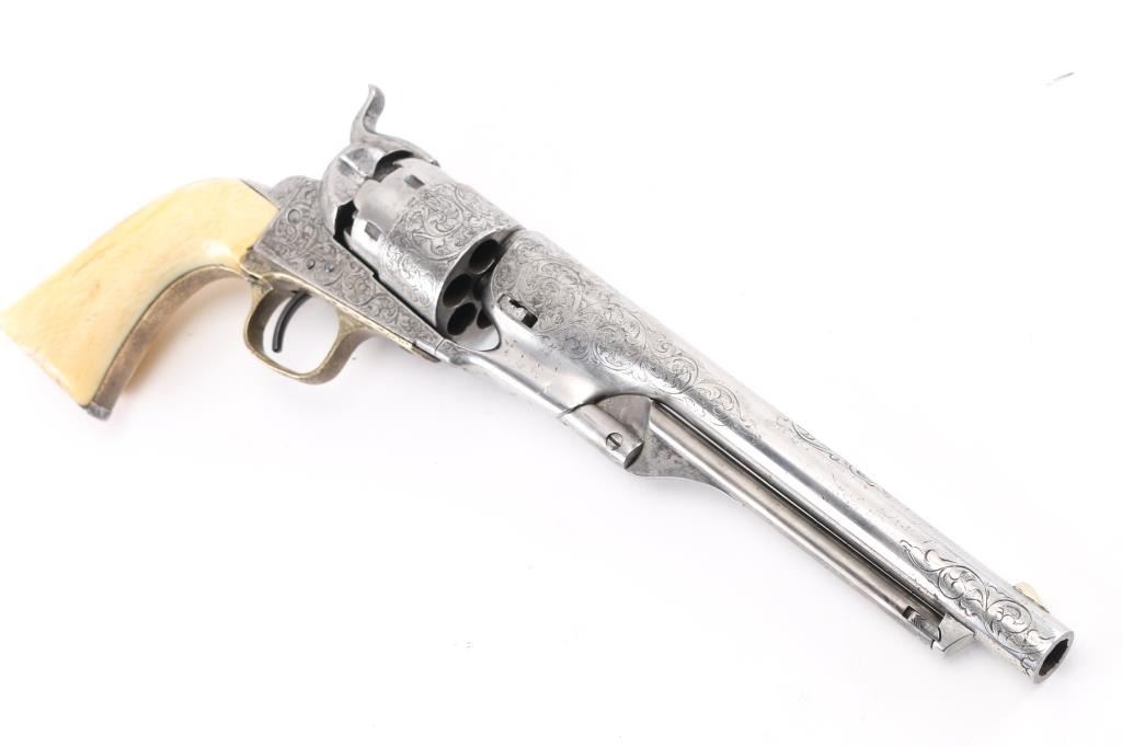 This revolver was period nickel plated and vine scroll engraved. Commercial revolver with no inspectors stamps, or cut outs for shoulder stock, manufactured 1866. It has about 60% beautiful scroll engraving reminiscent of the factory engraving of Gustave Young but probably later applied by an unknown craftsman. The cylinder naval battle scene is covered by the engraving. The ivory grips have that nice mellow yellow color from age. A little shrinkage, a small chip out of the lower left side, and a repair on the upper left side. Action works well, bore has strong rifling with scattered pitting, markings are faint, all matching serial number including the barrel wedge. Action works well, the barrel wedge screw appears to be a newer replacement. Comes in a glass topped wooden display case lined with red velvet. NRA Condition-Good. Antique Firearm.