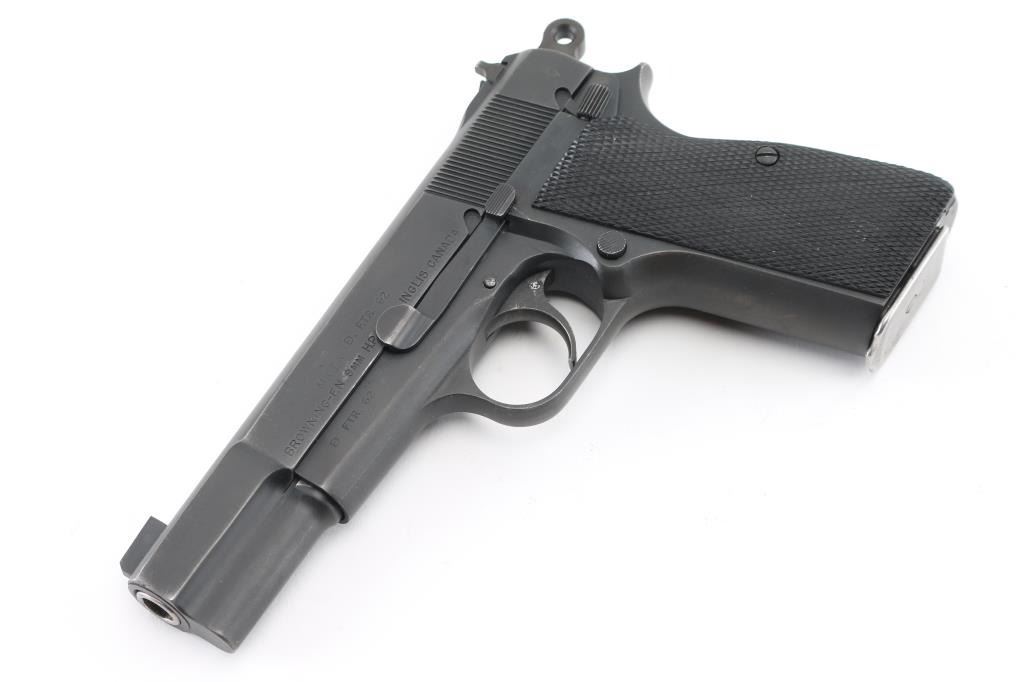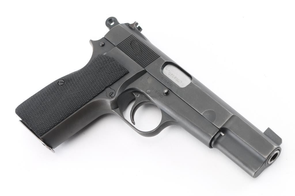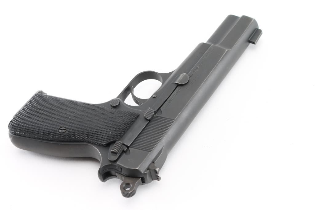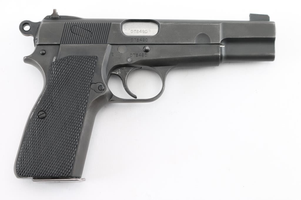 Canadian Inglis Hi Power that was manufactured in 1944-45. The British proofs on the right side of the gun indicate it was likely delivered to the British military. Faint 'Broad Arrow' on rear left slide. There are also "D FTR 62" markings on the left side of both the slide and frame. This indicates that the gun was reworked (FTR = Factory Thorough Repair) at RSAF Enfield in 1962. It was then that the barrel was likely replaced and numbered to match the rest of the gun. At the same time, it was probably given the additional British proof at the back left of the slide (typically seen with FTR guns). After the British military considered these obsolete, many of them were stored and ended up in the US. The gun is all matching and has retained about 95% of the parkerized finish with minor edge wear. No import mark. Ring hammer, fixed sights. Bore is very good/bright. Action is smooth/tight. No lanyard ring or shoulder stock slot. NRA Condition-Near Excellent. C&R Firearm.