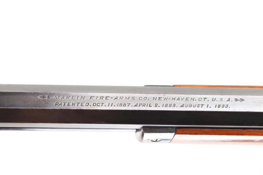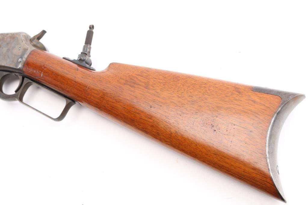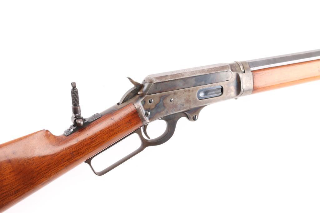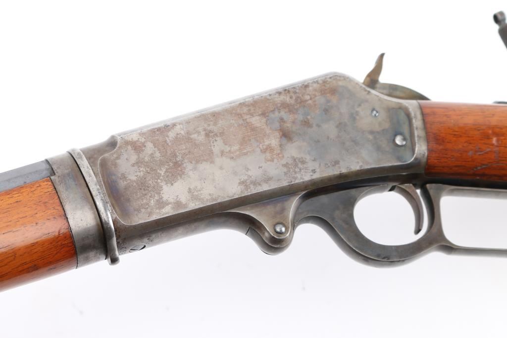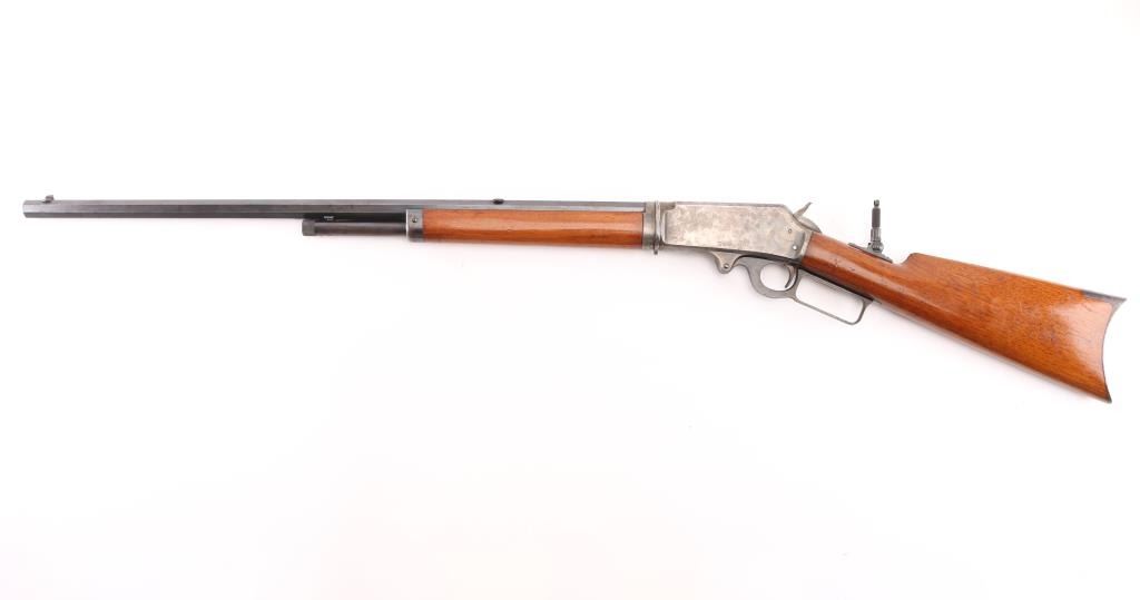 Manufactured in 1897 in takedown configuration and chambered in .38-55 caliber. The rifle is fitted with a blade front sight, rear sight removed with insert in the dovetail, tang mounted Lyman peep sight, "J" code . The 26" octagonal barrel has the two-line Marlin legend, marking, and the caliber designation at the breech. Half lenght tube magazine. The frame has a casehardened finish and is marked "MARLIN SAFETY" on top. It is mounted with a smooth walnut forearm and straight grip stock. The buttstock is fitted with a steel crescent buttplate. The bore is overall excellent/bright with a little frosting, the action is smooth. the wood stocks are very good/sound with minor scratches/dings, have been varnished at some point. The blued barrel is about 80%, dulled somewhat with minor scratches, and edge wear, some small areas of very light scattered pin-prick pitting, barely noticeable. The case colored receiver, hammer, and lever is about 20% with the rest turning a gray/brown molted patina with some scattered areas of light pitting. All markings are crisp clear. NRA Condition-Fine as Antique Firearm.