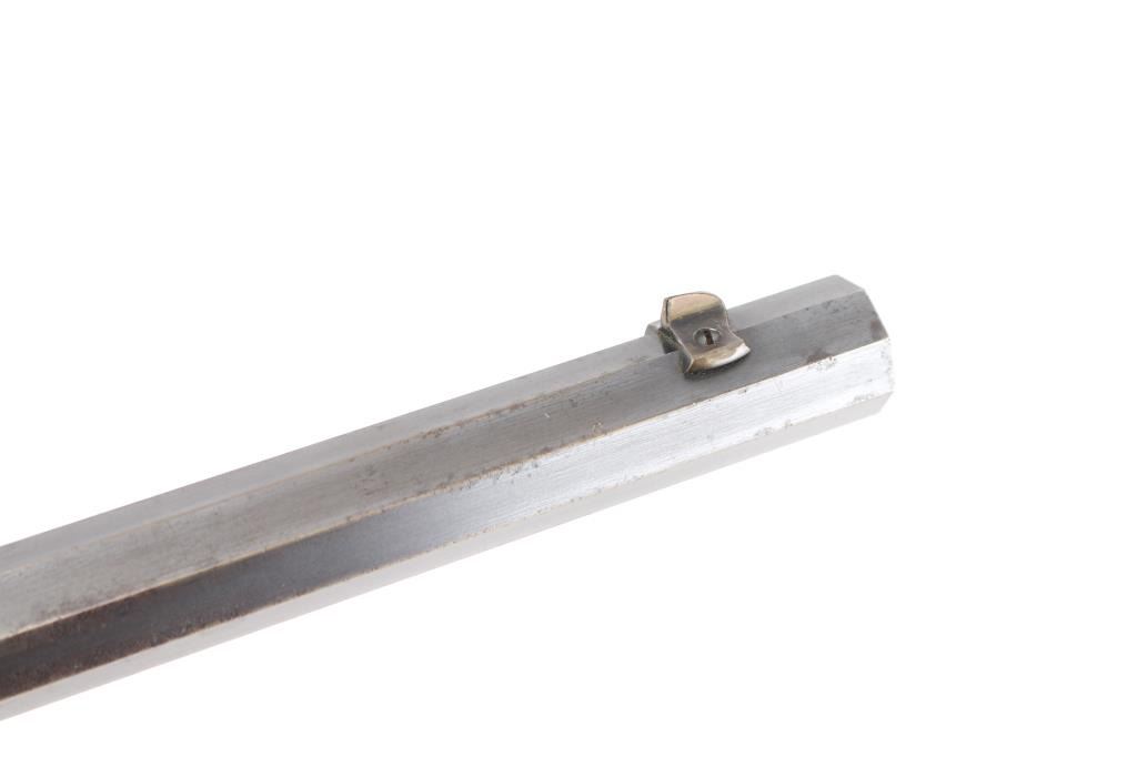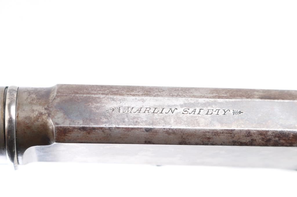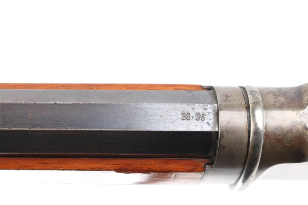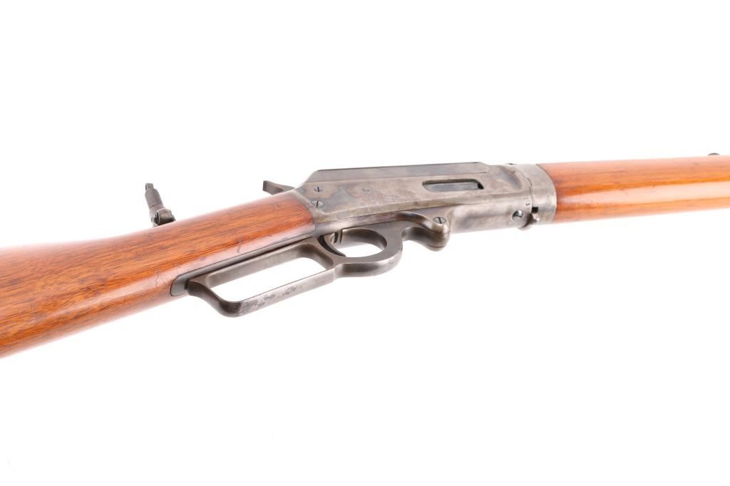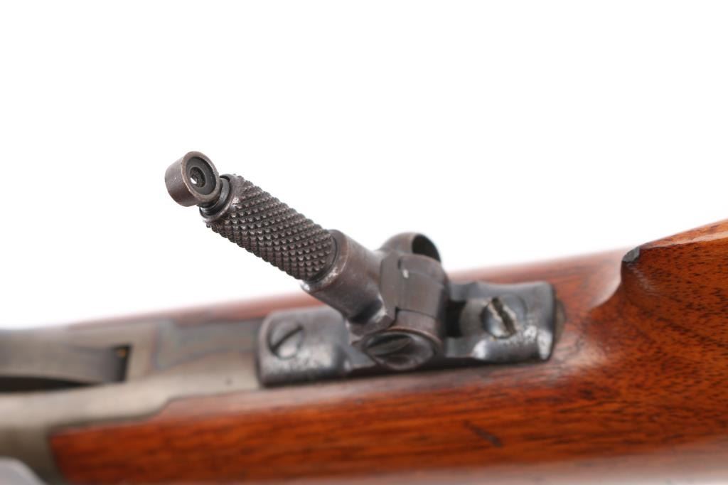 Manufactured in 1897 in takedown configuration and chambered in .38-55 caliber. The rifle is fitted with a blade front sight, rear sight removed with insert in the dovetail, tang mounted Lyman peep sight, "J" code . The 26" octagonal barrel has the two-line Marlin legend, marking, and the caliber designation at the breech. Half lenght tube magazine. The frame has a casehardened finish and is marked "MARLIN SAFETY" on top. It is mounted with a smooth walnut forearm and straight grip stock. The buttstock is fitted with a steel crescent buttplate. The bore is overall excellent/bright with a little frosting, the action is smooth. the wood stocks are very good/sound with minor scratches/dings, have been varnished at some point. The blued barrel is about 80%, dulled somewhat with minor scratches, and edge wear, some small areas of very light scattered pin-prick pitting, barely noticeable. The case colored receiver, hammer, and lever is about 20% with the rest turning a gray/brown molted patina with some scattered areas of light pitting. All markings are crisp clear. NRA Condition-Fine as Antique Firearm.