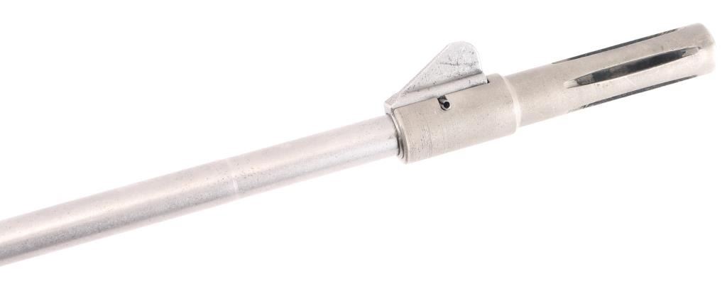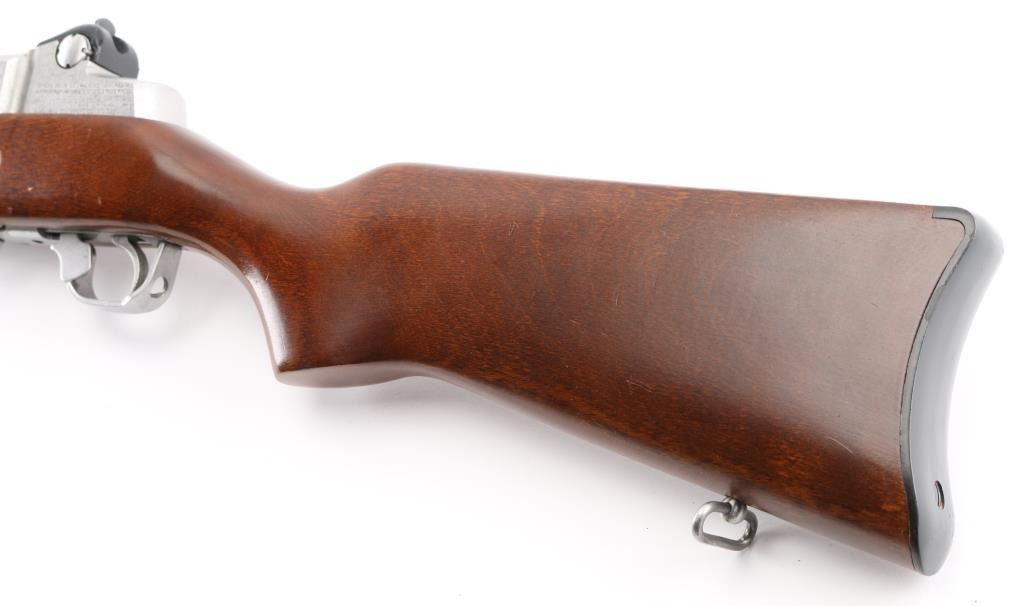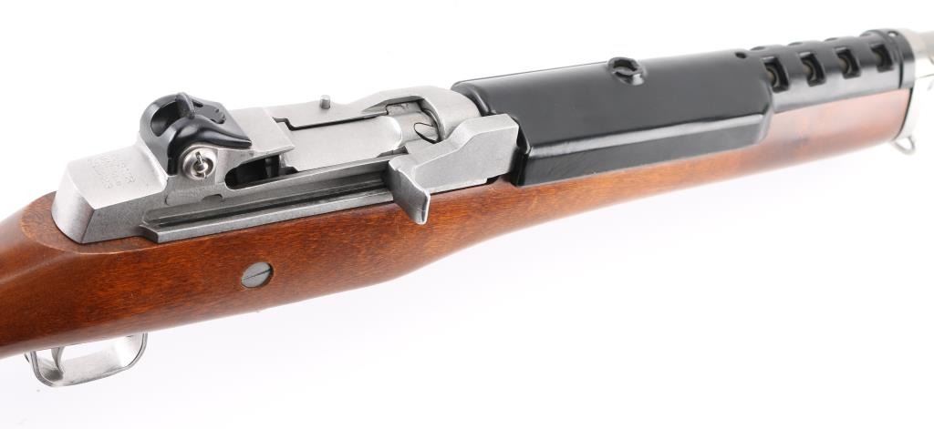 American made semi-automatic rifle chambered in .223 Rem ammunition circa 1985. It features an 18.5" polished stainless steel barrel with a 2.8" flash hider, matte stainless receiver. It has a pinned, serrated blade front sight and an adjustable rear peep sight, wood stock with swivels attached, a black plastic butt plate and black plastic top hand guard. Bore is excellent and action is smooth. Metal and wood finish are very good. bore and action are excellent. Comes with (1) 5 round metal magazine. Condition is NRA Excellent. Modern Firearm.