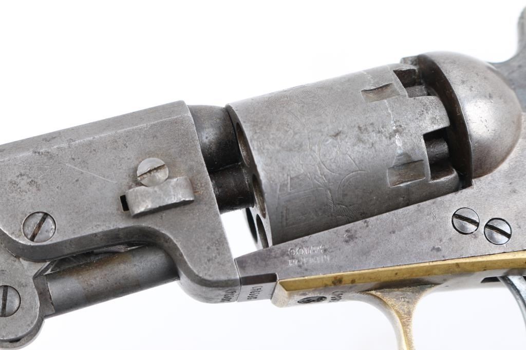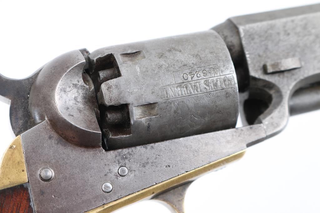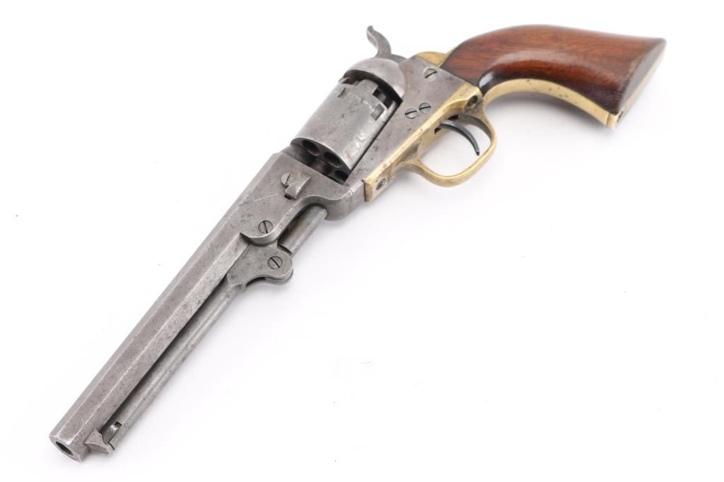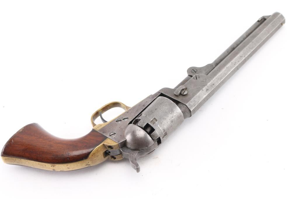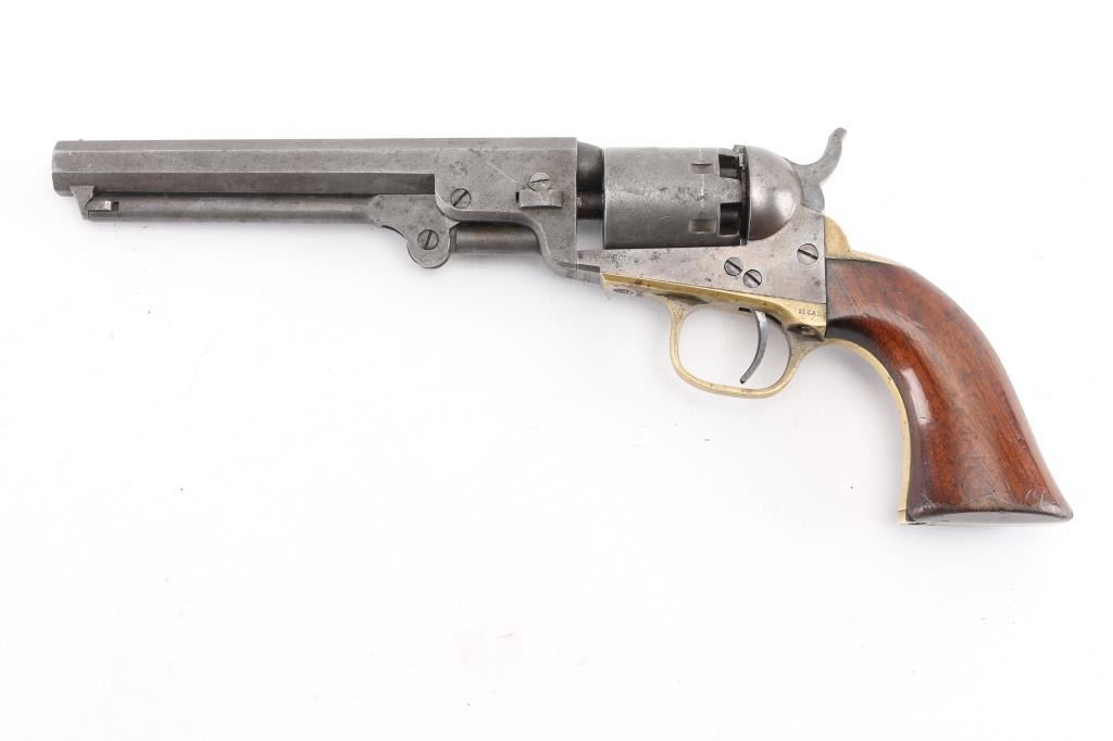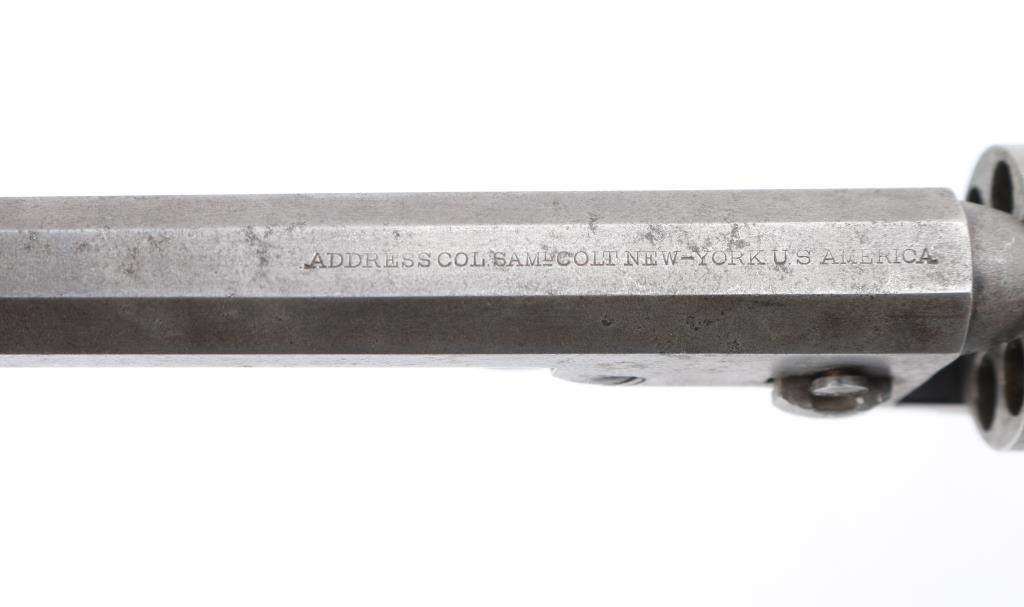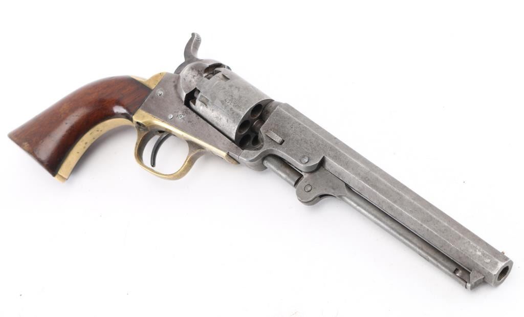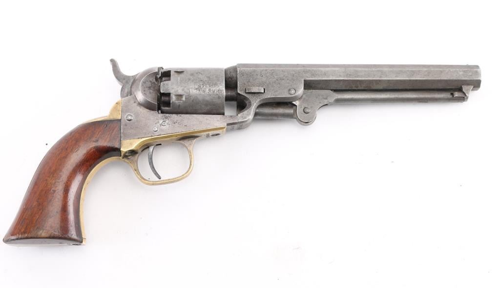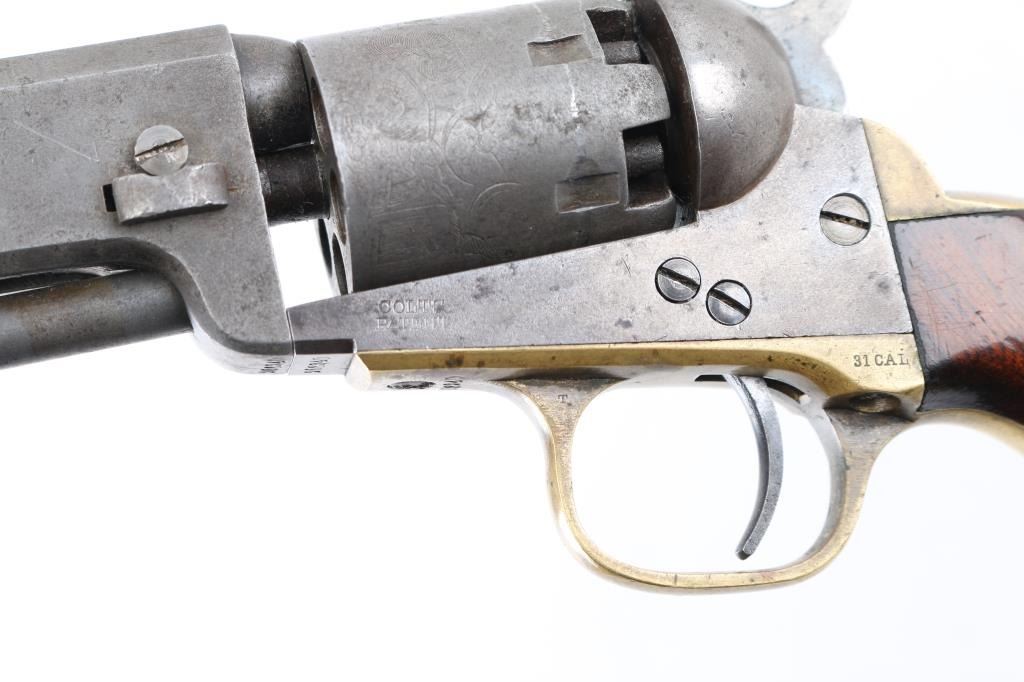 Civil War era antique single action six-shot percussion revolver cambered for .31 caliber ammunition, circa 1864. Features a 6" octagon barrel with "ADDRESS COL SAML COLT NEW-YORK U.S. AMERICA" single line address, brass bead front sight, 'v' notched rear sight on the hammer, non-fluted cylinder with roll stamped stagecoach holdup scene, loading lever, smooth trigger, knurled hammer spur, brass grip frame and one-piece walnut grip. Markings are good, cylinder scene is mostly intact but faint. and all serial numbers are matching, could not get barrel wedge out. Left frame stamped "Colts Patent", left trigger guard stamped "31 Cal". Revolver shows the metal surfaces turned to a nice aged grey patina with some scattered brown tones. Action performs well. nipples are good, bore is fair, rifling present, and the wood grip is very good, has been varnished. The barrel wedge screw and the rear frame screw appear to be newer replacements. Condition is NRA very good. Antique Firearm