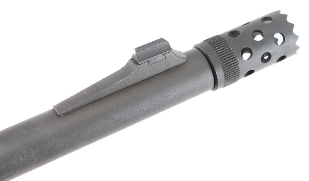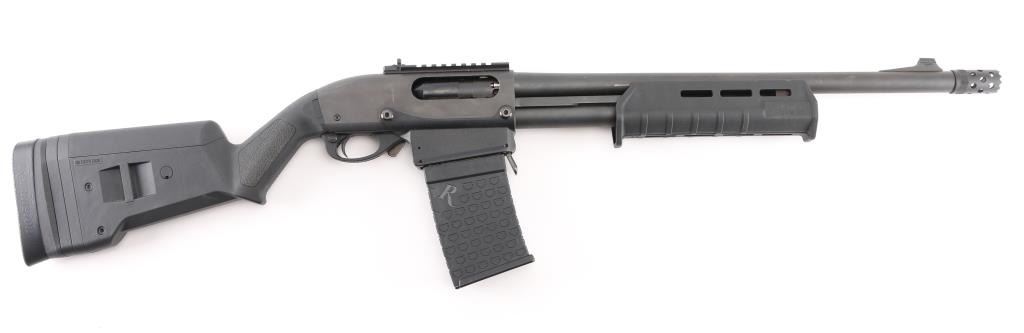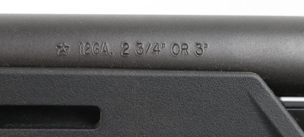 Pump/slide action magazine fed tactical shotgun chambered in 12 Ga for 2 ¾” or 3” shells. Features matte black finish,18 1/2" barrel with stand-off muzzle break, fixed cylinder choke, serrated ramped blade front sight with tritium insert, peep rear sight with 4 1/4" Picatinny rail, lever magazine release, push button safety, Magpul SGA stock and Magpul MOE fore-end. Comes with (1) 6 round magazine. Bore and action are excellent. Condition is NRA Excellent. Modern Firearm.