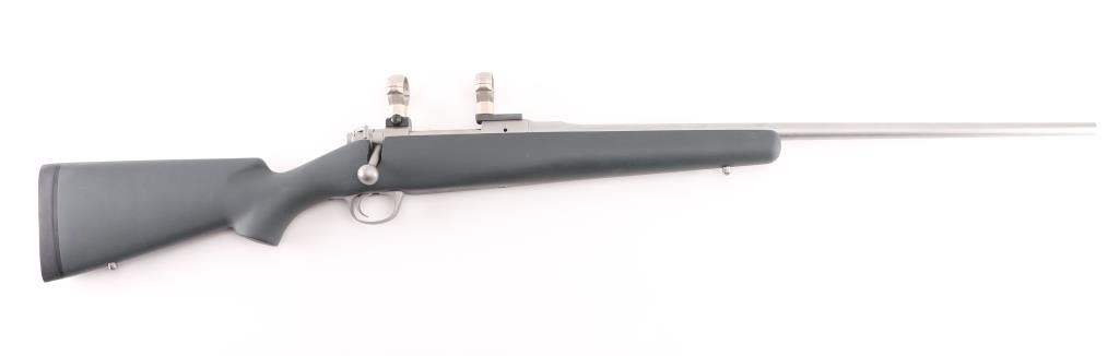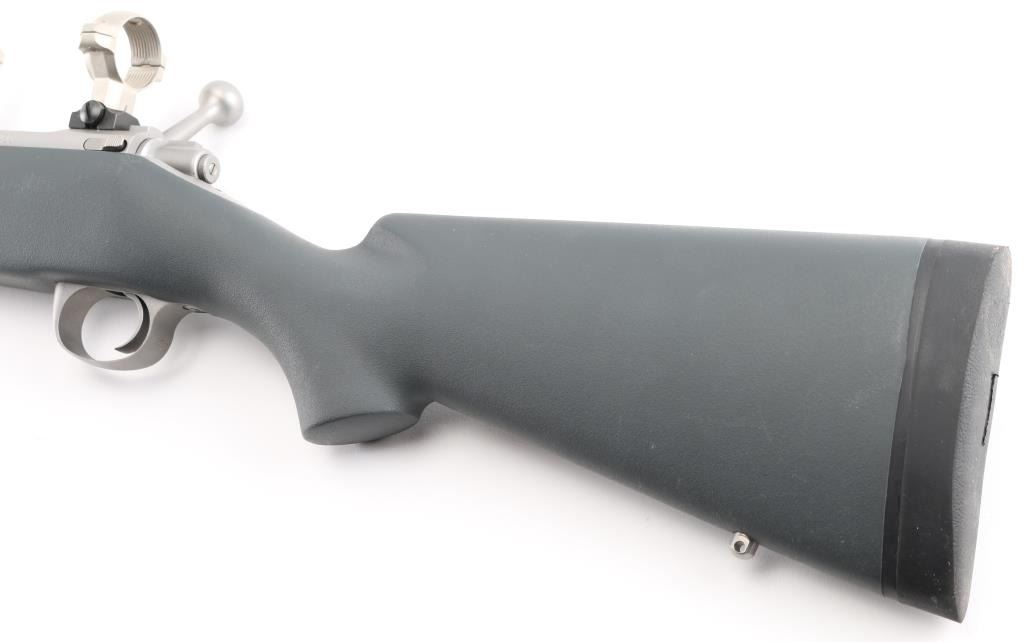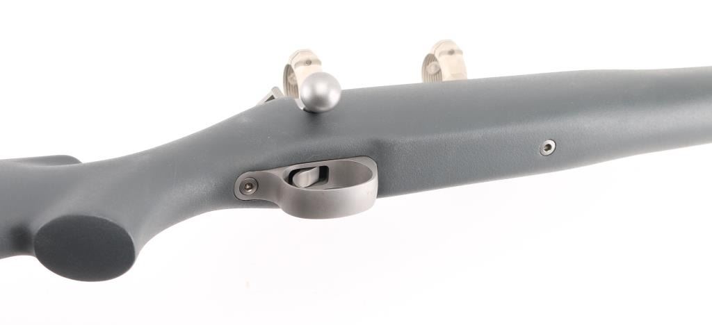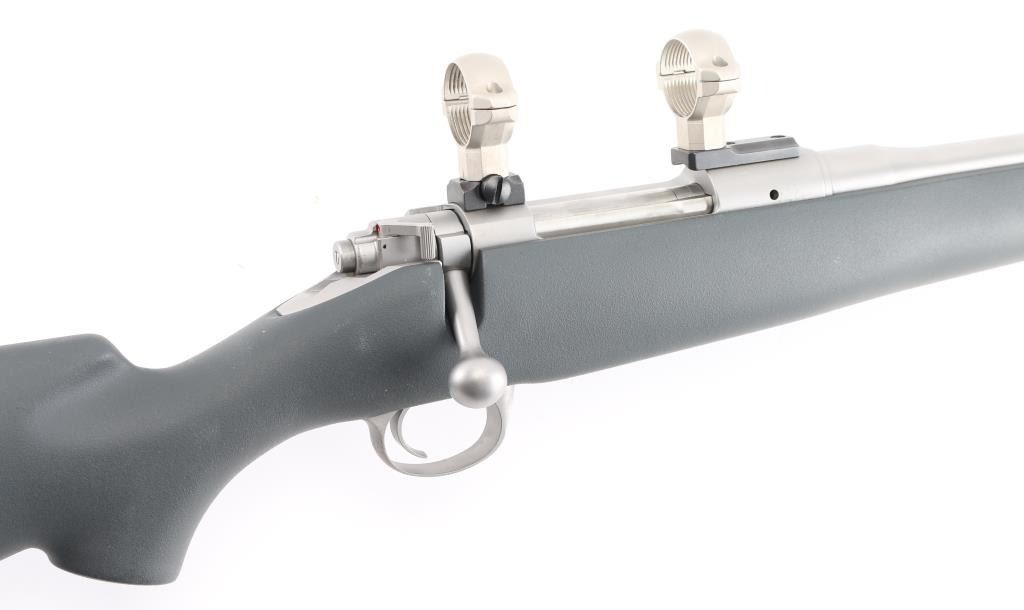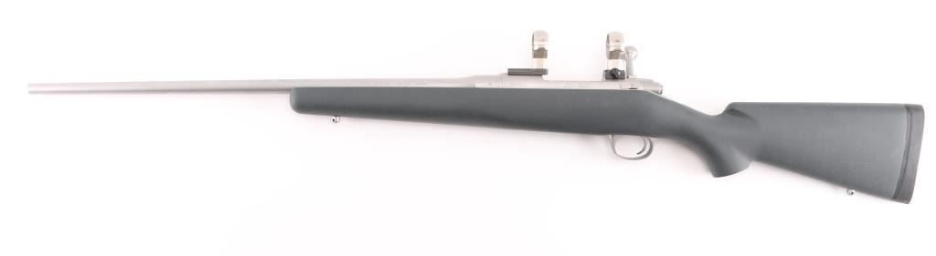 Bolt action Montana model rifle, 24" stainless steel barrel, gray plain pistol grip synthetic stock with sling swivel studs, no sights, drilled and tapped for scope. Tiny rust spots on middle top and bottom area of barrel. Bore and action are excellent. Bore is slightly dirty. Comes with stainless steel 30MM scope rings. Condition is NRA Excellent. Modern Firearm.