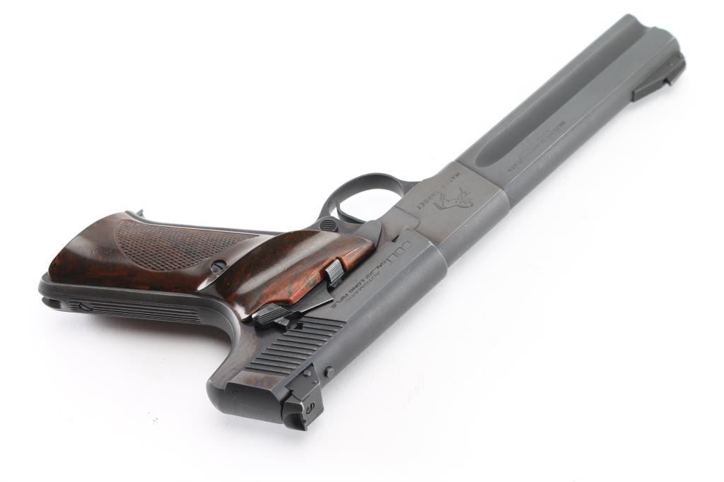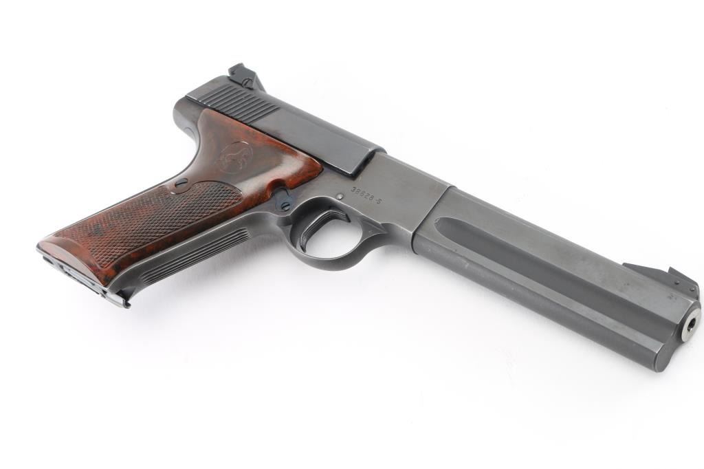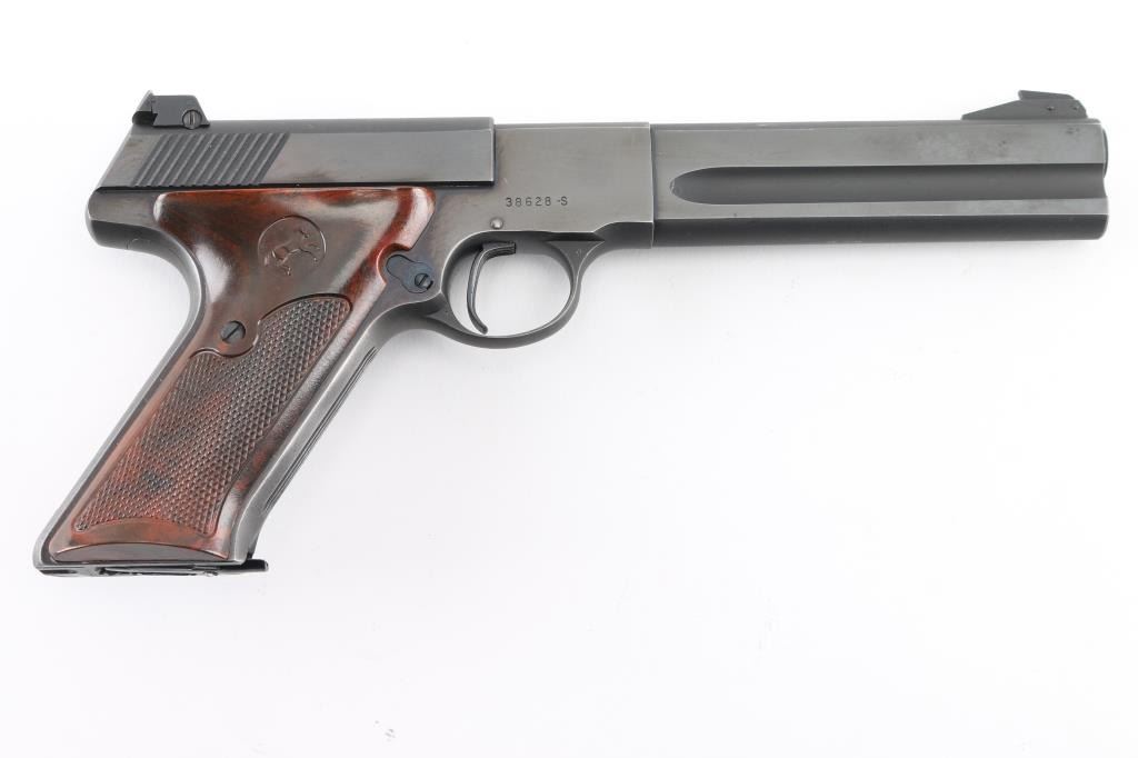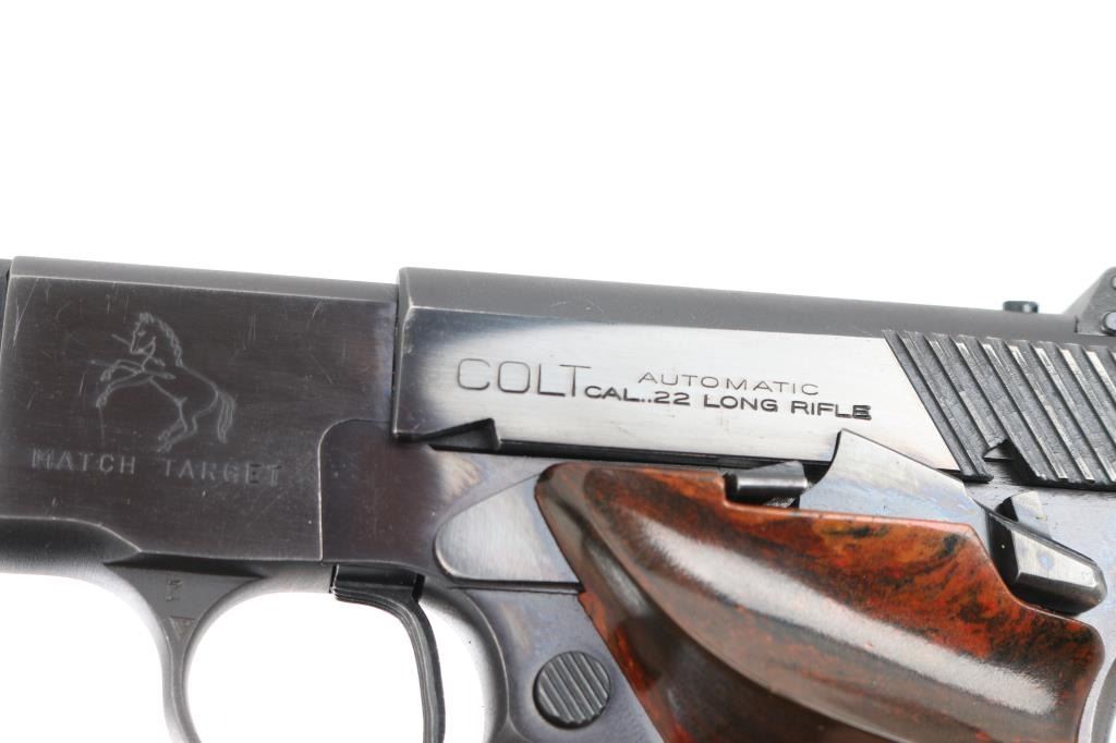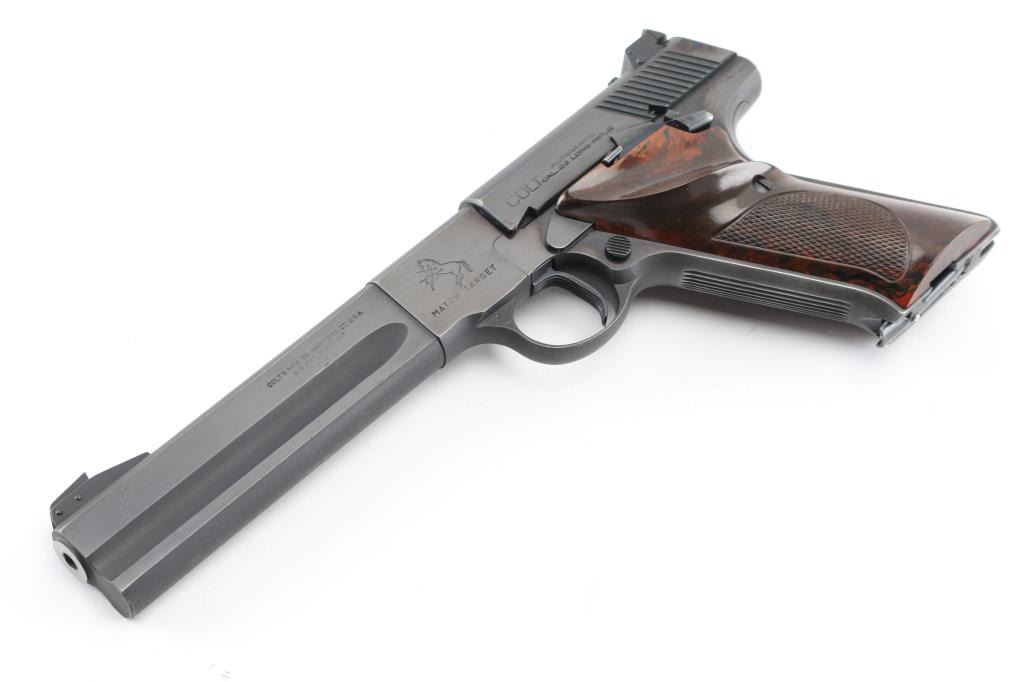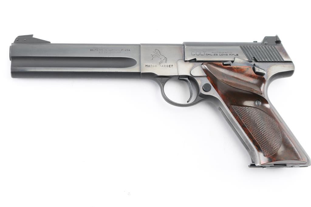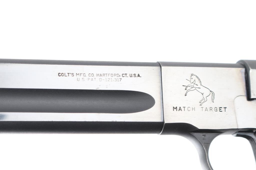 SN: 38628S. Sport' Semiautomatic rimfire pistol manufactured circa 1950, second series. Features blued finish, checkered 'Coltwood' grips with thumbrest on the left panel, Rampant Colt on the right panel. 6" barrel, Partridge front & adjustable rear sights, push button magazine release, manual safety. Smooth trigger, serrated fore strap. Bore is excellent, needs cleaning. Retains 85% finish with minor scratches, and handling loss to the straps. Grips are excellent condition. Markings include "MATCH TARGET" under Rampant Colt. Markings are crisp and even. Includes two grip adapters. Condition is NRA Very Good. C&R Firearm.