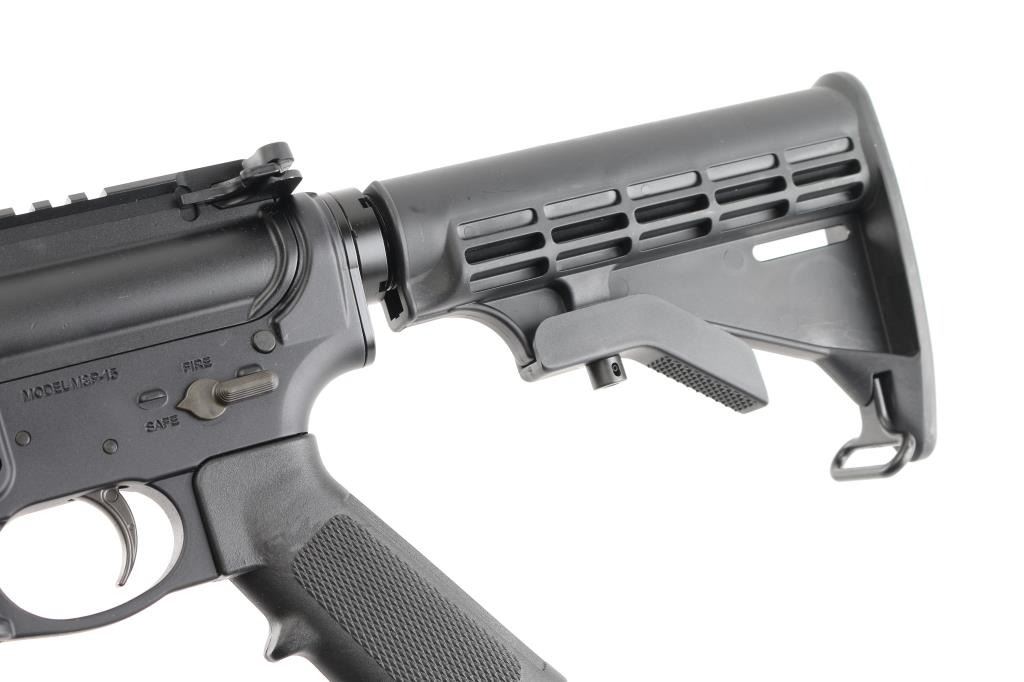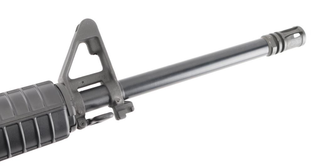 AR platform semi-automatic rifle,16" barrel with 1:9 twist with front sight post and bayonet lug, A2 flash hider, mil-spec handrails, 6 position collapsible stock, sling swivels, flat-top upper receiver with manual safety, brass deflector, forward assist and charging handle. Condition is NRA Excellent. Modern Firearm.