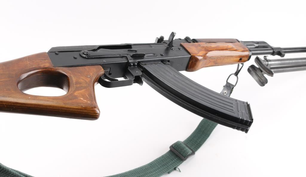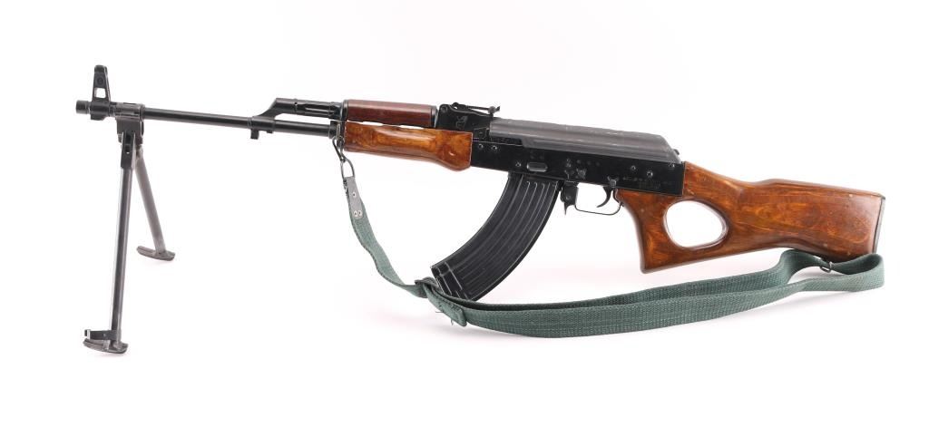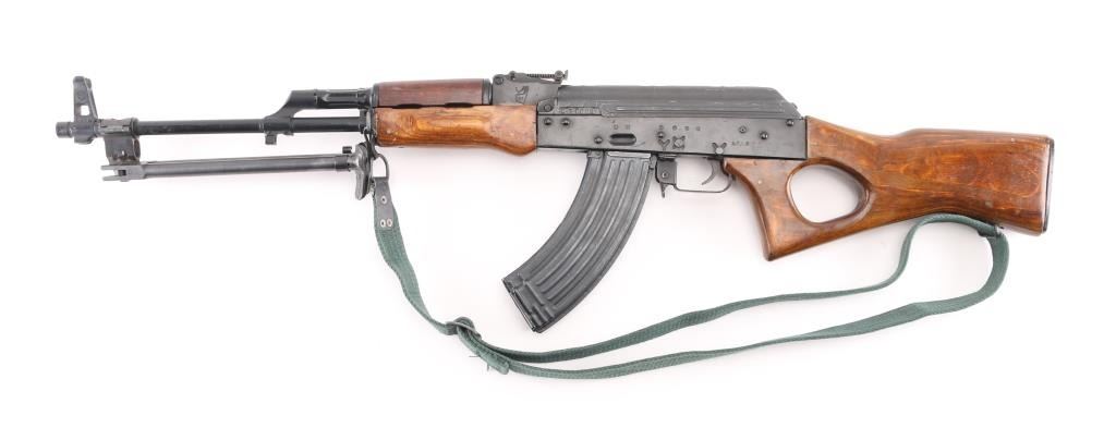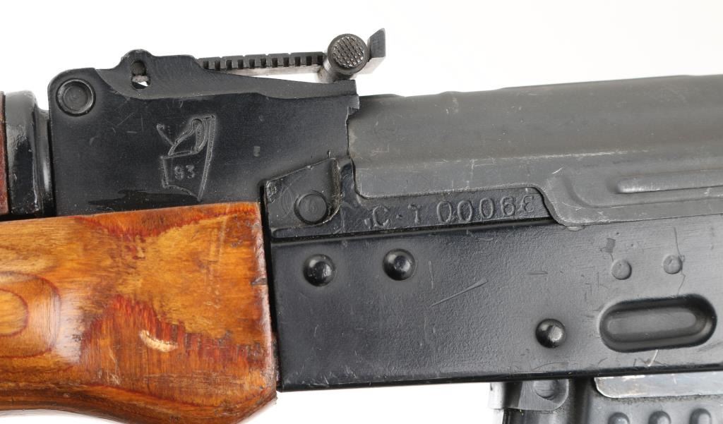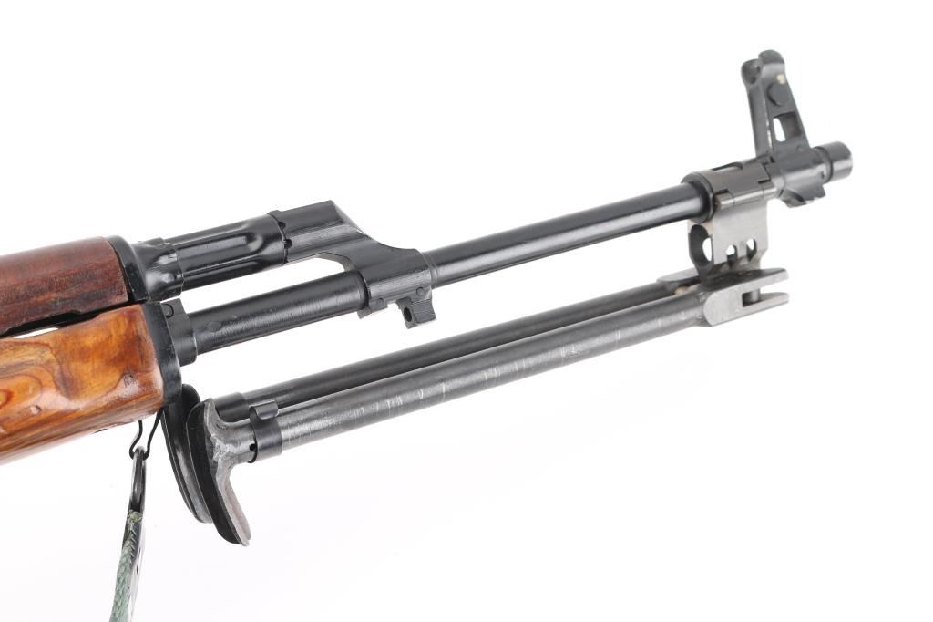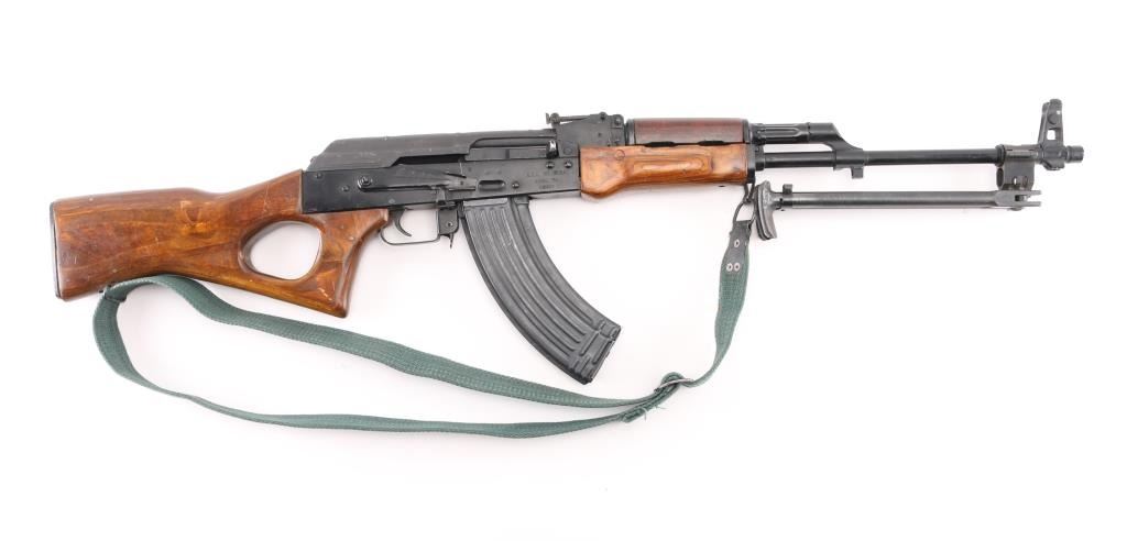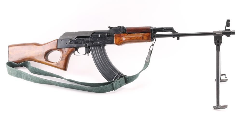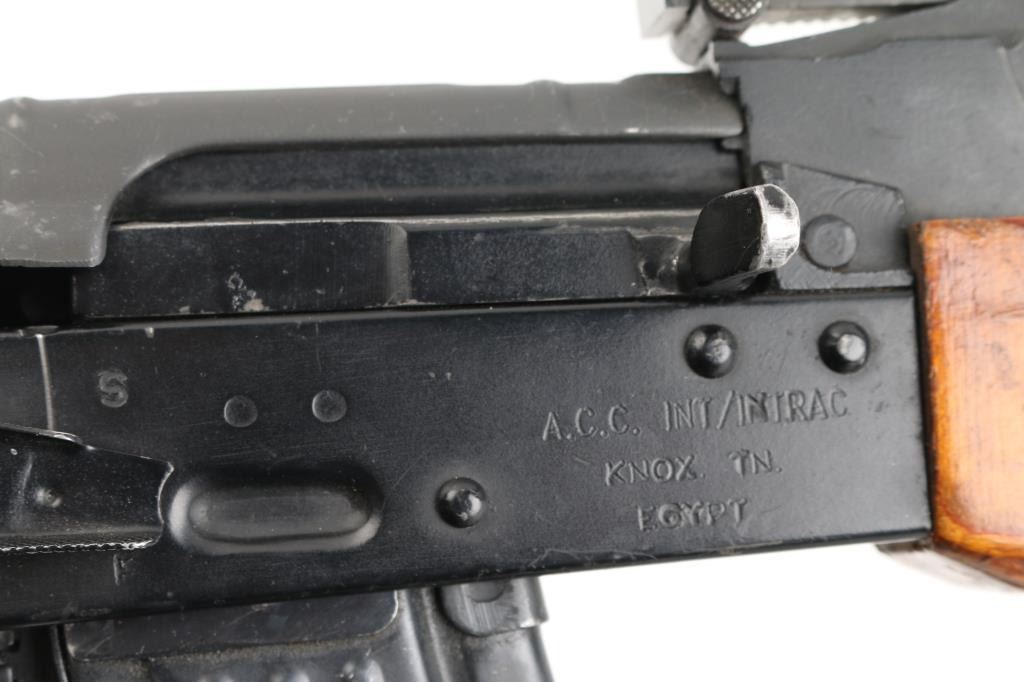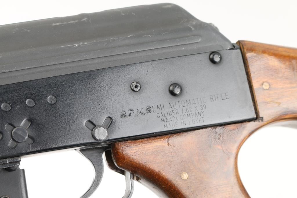 Semiautomatic RPK (squad support version of the AKM) type rifle rifle manufactured by the Egyptian government's MAADI Company, imported by ACC International/Intrac, Knoxville TN. Features black paint finish, parkerized ribbed top cover, laminated wood hand guards & thumbhole stock, trapdoor in butt (no cleaning kit present), original 20" barrel, folding bipod, muzzle cap welded over threaded muzzle, no cleaning rod, bayonet lug "ears" machined off, adjustable front protected post and tangent rear sights, manual safety, sling swivels. Bore is very good bright condition. Metal surfaces retain 95% finish with handling marks, scratches. Wood is very good condition. Rear sight block marked with "93" inside ancient Egyptian military headgear symbol. Bolt & carrier numbered "0066". Includes very good condition proper Egyptian dark green web sling, one 30 rd magazine. Condition is near NRA Excellent *** Modern Firearm ***