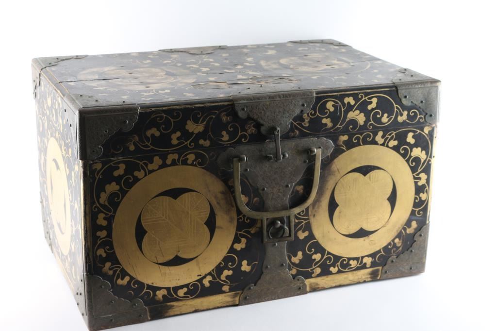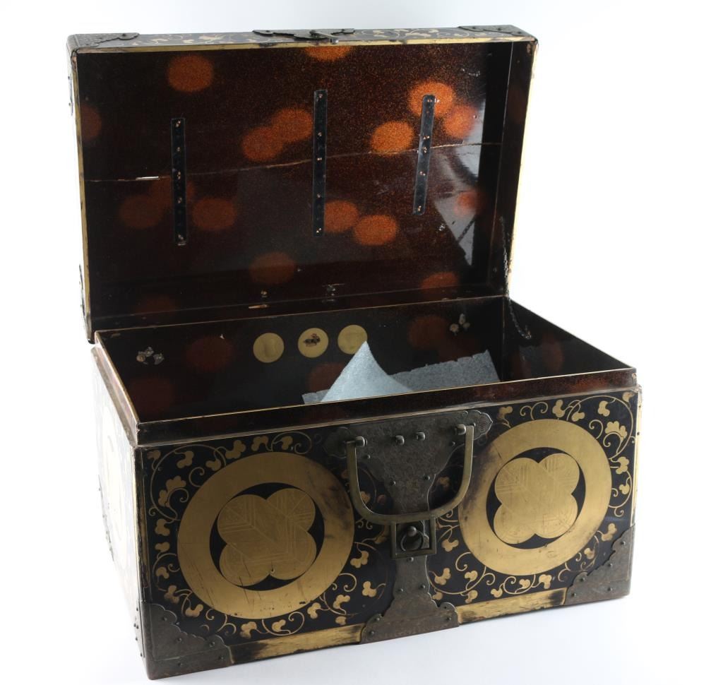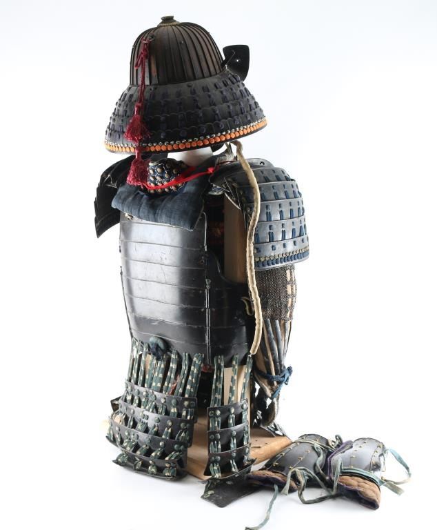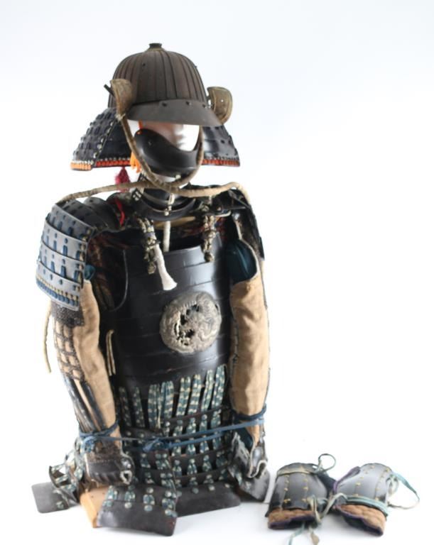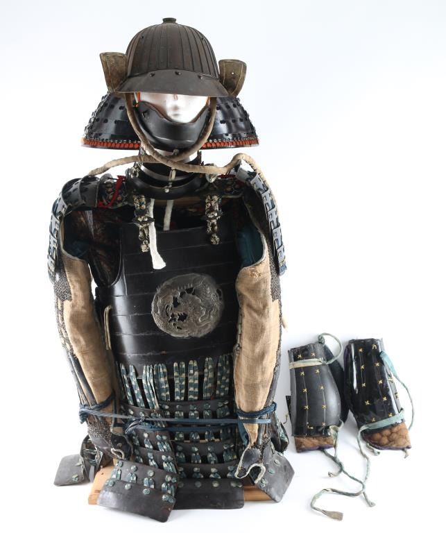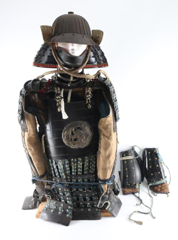 Plain Mempo is a general term for these half mask-like face guards of warriors jutting chin and signalizing determination. The neck protection (Suga)composed of three plates (Lame) Suspended loosely by white laces. Exterior black, interior red lacquering. Pegs for nose peice. Has Ase-Hagashi-No-Ana in chin. (perspiration dripping holes), 32 plate black Tetsu (Iron) Suji Bachi helmet, raised ribs where plates join, each plate is connected with six hammered rivets. There is four protruding rivets around the crown.The Tehen (Central top piece) is five layered. and the Mabisashi (Visor) has three large rivets, and the traditional red lacquer on the underside. Has no Haraidate, fore crest holder, but has Wakidate-No-Tsunomoto, side crest holders. Agemaki bow attached to ASgemaki No Can (Loop) at rear of helmet. Shikoro (neck protector) has four leather plates (Lame) closely secured with pairs of blue slik laces in the Sugake style, the top lame is turned back to form the Fukigayeshi, covered with Dutch leather, missing Mons. Its overall shape is known as akoda-nari due to its resemblance to the akoda, a squash-like fruit. Overall very good condition. Has liner, & chinstrap. Black Lacquered Do (Cuirass), seven plate breast plate with metal coiled Dragon Mon, about 6 inches in diameter, hinged four plate side plates, & eight plate back plate, hammered rivet construction. 6 Lame Sode (Shoulder Guards) connected with with pairs of blue silk laces in the Sugake style. Armored sleeves (Kote) is protection for the arms, & hands. Shoulder area consists of chain mail with six intergraded lacquered metal plates, six long lacquered metal plates on the forearm connected with chain mail, and three lacquered plates with chain mail on the hands. The thigh guards (Haidate) are attached to the Do (Cuirass by means of double, & triple blue and white silk laces, consisting of seven sections of five lacquered metal plates each (Lame) Pair of shin guards (Suneate) with five lacquered metal plates each, padded material with images of a dragonfly, & black leather, loops intact. The stitching on one of the plates has come loose. Comes with a EDO period Gusoku Bitso (Armor Box) Black lacquered box with gold motifs, measures 25 1/2" H, 17" W, & 14 1/2" H., two large lifting handles, engraved metal fittings on corners. There are large family crests (Mons) Eight total with two on the lid, two front & back, and one on each side. The Mon is Maru Chigai Takanoha, the crossing of a pair of hawk feathers. Overall sound, but the lid is cracked with some damage to the lacquer.