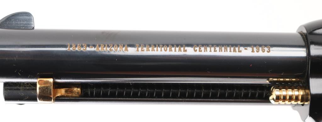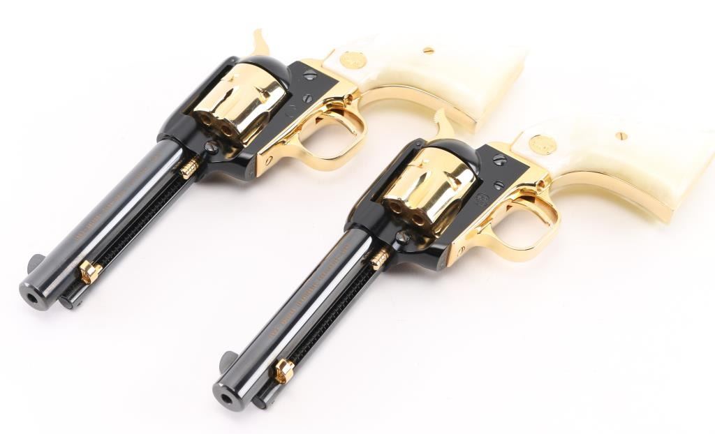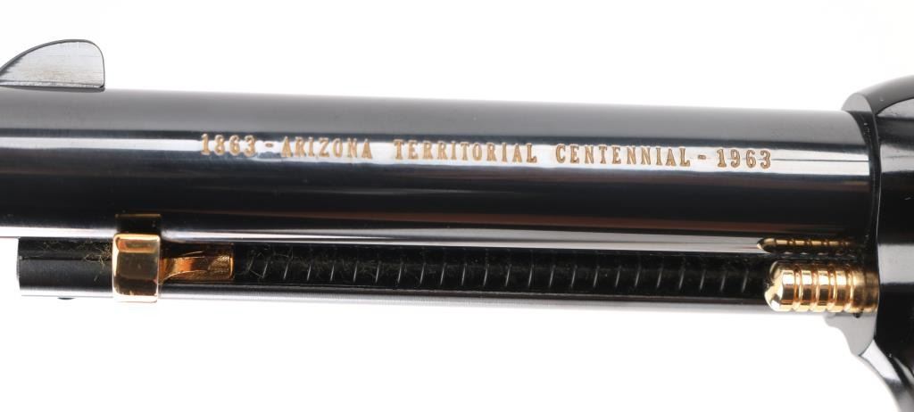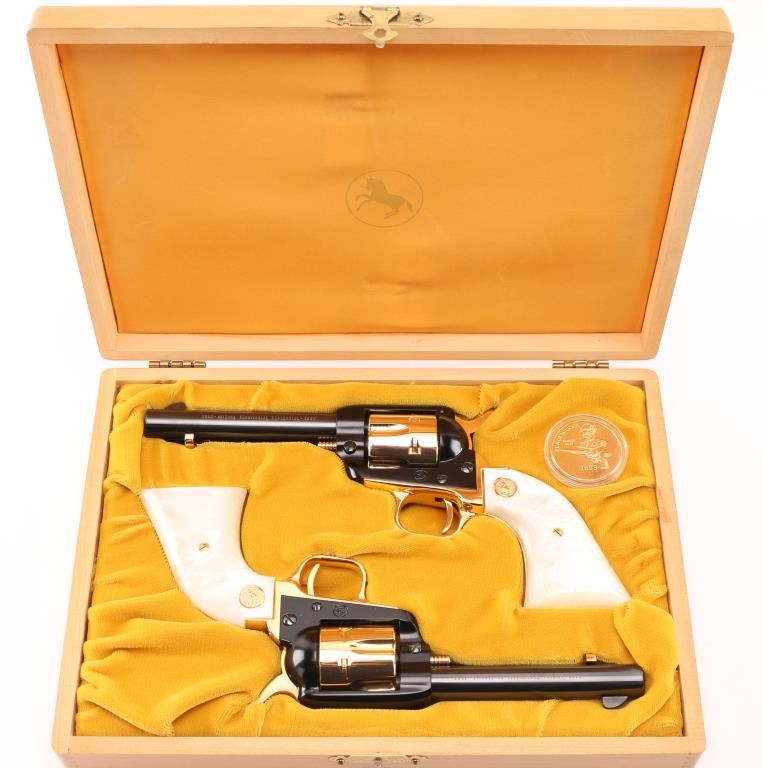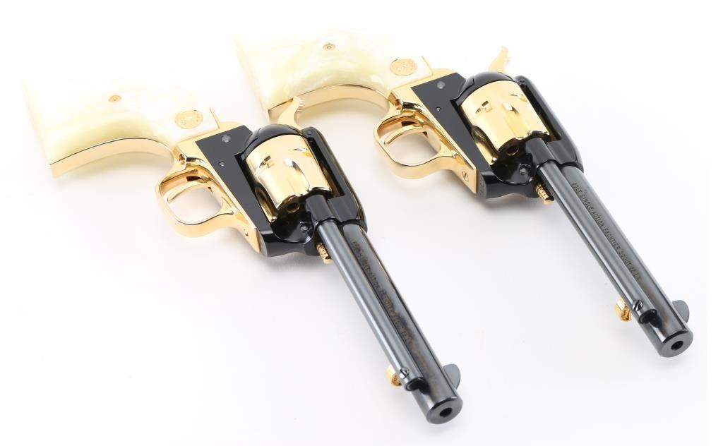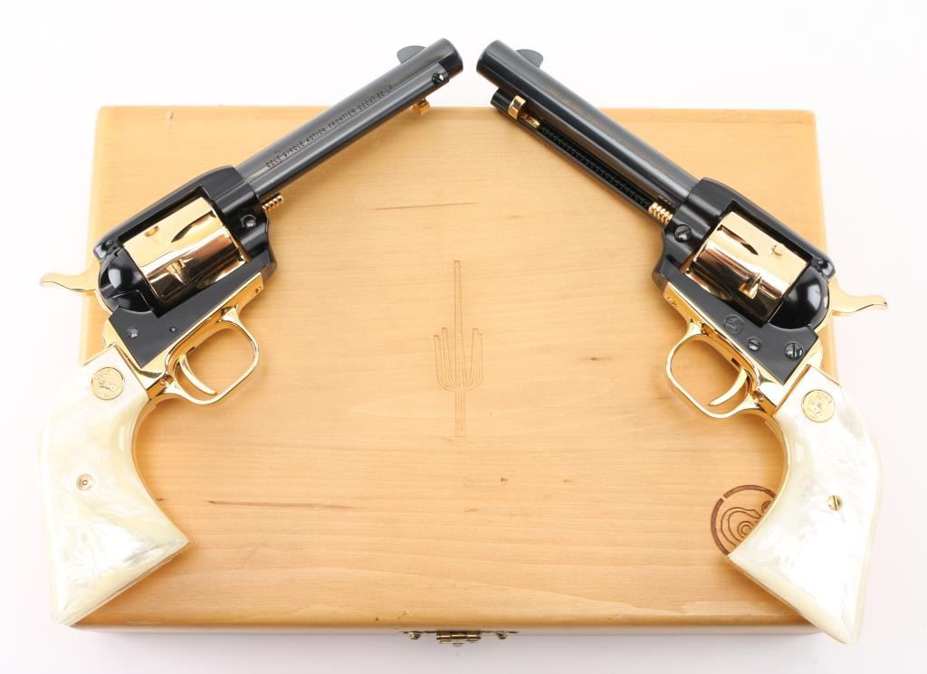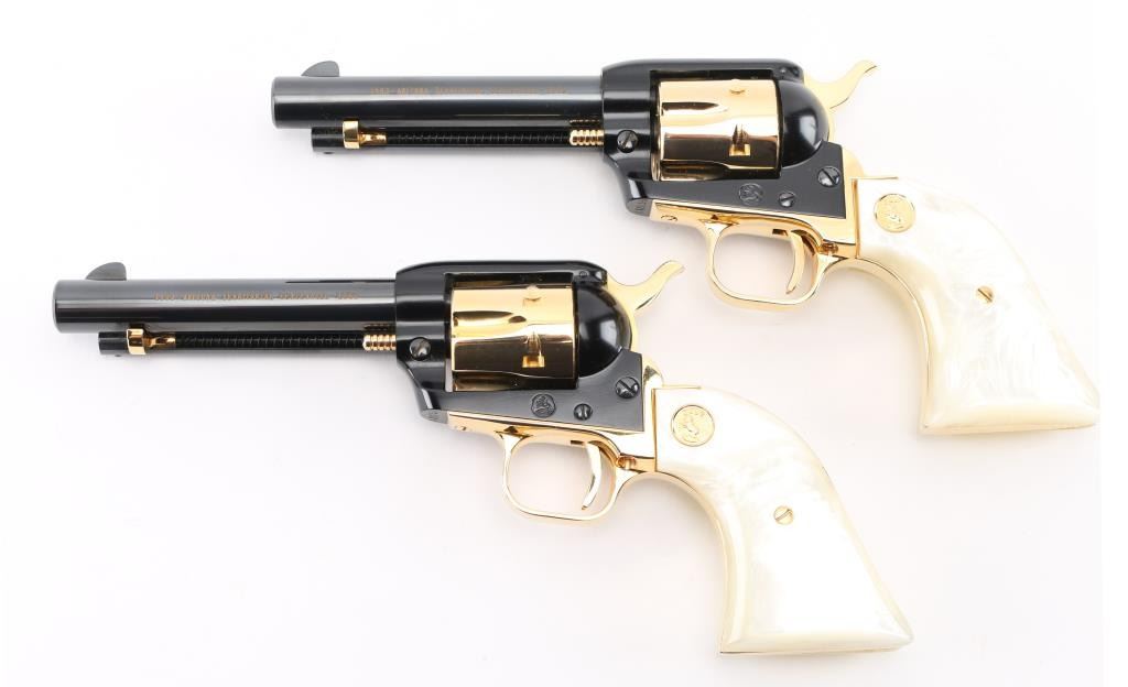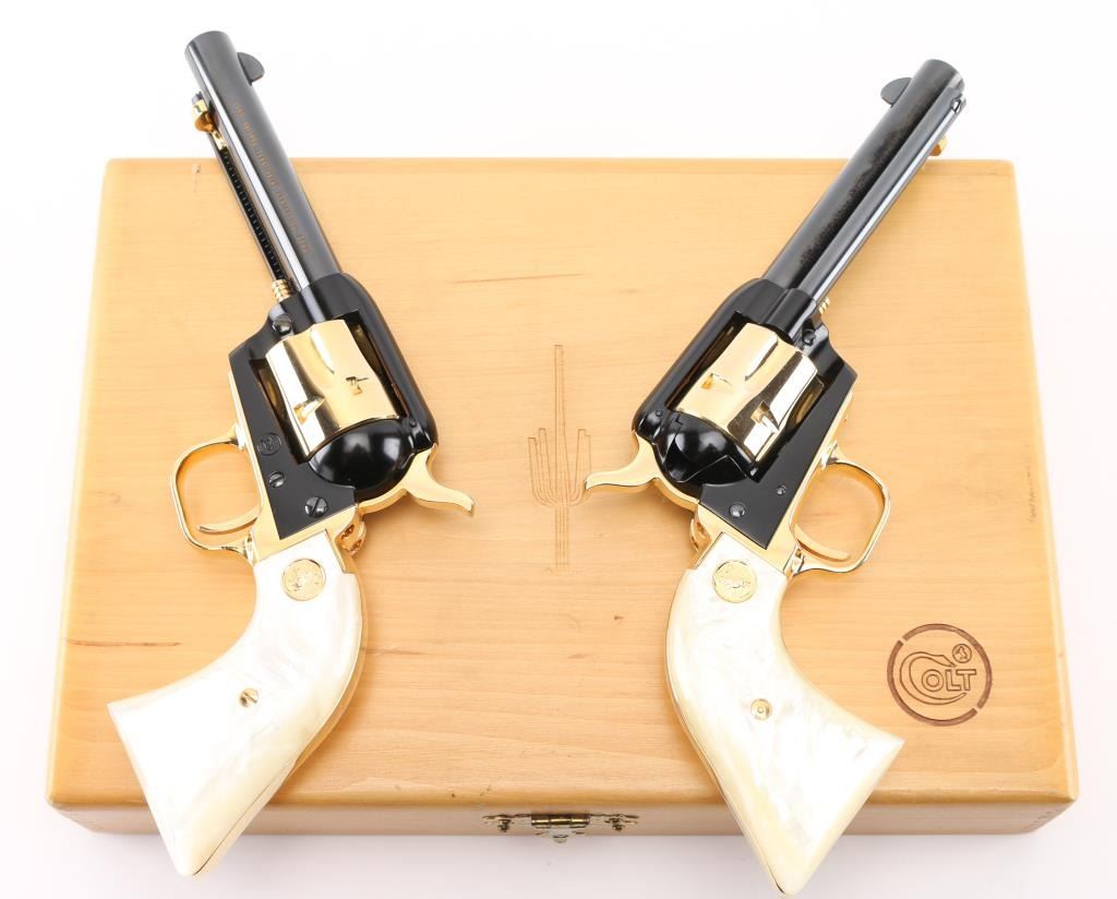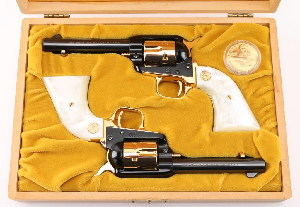 SN:AT2055 & AT2056. Only 5,355 were made and are extremely hard to find as a consecutive boxed set. Beautiful, set of consecutive serial numbered Frontier Scouts chambered in 22 LR, They have 4.75" barrels, black frames and barrels. Gold cylinder, trigger guard trigger (smooth), grip frame, and hammer with knurled spur. Gold lettering on left side of both barrels "1863 Arizona Territorial Centennial 1963". The grips are faux pearl with gold Colt medallion. Bottom of grip frame is engraved. Both look like new. Comes with a wood presentation case with a cactus in the middle of the lid, a Colt logo on the right corner, and a gold velvet lining. Box is in good condition, with some minor dings and scratches. Bores are great. Metal finish is near perfect with no drag lines on the cylinder and no signs of use and minor handling. Grips are fine. Condition is NRA Perfect. *C&R Firearm*