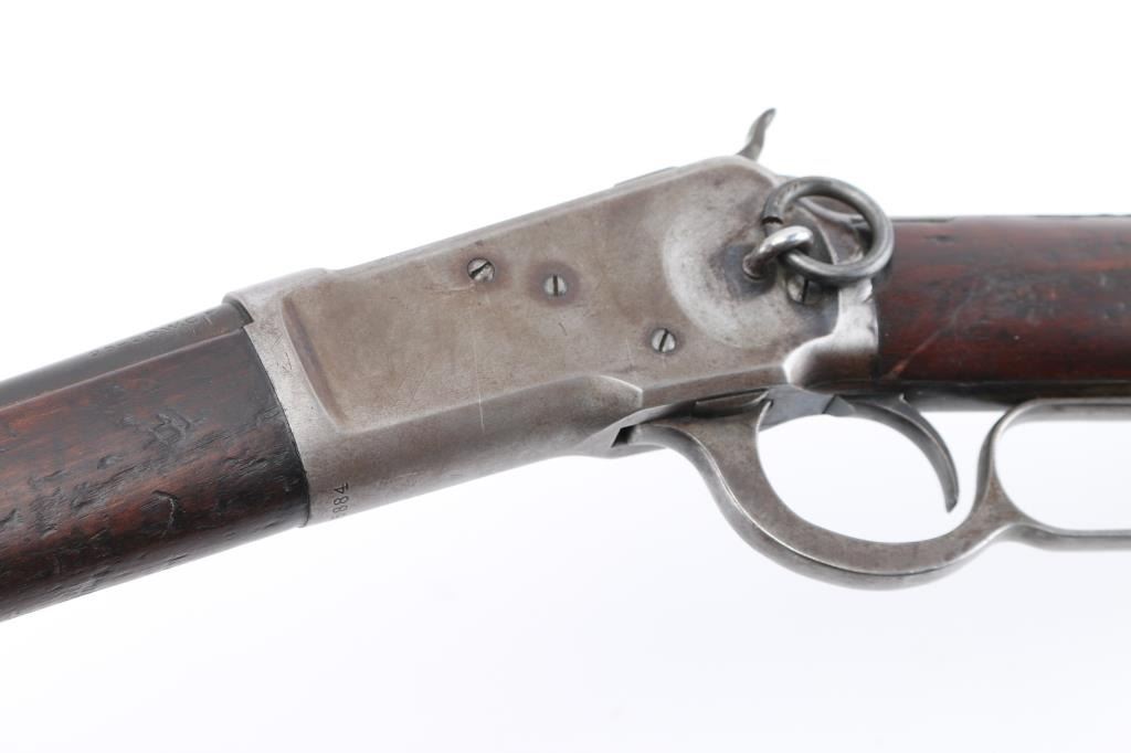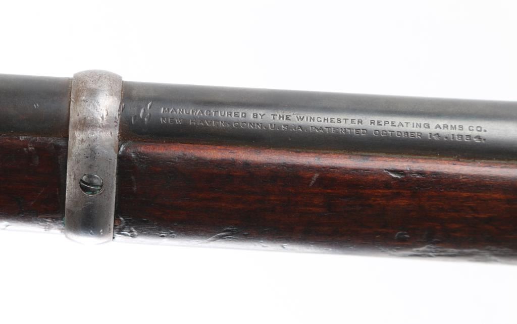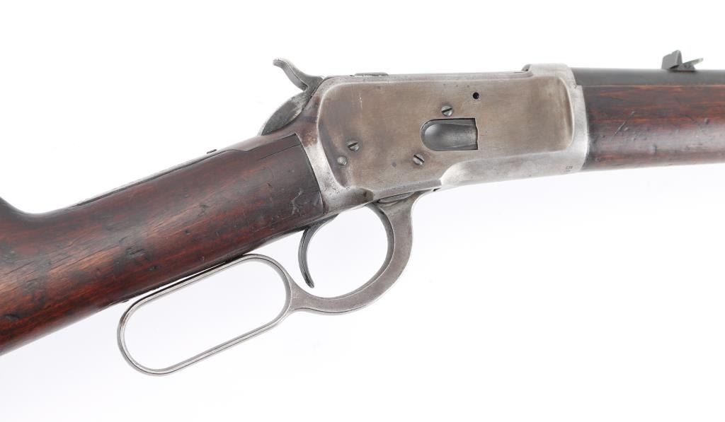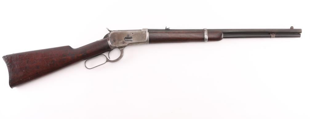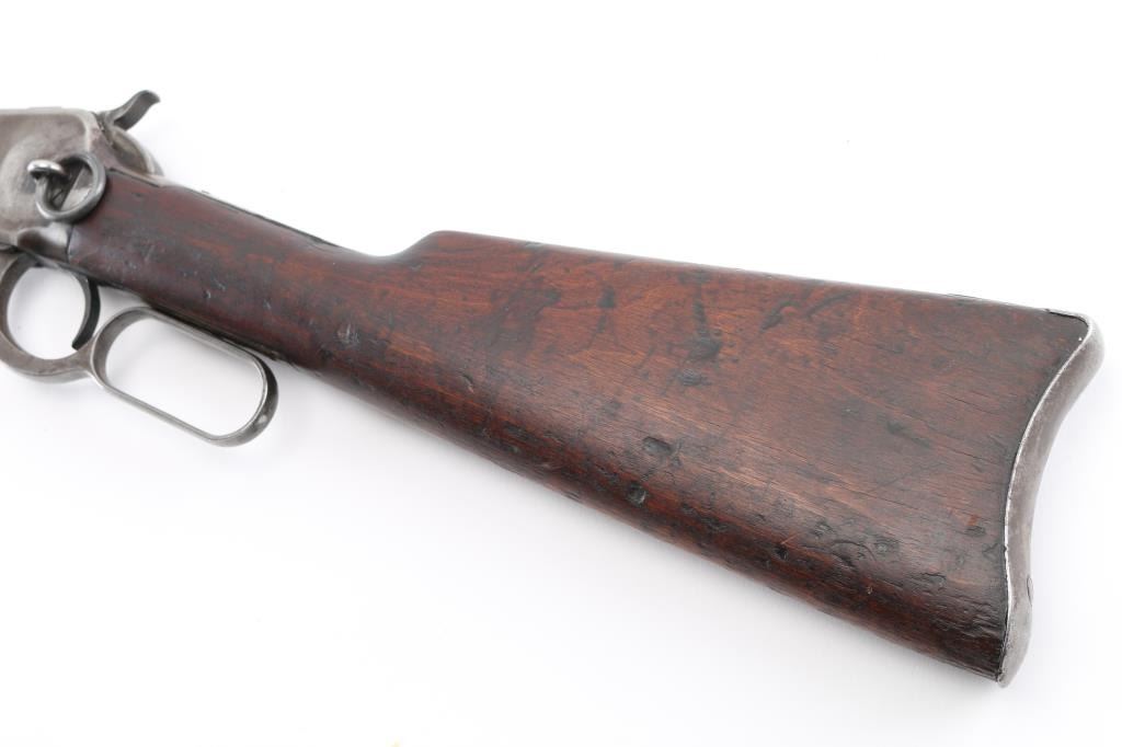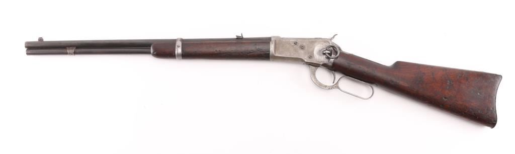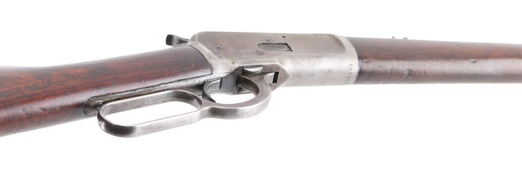 'Saddle Ring Carbine (SRC)' Lever action rifle manufactured circa 1909. Features saddle ring on left side of receiver, 20" round barrel, full length magazine tube, pinned blade/bead front sight, two folding u-notch leaf rear sights, smooth walnut forend & straight wristed buttstock, steel carbine buttplate. Bore is dark/rough with pitting. Barrel & magazine show a dull thin bluing, receiver/lever are in the white with handling wear, friction wear from the ring. Wood is sound condition with many small dents throughout, and a little shrinkage where wood meets the buttplate. Condition is NRA Fair. C&R Firearm.