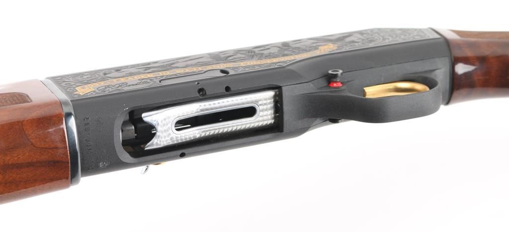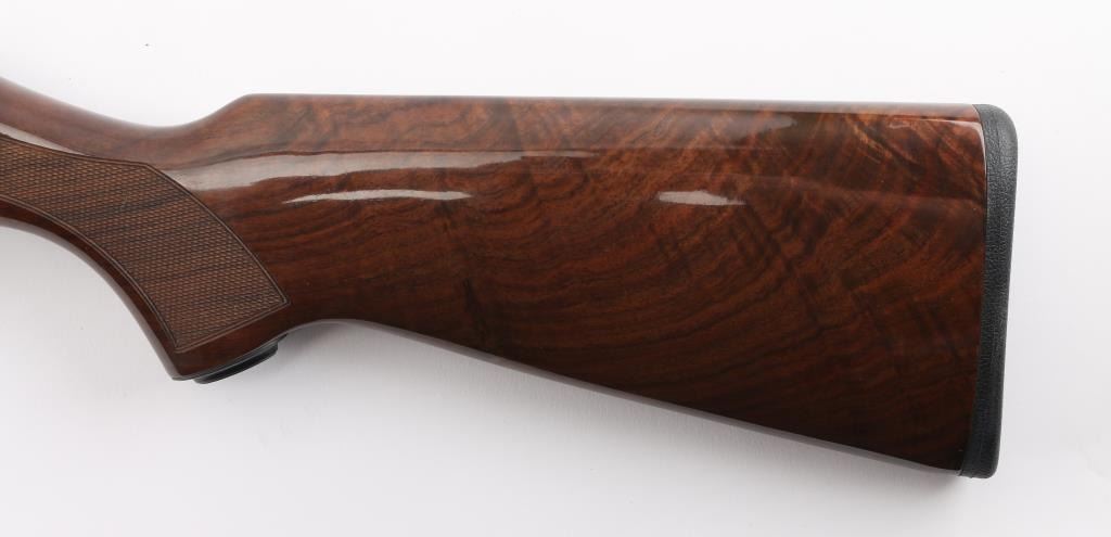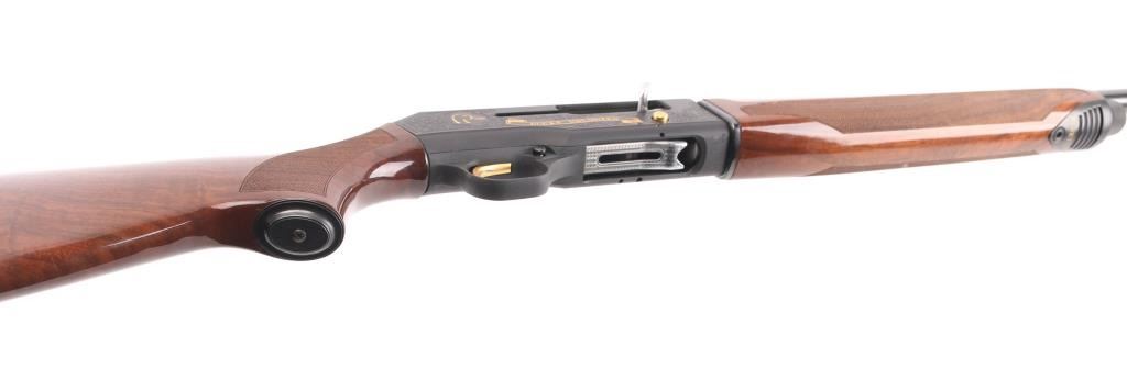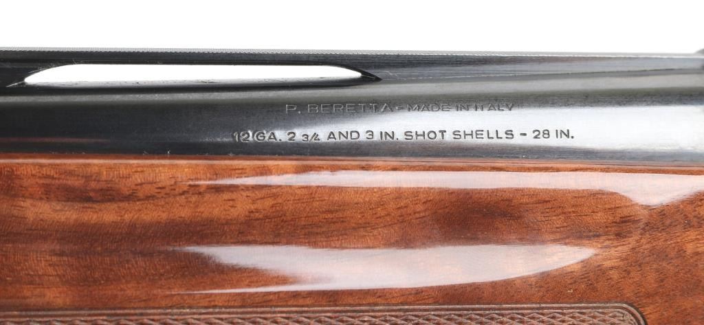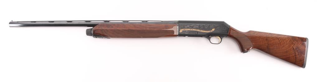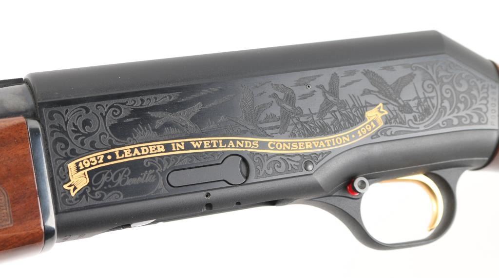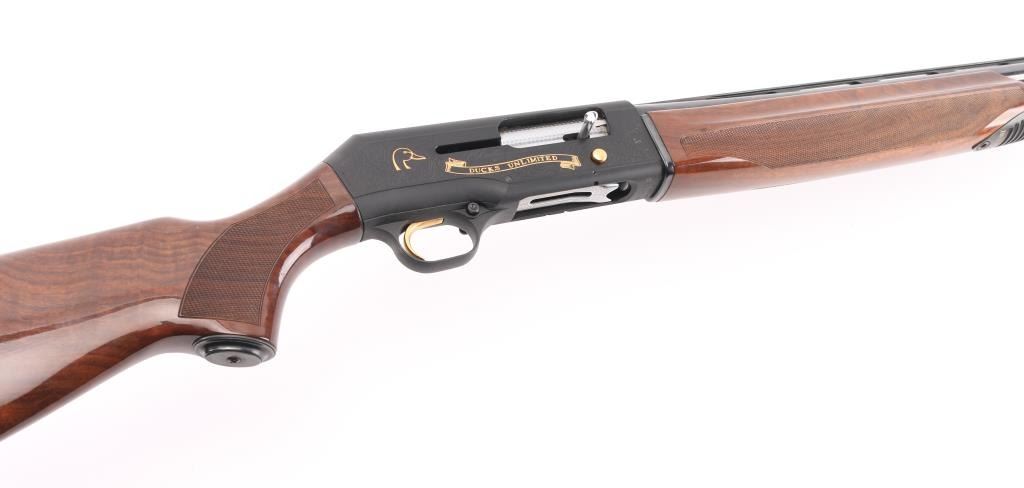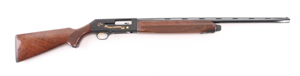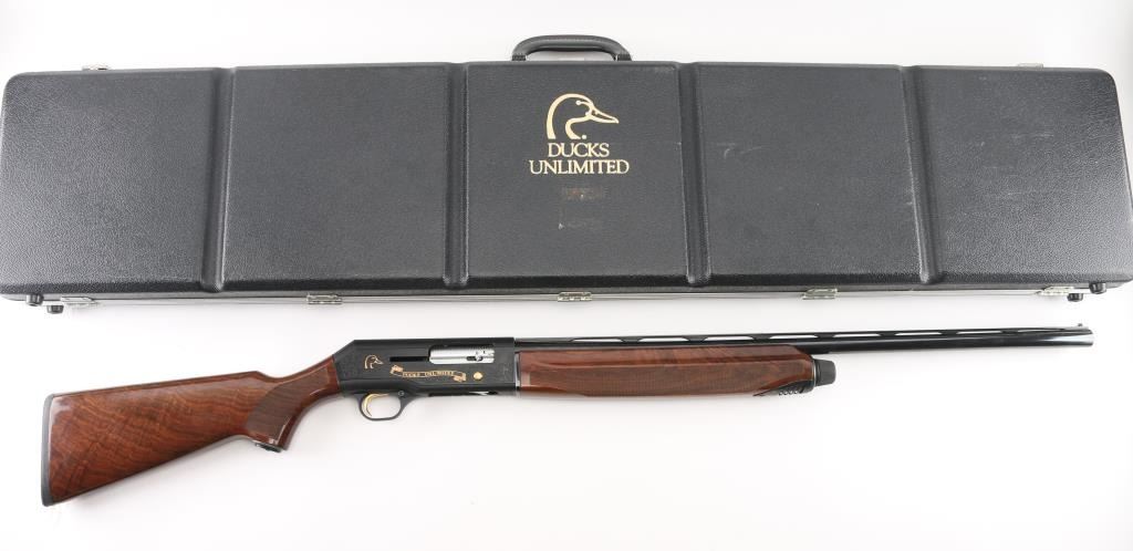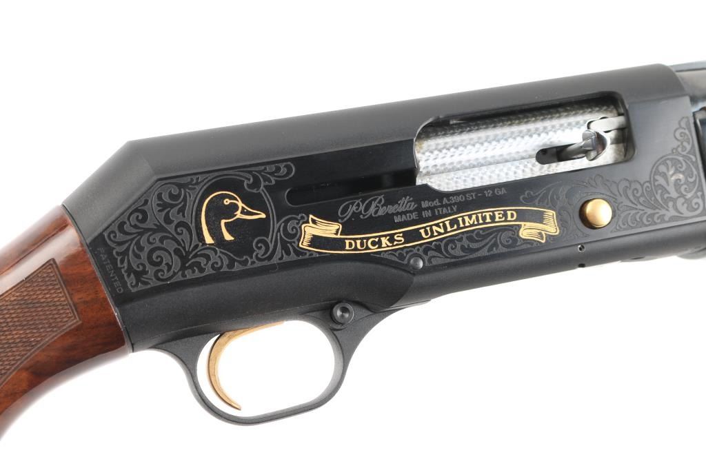 Beretta A390 ST semi auto shotgun in 12 gauge. This particular example is a limited edition Ducks Unlimited offered in 1991 and shortly thereafter. The A390 is considered by many to be one of the best semi auto shotguns ever made. The gun is in very good condition overall. Only light handling marks are exhibited on the gun. The 28 inch barrel has a bright bore, vent rib with white front bead and silver mid bead, and a CYL choke installed. The metalwork is tastefully embellished with gold toned Ducks Unlimited themed details. Stock and forend are fashioned from very nicely grained walnut finished in a semi gloss/gloss manner. The A390 is known to be very forgiving with lighter 7/8 ounce loads all the way to 3 inch magnums. Jeweled bolt, smooth gold tone trigger, push button safety. Almost new condition. Comes with its DU hard case with manual NRA Condition=Excellent. Modern Firearm..