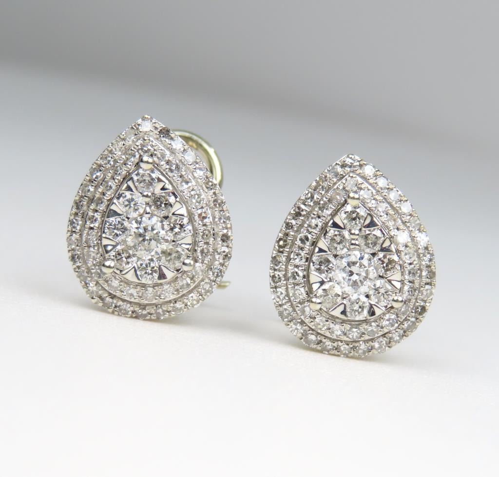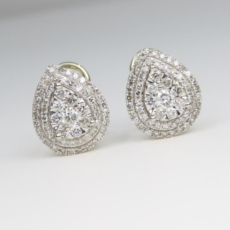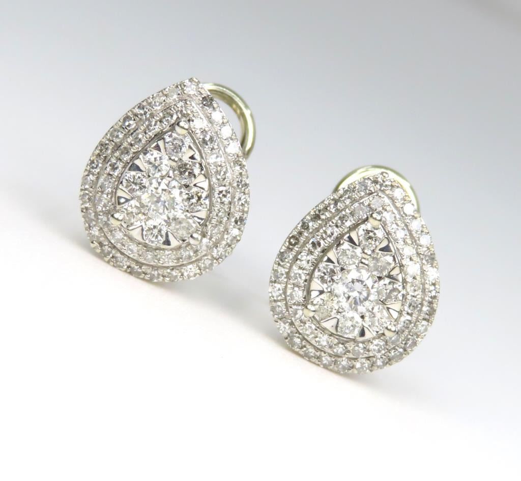 featuring over 130 round Diamonds weighing approx. 1.75- 2.00 carats with G-H colors and VS/SI clarity set in 14 karat white gold pear shape design settings with pierced Omni clip backs. Retail $4,000-$6,000