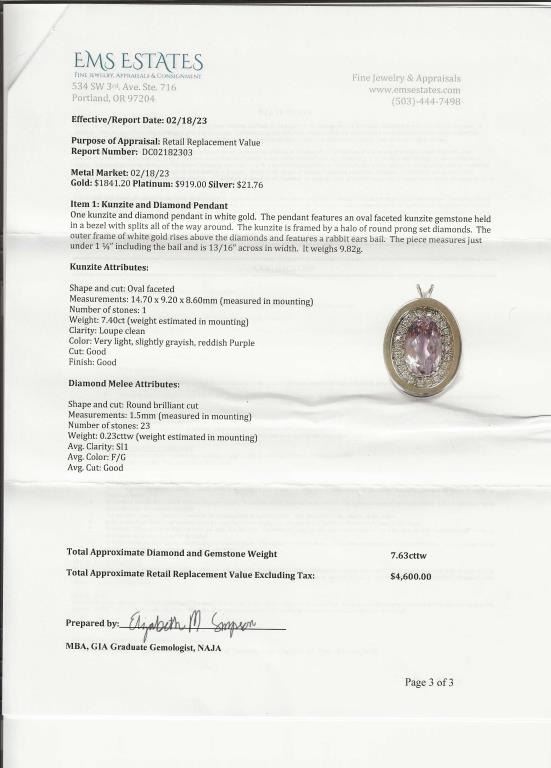 featuring a custom cut oval Kunzite weighing 7.40 carats framed with 23 ‘IDEAL’ cut Diamonds with F-G colors and SI clarity set in a 14 karat white gold custom crafted setting. Full Retail Appraised Value - $4,600.00