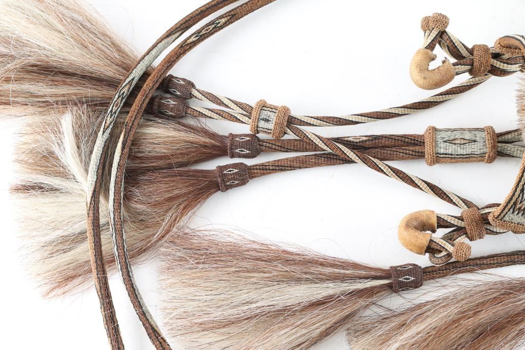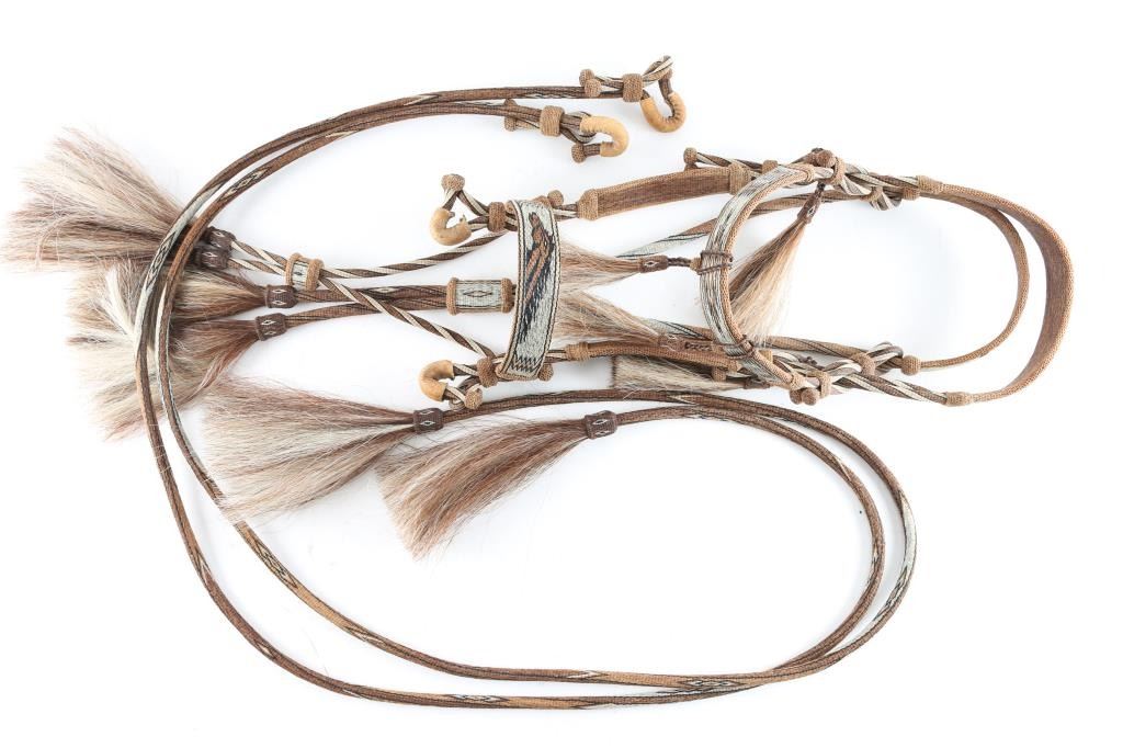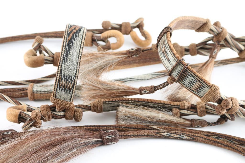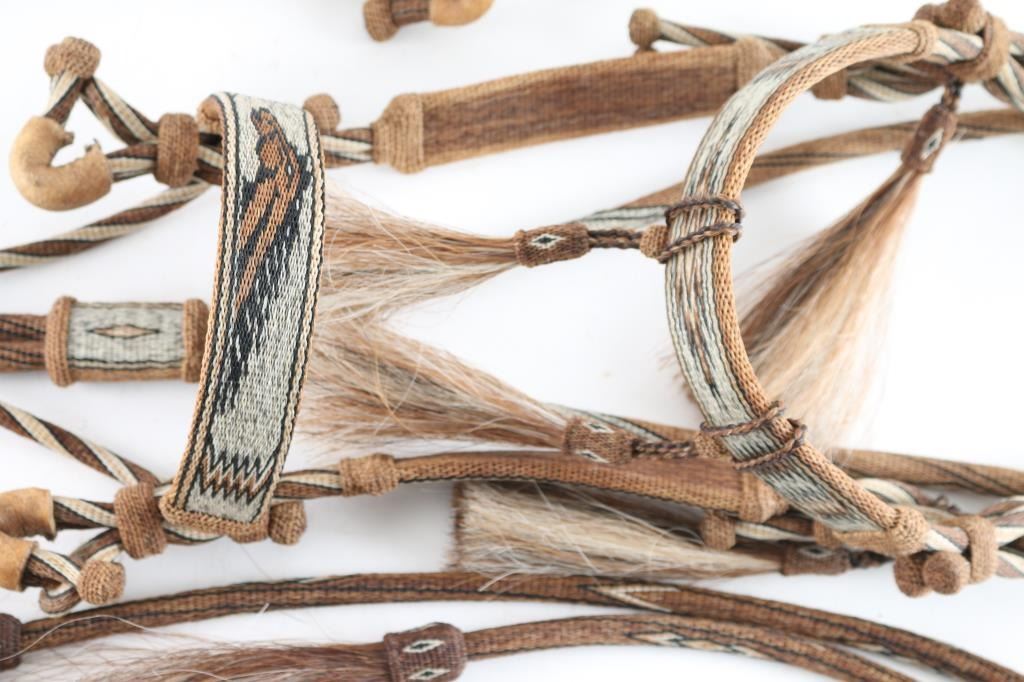 Completely hand made with four colors in black, brown, white, and black with a southwest motif. Includes long reins. In excellent condition. Made in a Montana Prison.