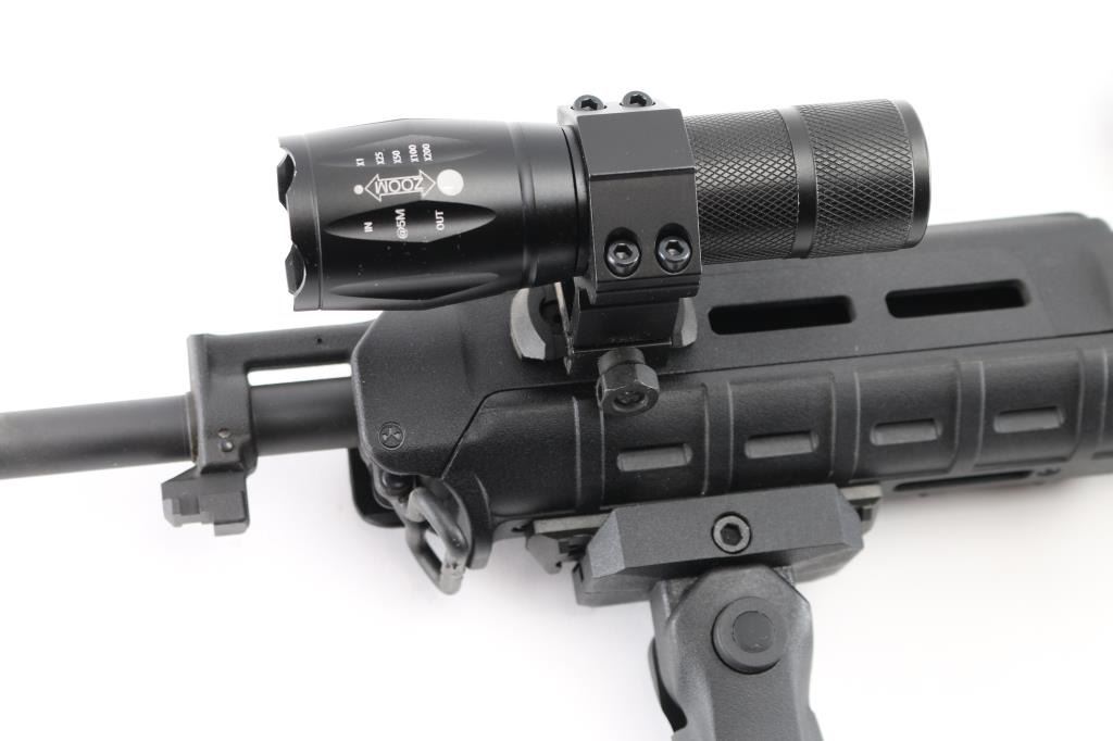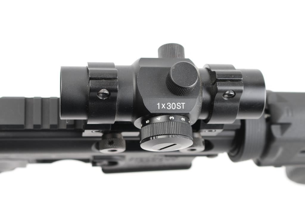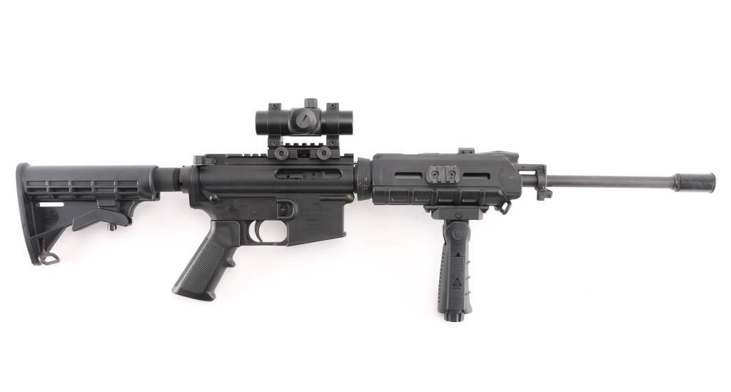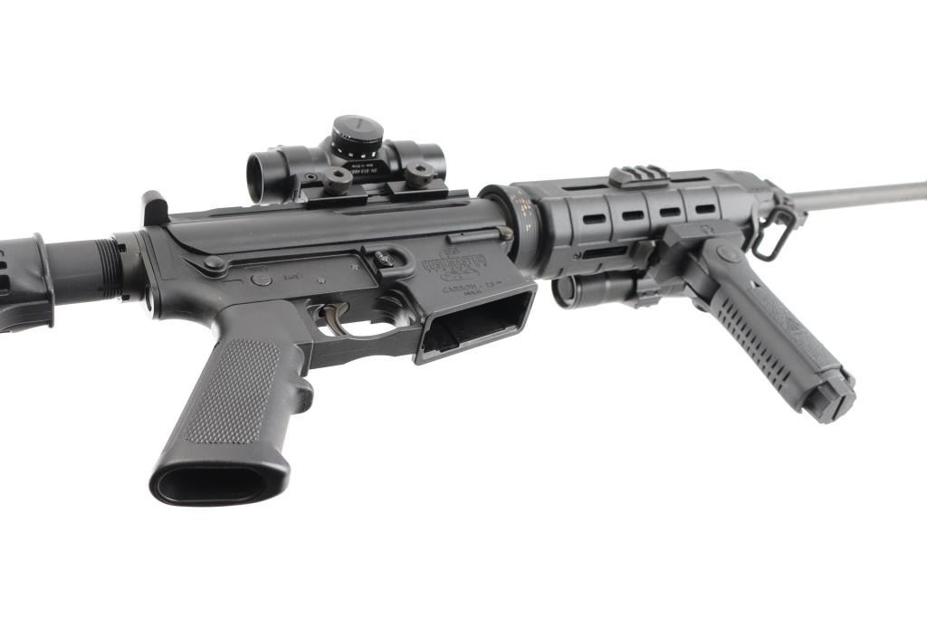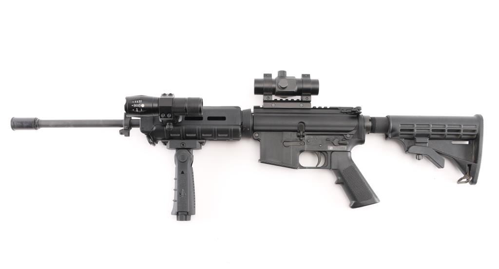 AR-15 type semi-automatic rifle chambered in 5.56 NATO, light weight due to Carbon Fiber upper & lower receivers, matte black finish, Magpul MOE carbine length forearm, 6 position collapsing stock, 16" pencil barrel with A2 Birdcage flash hider, 1:9 twist, bayonet lug, aluminum Picatinny rail section top of upper receiver with additional riser mount, standard AR pistol grip. trigger and BCG. Comes with mounted red dot sight, UTG 5 position front grip and led flashlight. No magazine. Bore is excellent but a little dirty. Retains 98% of finish with some scrapes on the left and right side of handguard ring. Condition is NRA Excellent. *** Modern Firearm ***
