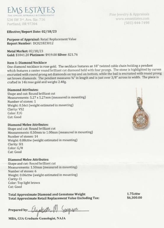 featuring an ‘IDEAL’ cut Diamond weighing 0.56 carats with F-G color and VS clarity accented with 20 pave set White and Champagne Diamonds set in a graceful 14 karat Rose gold setting. Full Retail Appraised Value - $6,300.00