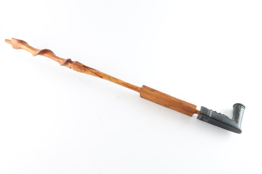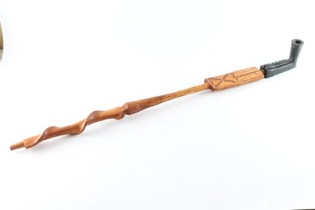 with Osage bird stem. Overall length is approx 36", in very good condition. Long stem features intricate carved decorations, and fine spiral pattern fluting.