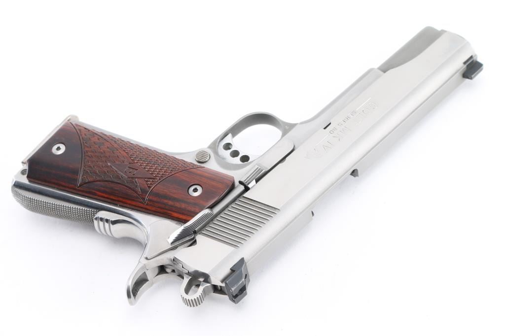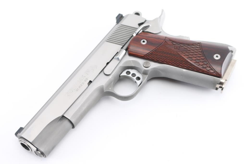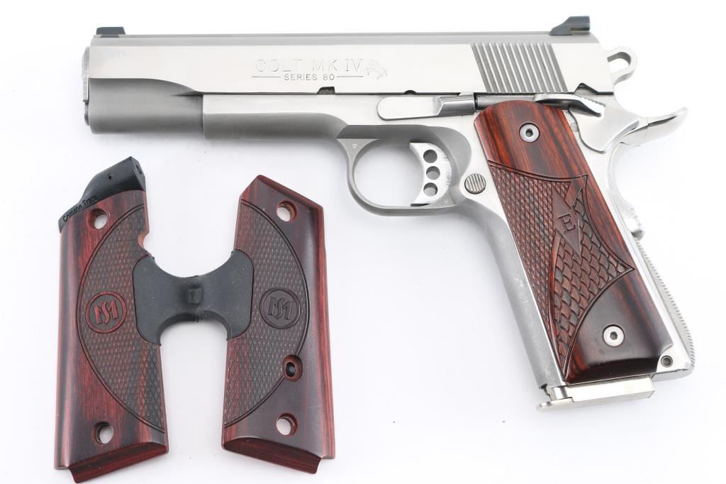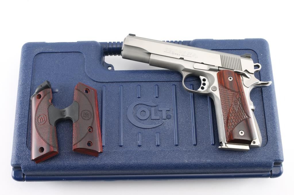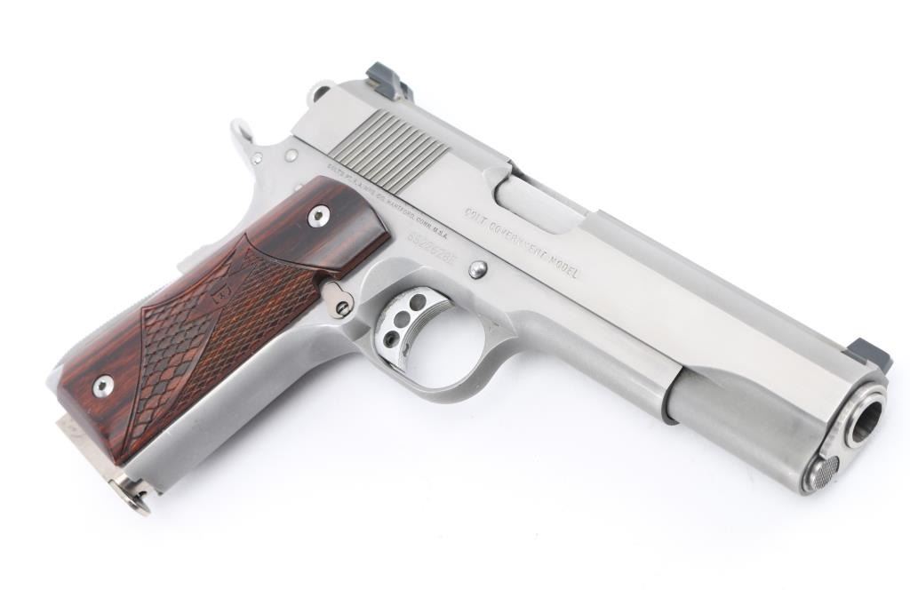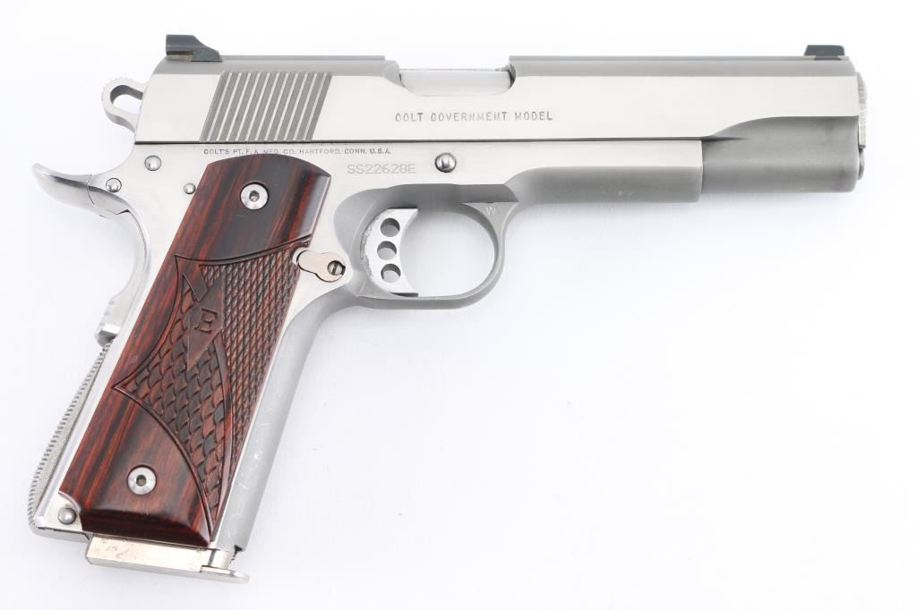 SN: SS22628E 'MK IV/Series 80' 1911A1 pattern single action semi-automatic pistol manufactured circa 1997. Features stainless steel construction, matte finished metal with polished flats, 5" barrel, dot blade front sight, rear sight in dovetail, serrated adjustable, lightweight trigger, serrated rowel hammer, thumb safety on the left side of the frame, upswept beavertail grip safety, push button magazine release, knurled arched mainspring housing, checkered wood grips with 'E' in diamond. Bore is very good condition. External surfaces are very good to excellent condition. Action is smooth and the grips are excellent. Includes (1) magazine. Comes in Colt factory hard case with manual, & a set of checkered rosewood Crimson Trace laser grips with extra batteries, that fit this pistol. These grips alone sell for over $300.00. Condition is NRA Excellent. Modern firearm.