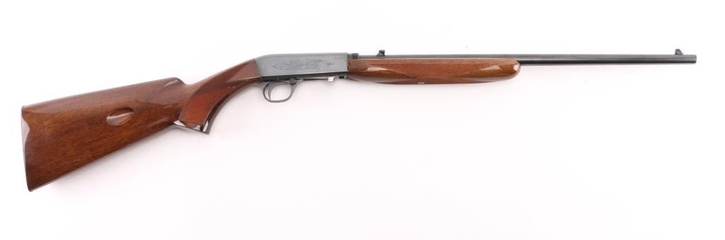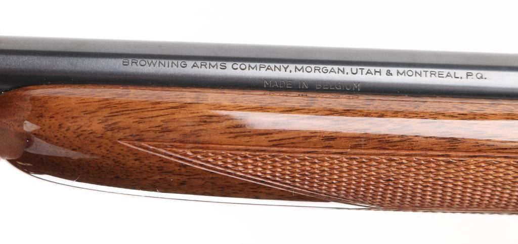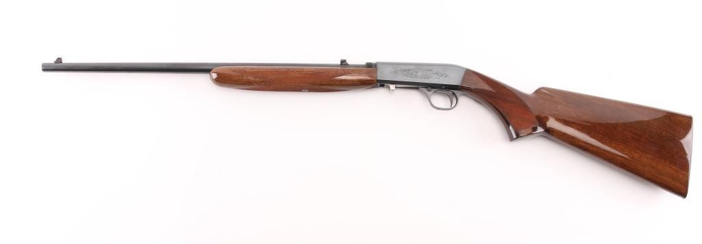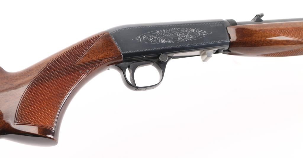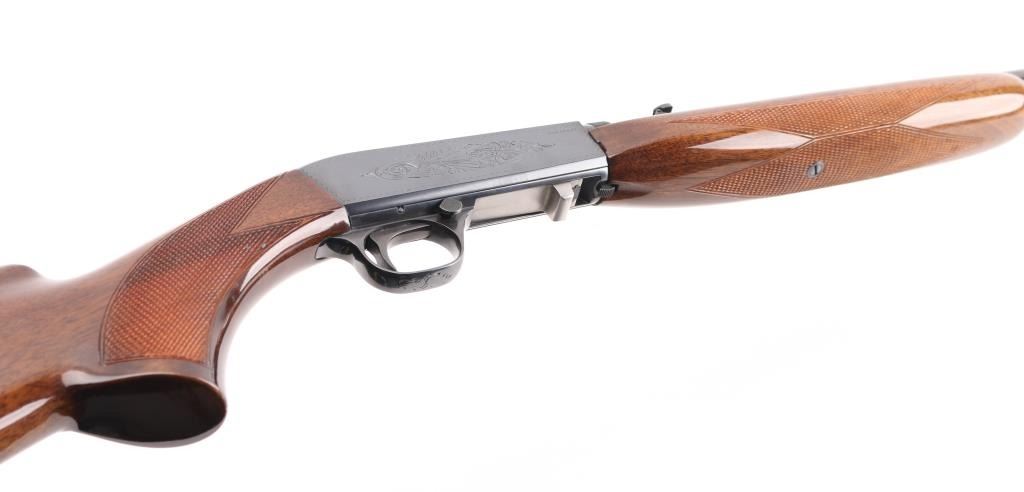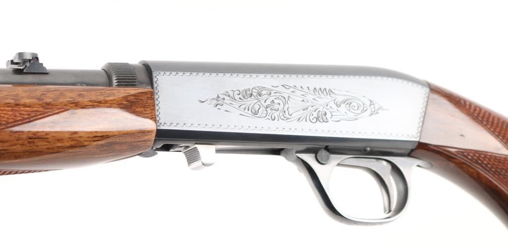 "Grade I" Semiautomatic rifle made in Belgium for Browning Arms Co, Morgan UT. Features take-down latch, blued finish, checkered walnut butt & forend, 19" barrel, blade/brass bead front sight, adjustable sporting rear sight, magazine tube in butt, serrated steel buttplate, manual safety. Receiver is engraved with limited coverage of floral scrolls and edge patterns. Bore is excellent/bright. Rifle is like new, blue and wood are excellent. Condition is NRA Excellent. Modern Firearm.