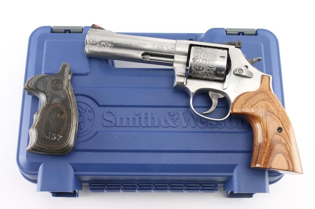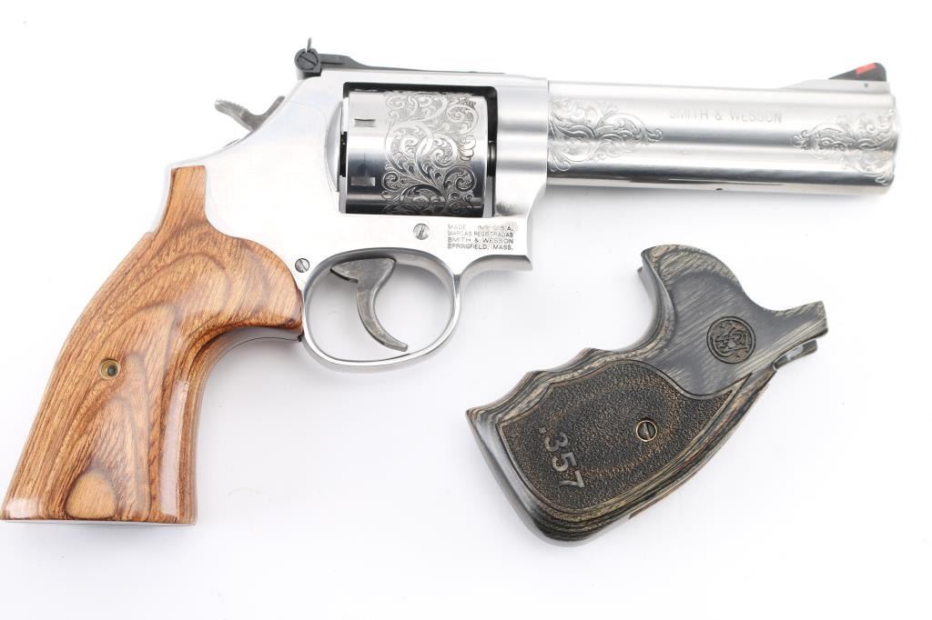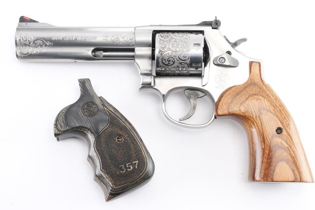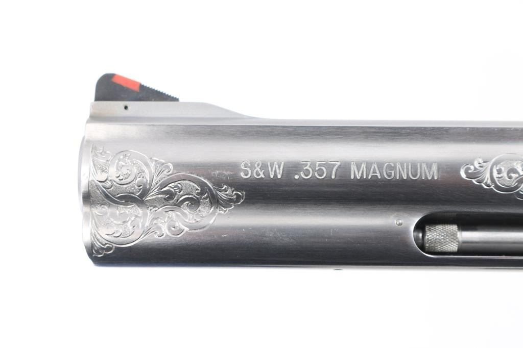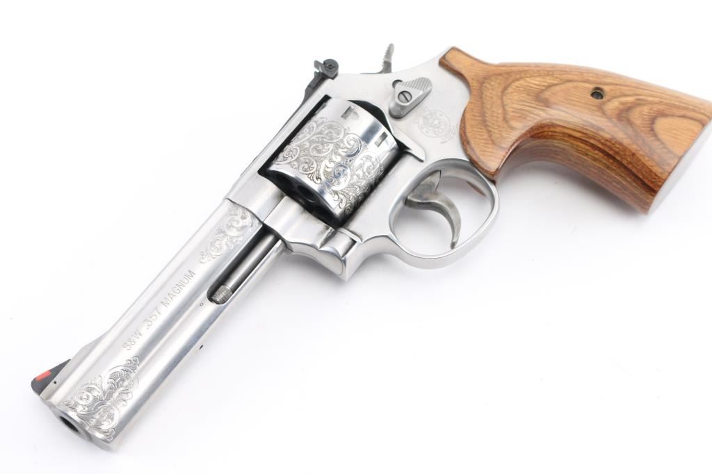 SN: DJV3935. This revolver has been floral scroll engraved by late master engraver Rachel Wells of Prescott. AZ, She is a member Firearms Engravers Guild of America. Beautiful full cylinder, and partial barrel engraving. Signed "Rachel Wells, Master Engraver" under left grip. American made L-frame revolver, DA/SA, stainless steel frame, barrel and cylinder, 7-shot capacity, approximately 5" barrel, bore and cylinders are bright, full-length ejector rod housing, red insert in a serrated ramp front sight, adjustable white outline open notch rear sight, checkered hammer spur and cylinder release, smooth trigger, smooth walnut target grips. This revolver is equipped with a hammer lock and comes with two safety keys. Includes the original plastic case, instruction manual, the S&W factory laminate wood grips with S&W monograms, and ".357" and a cable lock with two keys. Bore is pristine. Grips are excellent, metal finish is near excellent with some minor scratches. NRA Condition-Near Excellent. Modern Firearm.