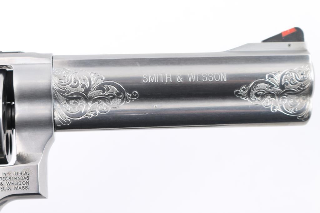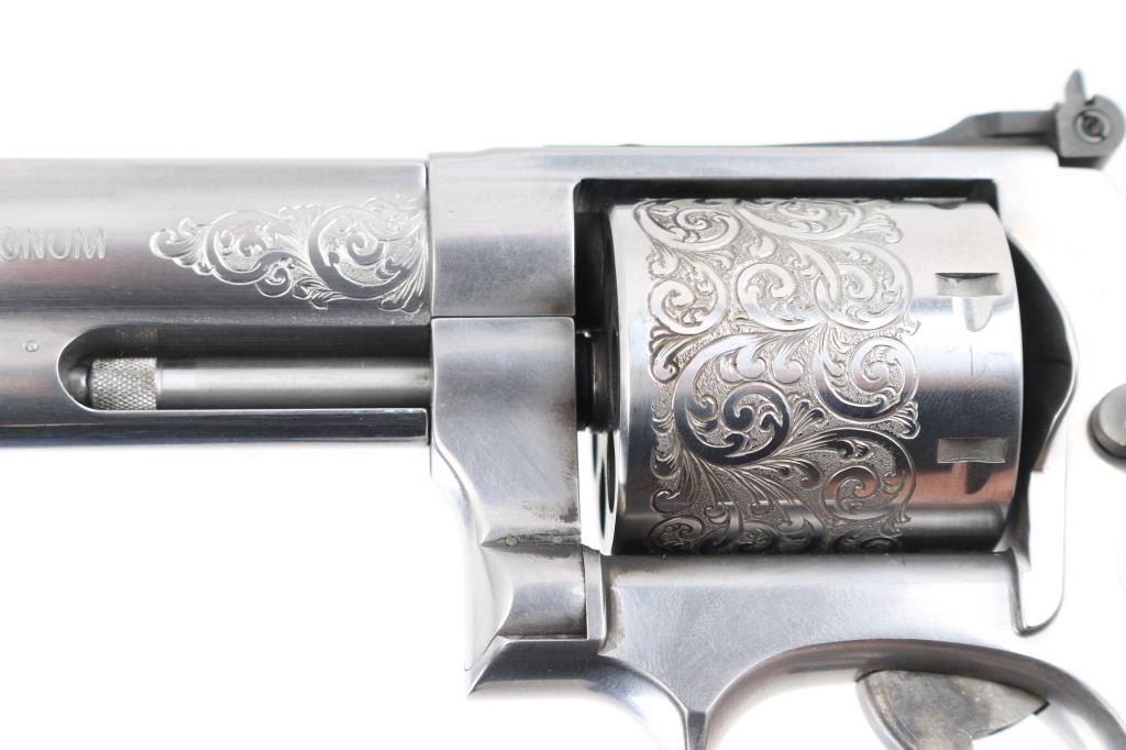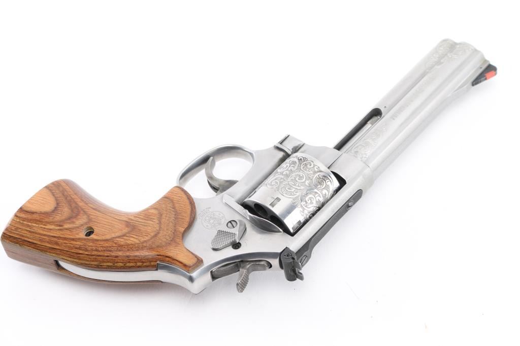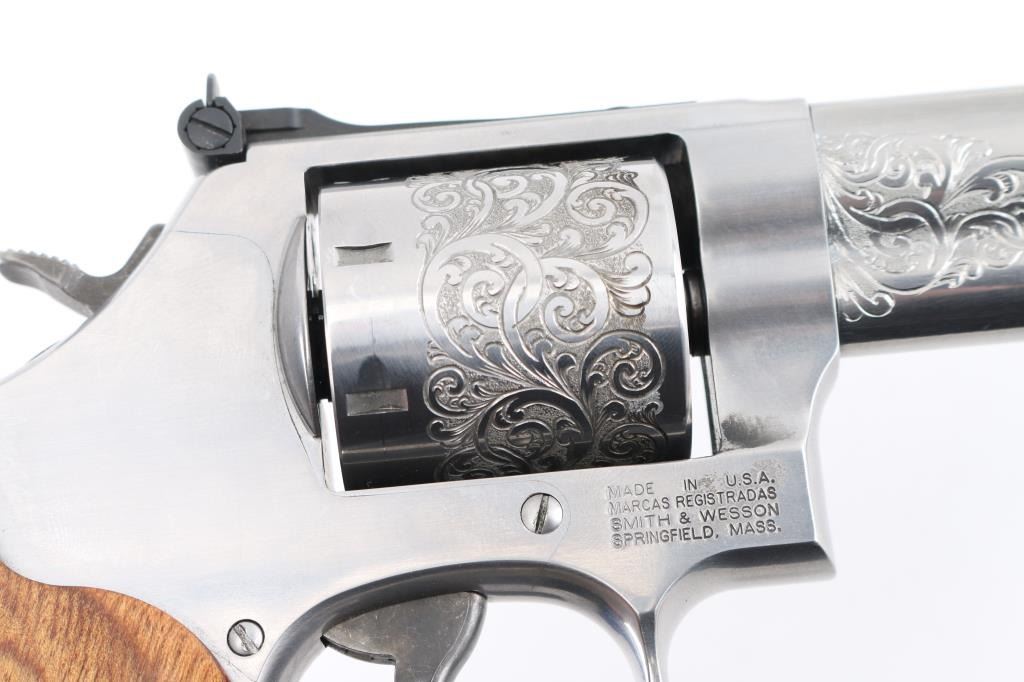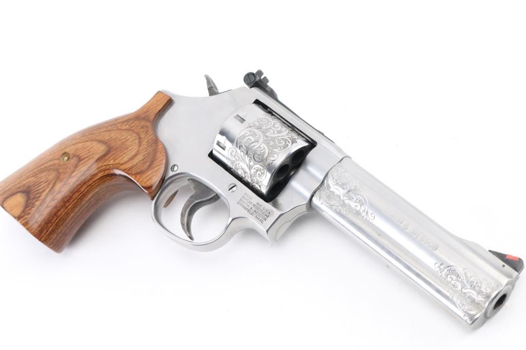 SN: DJV3935. This revolver has been floral scroll engraved by late master engraver Rachel Wells of Prescott. AZ, She is a member Firearms Engravers Guild of America. Beautiful full cylinder, and partial barrel engraving. Signed "Rachel Wells, Master Engraver" under left grip. American made L-frame revolver, DA/SA, stainless steel frame, barrel and cylinder, 7-shot capacity, approximately 5" barrel, bore and cylinders are bright, full-length ejector rod housing, red insert in a serrated ramp front sight, adjustable white outline open notch rear sight, checkered hammer spur and cylinder release, smooth trigger, smooth walnut target grips. This revolver is equipped with a hammer lock and comes with two safety keys. Includes the original plastic case, instruction manual, the S&W factory laminate wood grips with S&W monograms, and ".357" and a cable lock with two keys. Bore is pristine. Grips are excellent, metal finish is near excellent with some minor scratches. NRA Condition-Near Excellent. Modern Firearm.