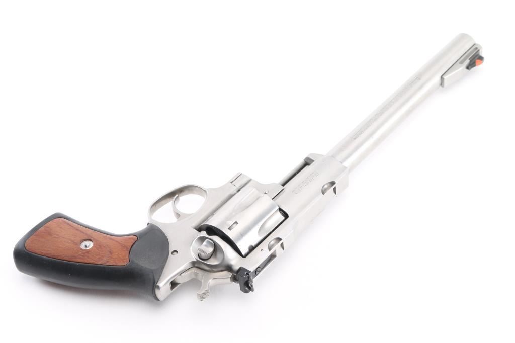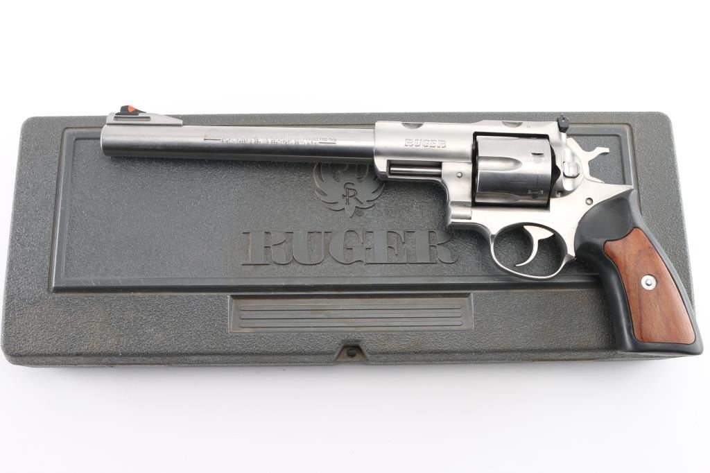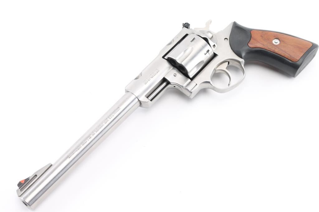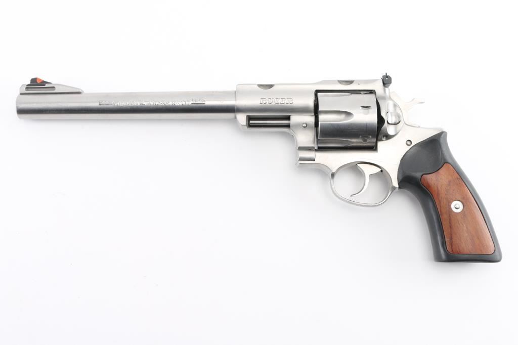 Large frame stainless steel double-action revolver chambered in .44 Magnum. Manufactured 1999. Features a stainless finish, 9.5" barrel with serrated ramp front sight and orange insert, adjustable rear sight with white square notch, shrouded ejector rod, fluted six shot cylinder, smooth trigger, checkered hammer spur, transfer bar safety, extended frame with integral scope base cuts in the top strap, and Ruger one piece black rubber grips with wood inserts. Bore is excellent/bright. Bore and action are in excellent condition. Comes with a Ruger gray plastic factory case. Condition is NRA Excellent. Modern Firearm.