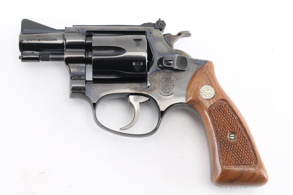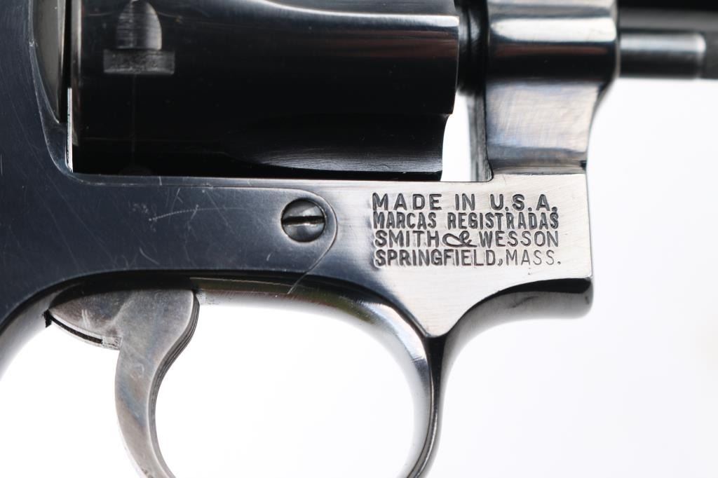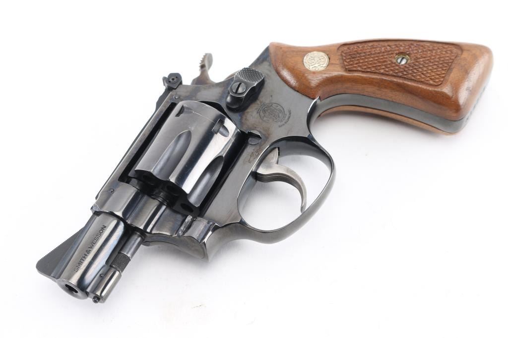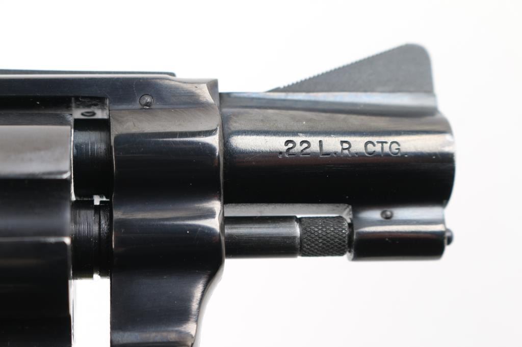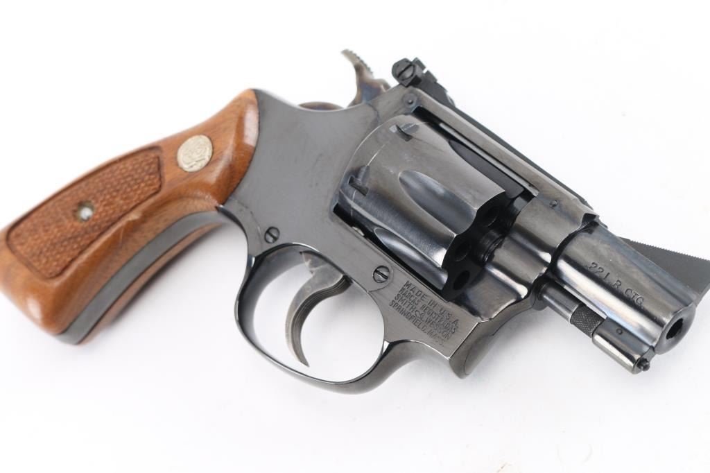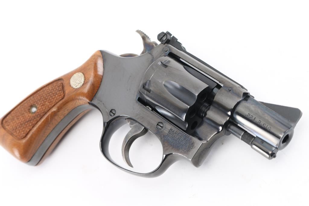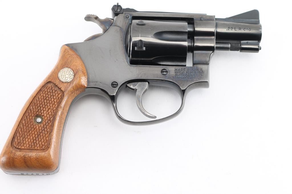 "Pinned & Recessed' double action rimfire revolver circa 1969-71. Features blued finish, checkered wood "magna" grips with S&W medallions, 2" barrel, serrated ramp front and adjustable rear sights, square butt, "J" frame, 6 shot fluted cylinder. Overall condition is excellent with smooth operation and tight lock-up, 95% coverage of deep blued finish with some edge losses & a few minor scratches, very good bore. Grips are very good condition. Condition is NRA Excellent *** C&R Firearm ***